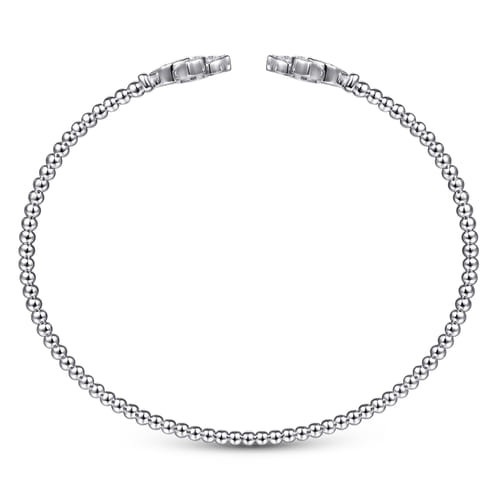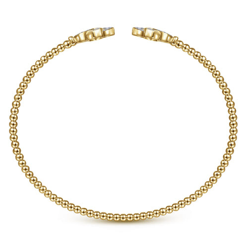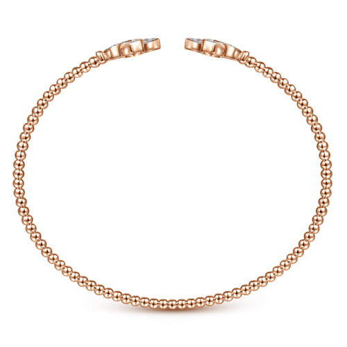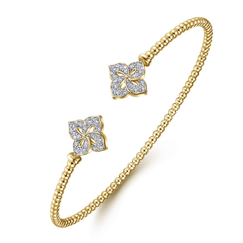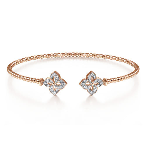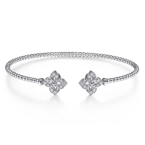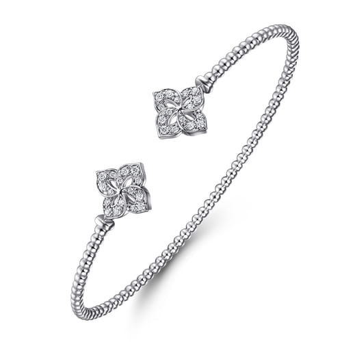 A fresh interpretation of classic cuff styling, this bracelet features an elegant split silhouette accented by sparkling diamond flower endcaps. Textural bead detailing along the open band adds subtle depth and visual interest, while the floral diamond accents bring an organic touch of brilliance. Designed to stand out on its own or layered with other favorites, this piece offers effortless versatility and timeless sophistication for every occasion.