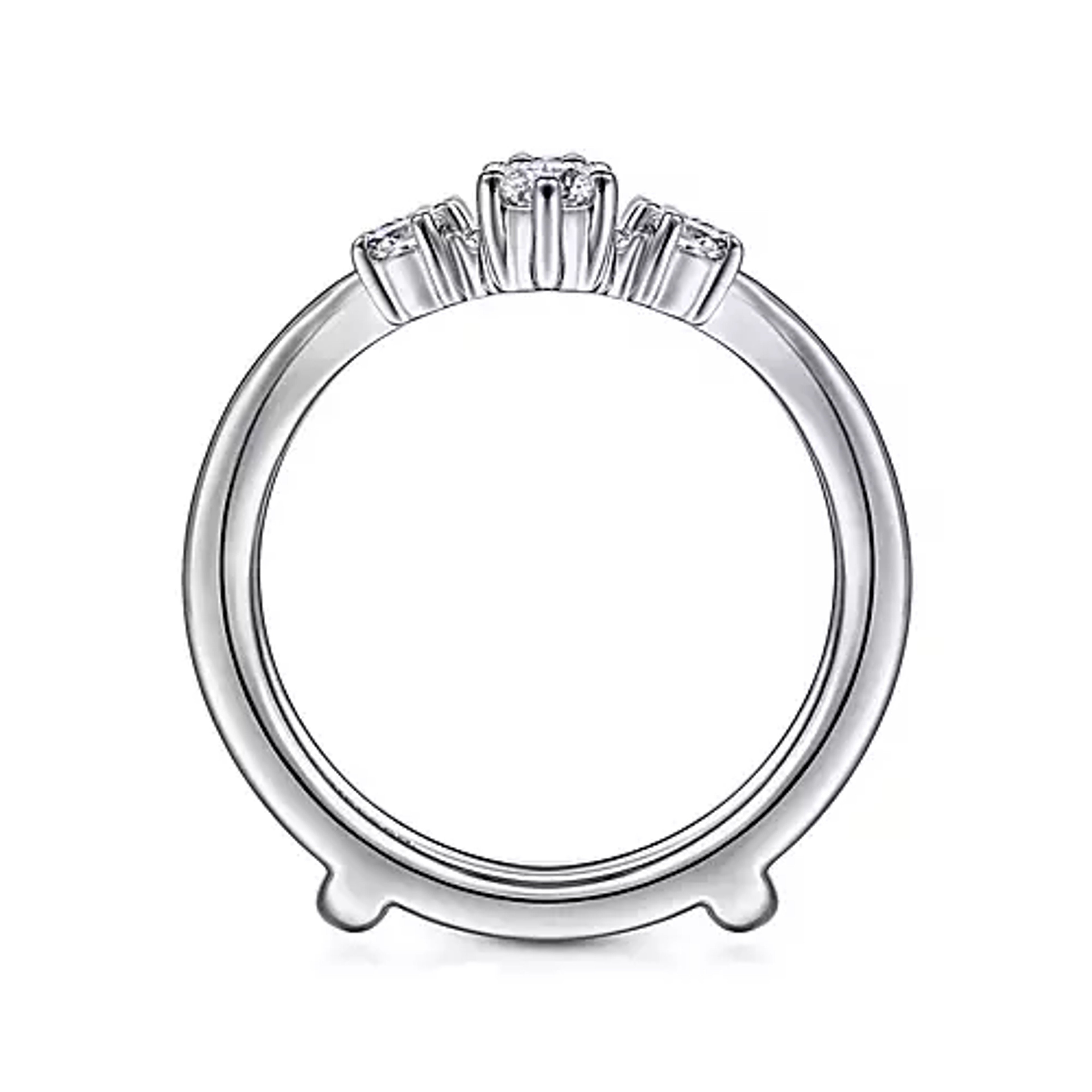 Nestle the sparkling center stone of your existing engagement ring between two gently curving strands of brilliant round diamonds. Set on tapered ribbons of polished 14k gold, this diamond ring enhancer offers a truly elegant upgrade.