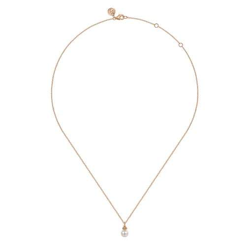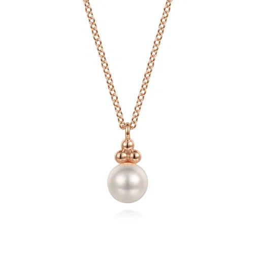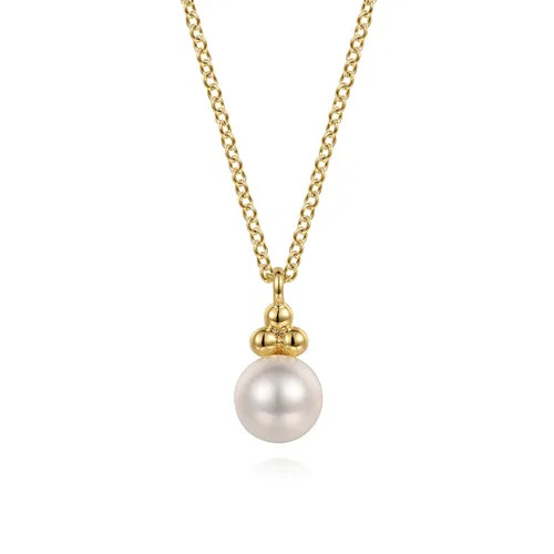 This 14K yellow gold and pearl drop necklace offers a more subtle way to sport June's precious birthstone. A single luminous pearl is suspended from a delicate gold chain and accented by a trio of gleaming golden beads. Ideal for layering with other chains.
