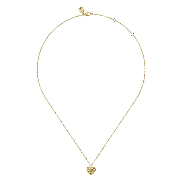 Capture her heart with this romantic and stylish pendant necklace. Diamond cut facets radiate out from a central 0.01ct diamond, while signature Bujukan beading frames the perimeter. This 14K yellow heart necklace comes complete with an adjustable chain.