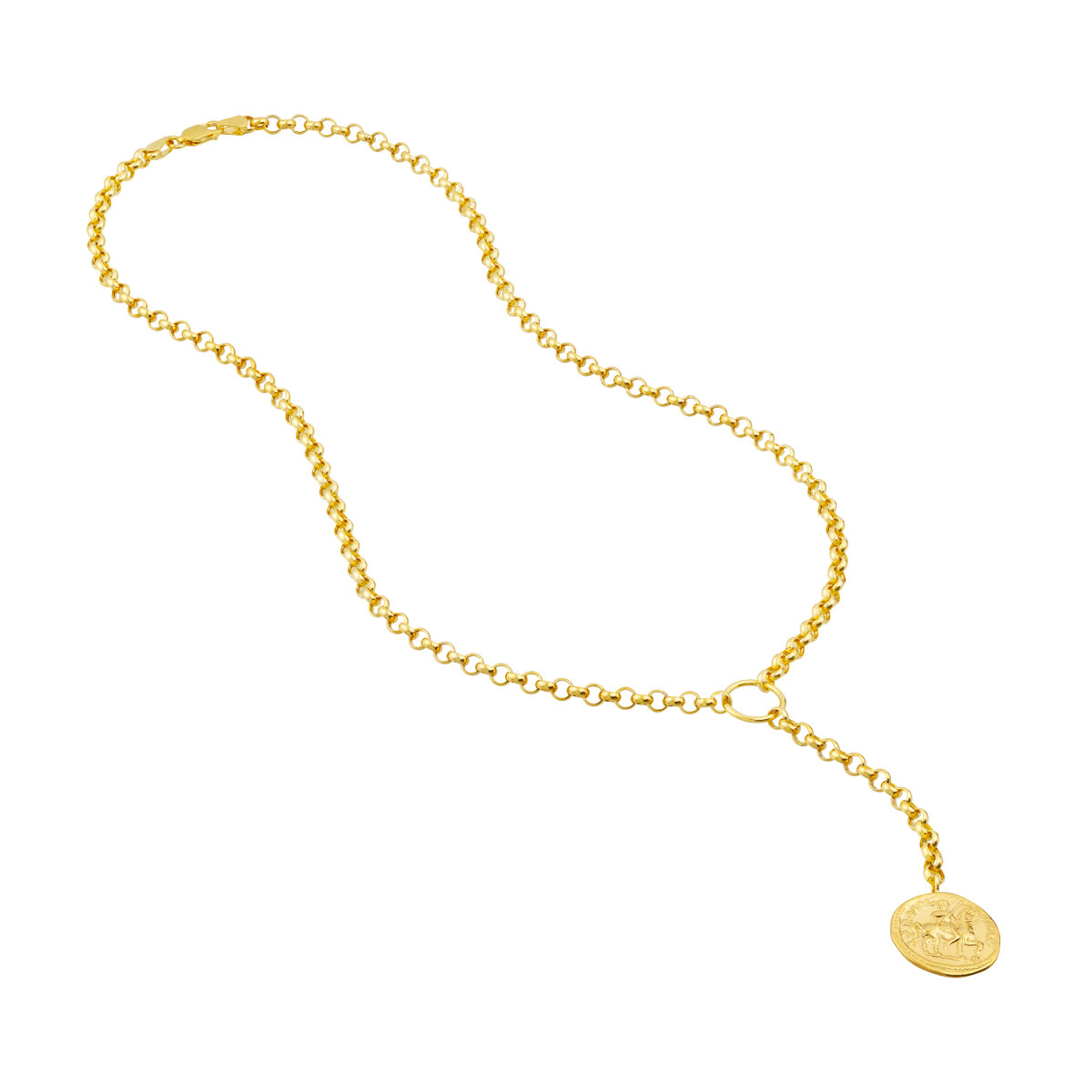 This piece expertly combines vintage and modern elements. The lariat necklace features an ancient coin dangling on split rolo chain.