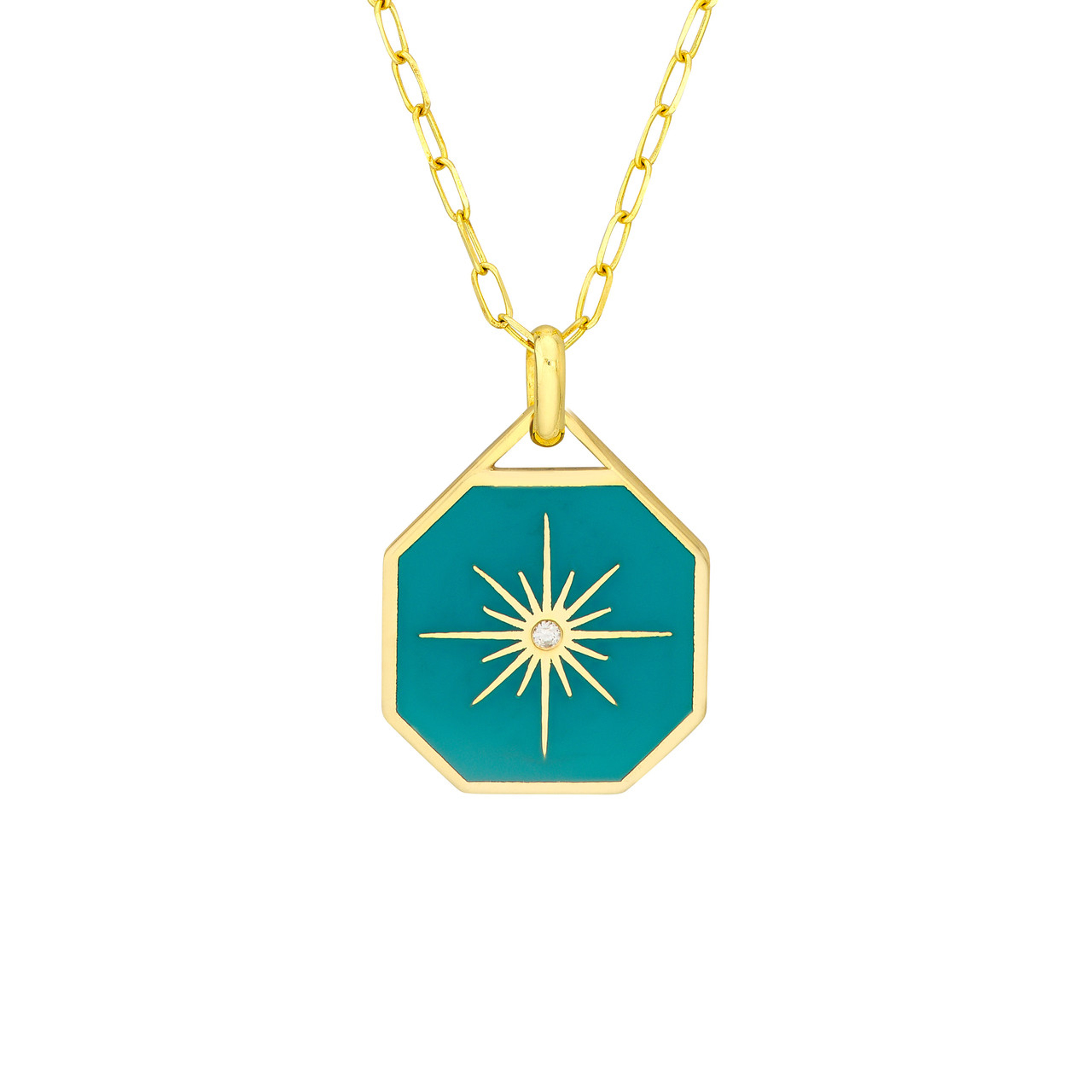 A captivating piece that combines celestial beauty with vibrant color. The teal enamel serves as the backdrop for a beautifully crafted star, symbolizing dreams, guidance, and inspiration.
