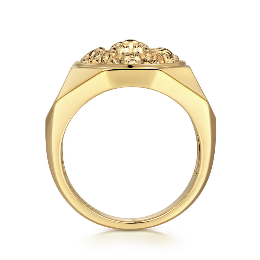 For the man whose style can't be tamed. This wide band ring is crafted from bright 14K yellow gold and adorned with a lion's head. Symbolizing power and protection, this fierce medallion is destined to be your signature piece.