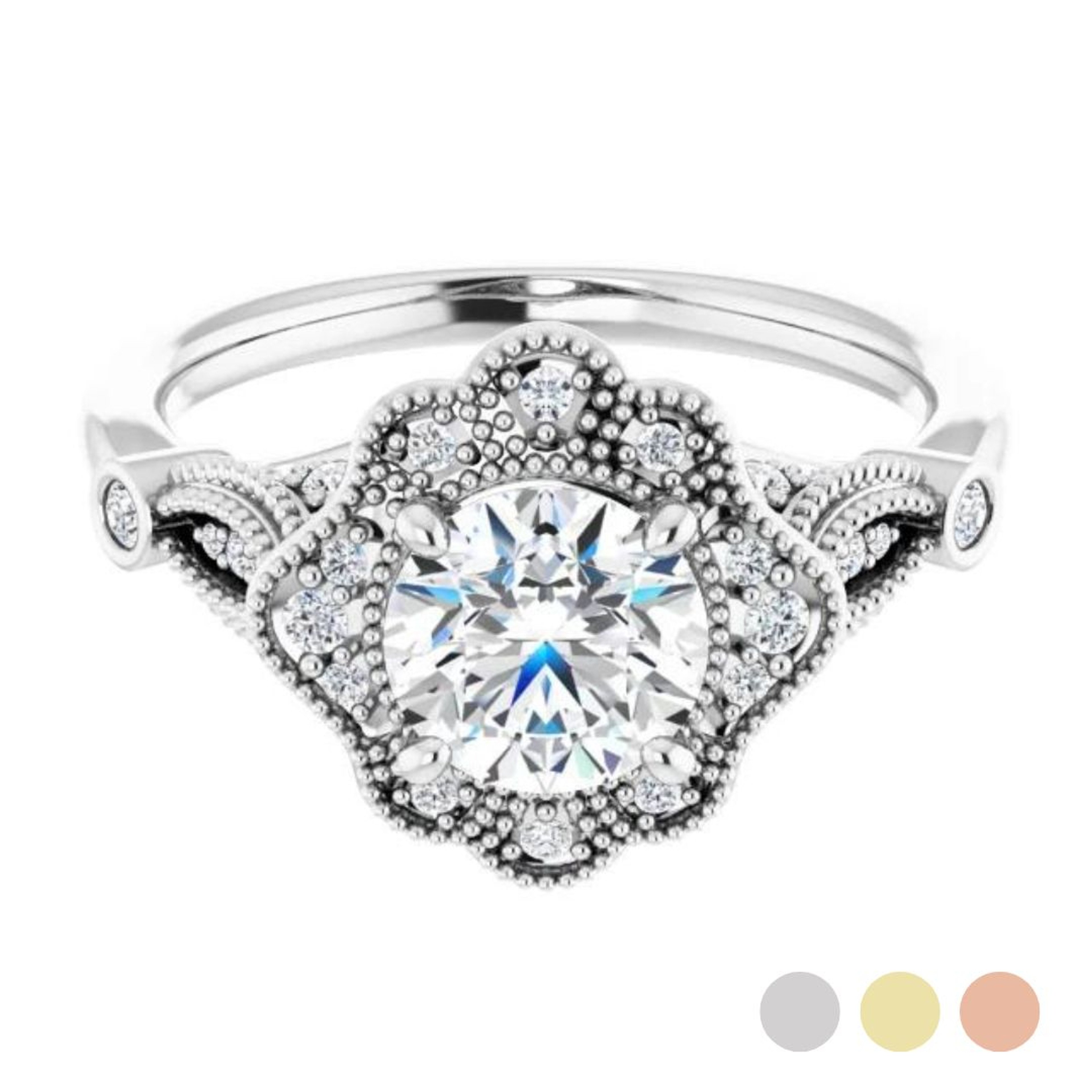 Setting only (center stone sold separately). Image shows a 1 carat round center stone.