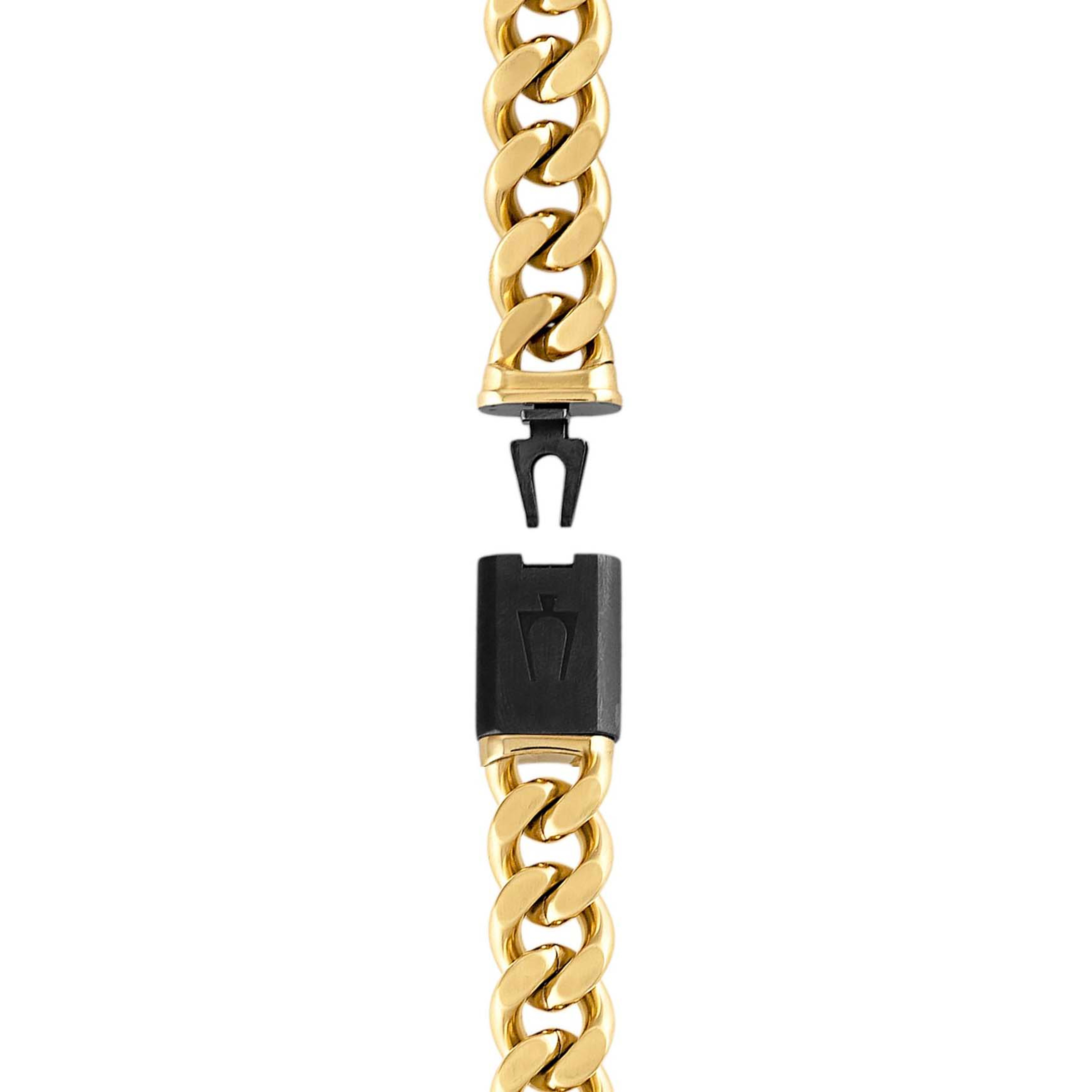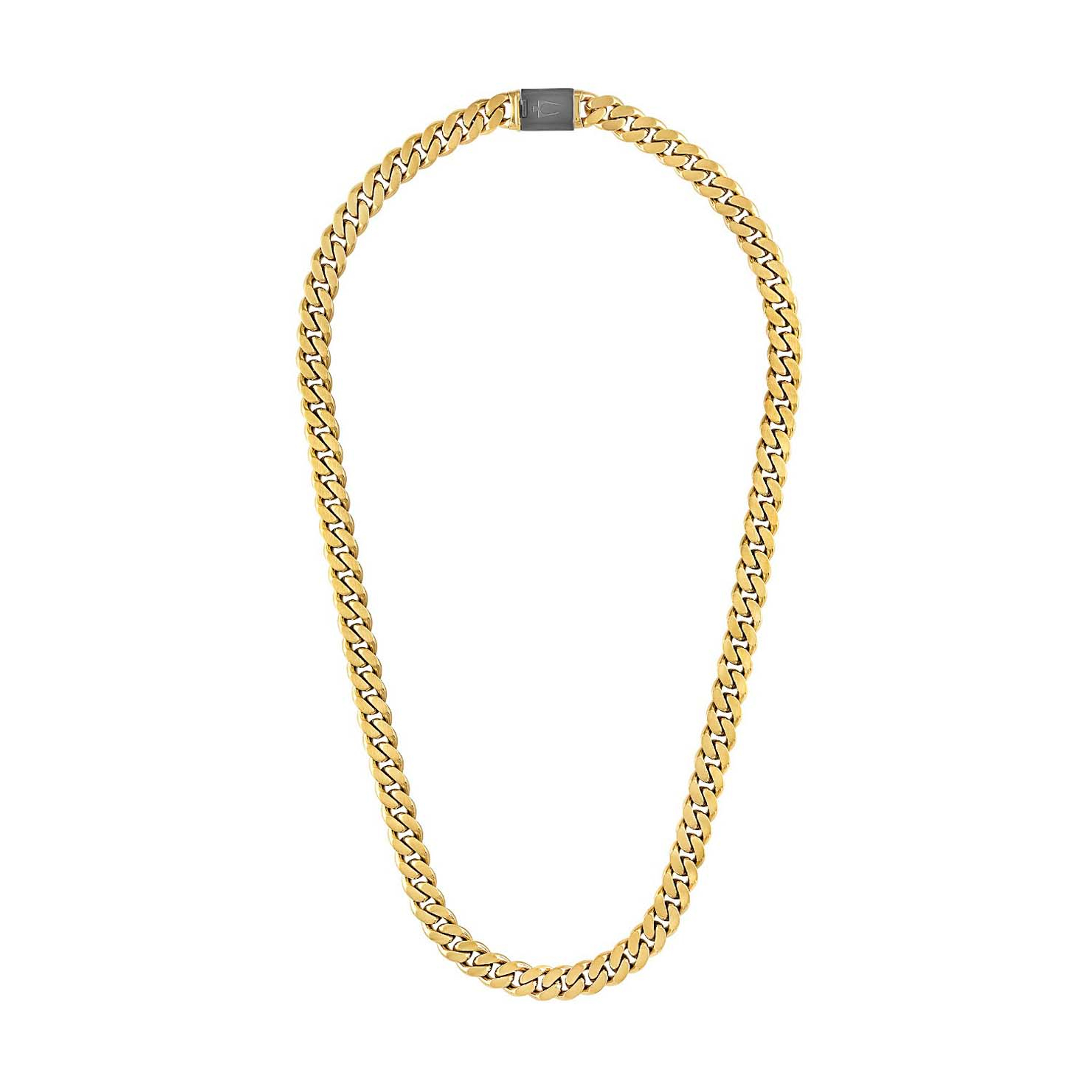 A classic Bulova curb chain of dual-surfaced links updated with an exciting colorful twist. Distinctly bold 24" necklace made of 10MM brushed stainless steel in a striking gold-tone color combination. Custom-designed clasp with tongue in the shape of the Bulova signature tuning fork is subtly branded with our iconic logo.