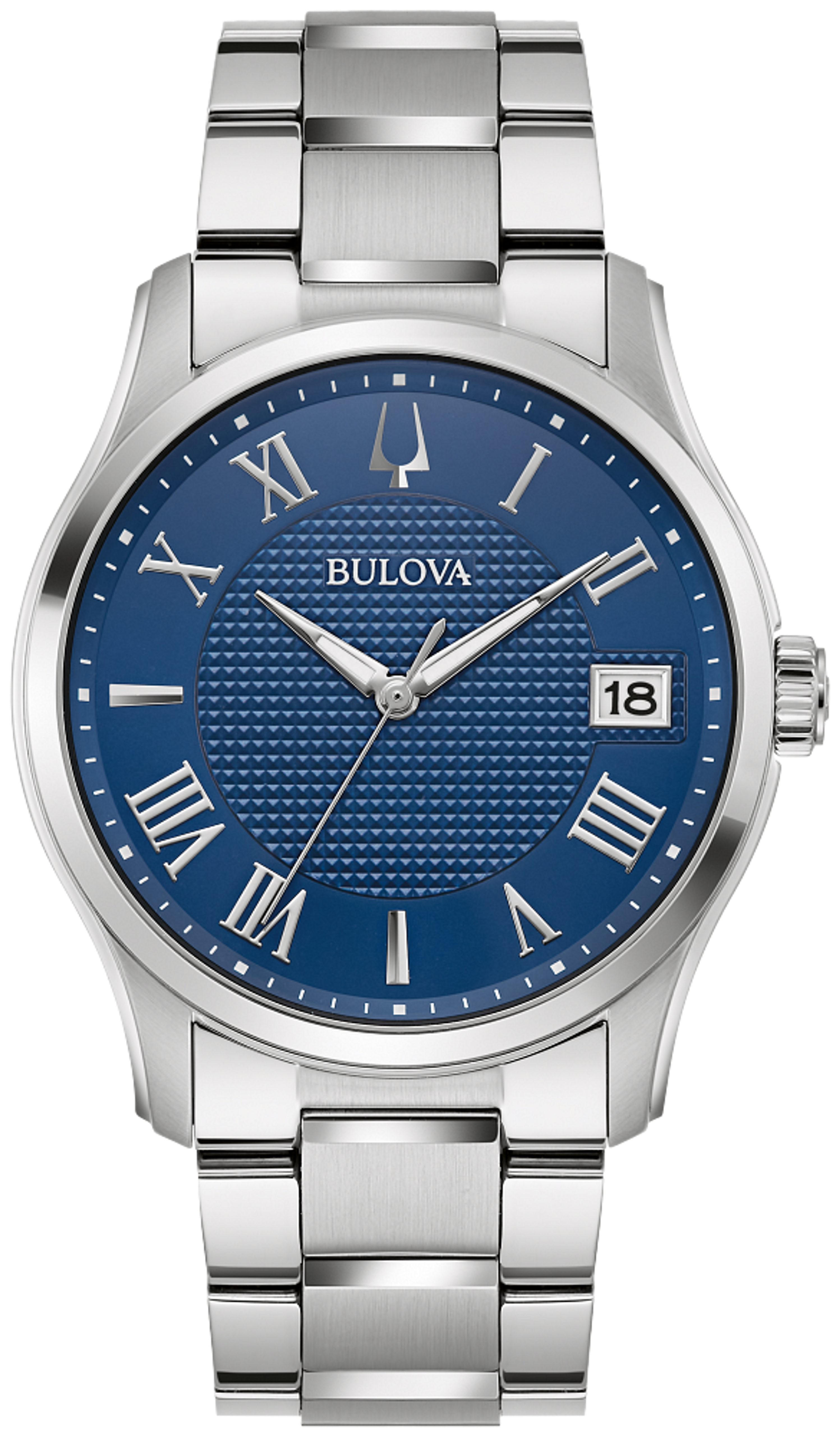 Versatile elegance is evident in the many features and details of the Wilton 3 hand quartz timepiece from the Bulova Classic collection. This watch features a brushed gold- and silver-tone stainless steel case set with a striking blue 3-hand dial with a clous de paris intricately textured detail, calendar, polished Roman numeral markers, and a domed crystal. The silver-tone stainless steel bracelet features a deployant buckle with pushers for easy release. Get back to basics in style with the classic Wilton from Bulova.