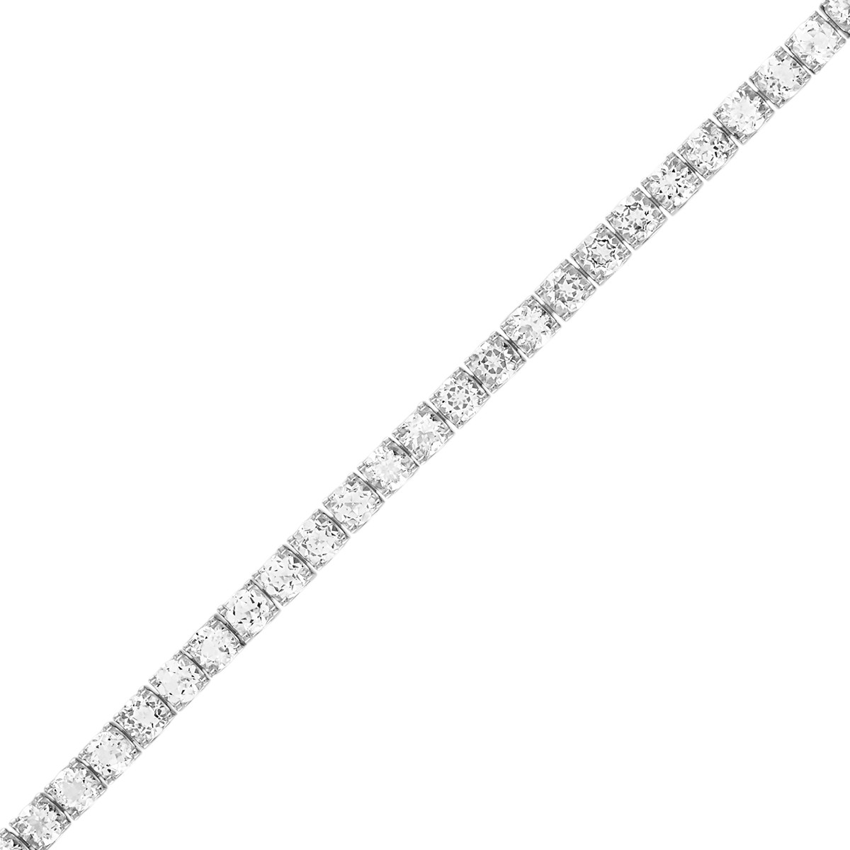 For those looking to make a bright and bold statement, this 8.5" tennis bracelet is made of rhodium-plated sterling silver links inset with 5MM white topaz, a mineral symbolizing hope, love and happiness. Clasp is etched with Bulova signature tuning fork logo on both sides.