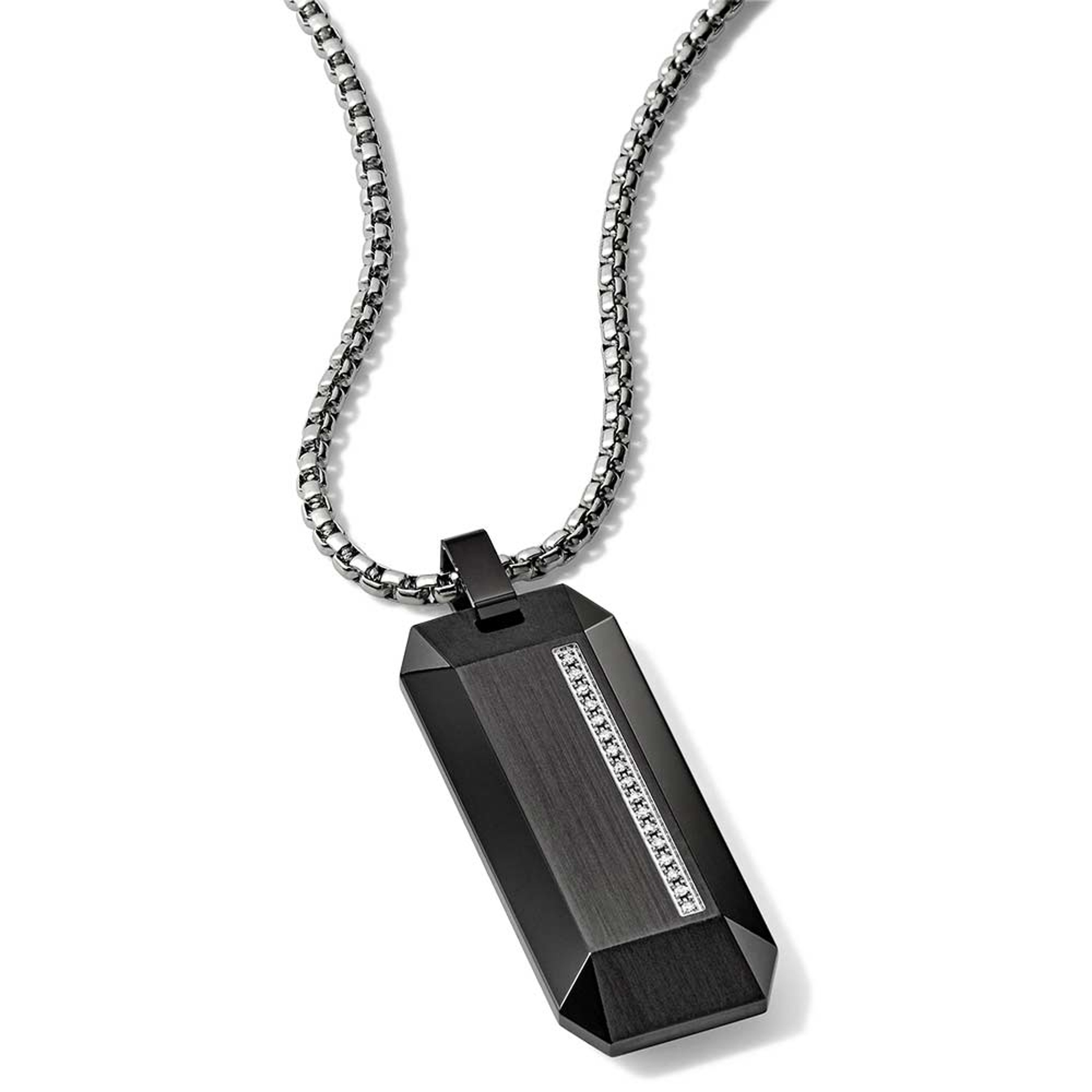 Contemporary boldly faceted black ion plated stainless steel dog tag pendant accented by a vertical line of 17 1.0mm (0.08 CTW) white diamonds, offers a statement look and signature details. Round box link chain with extender ring and signature tuning fork closure adjusts from 26” to 28”. Pendant measures 1.6 x .6 x 0.2 in.