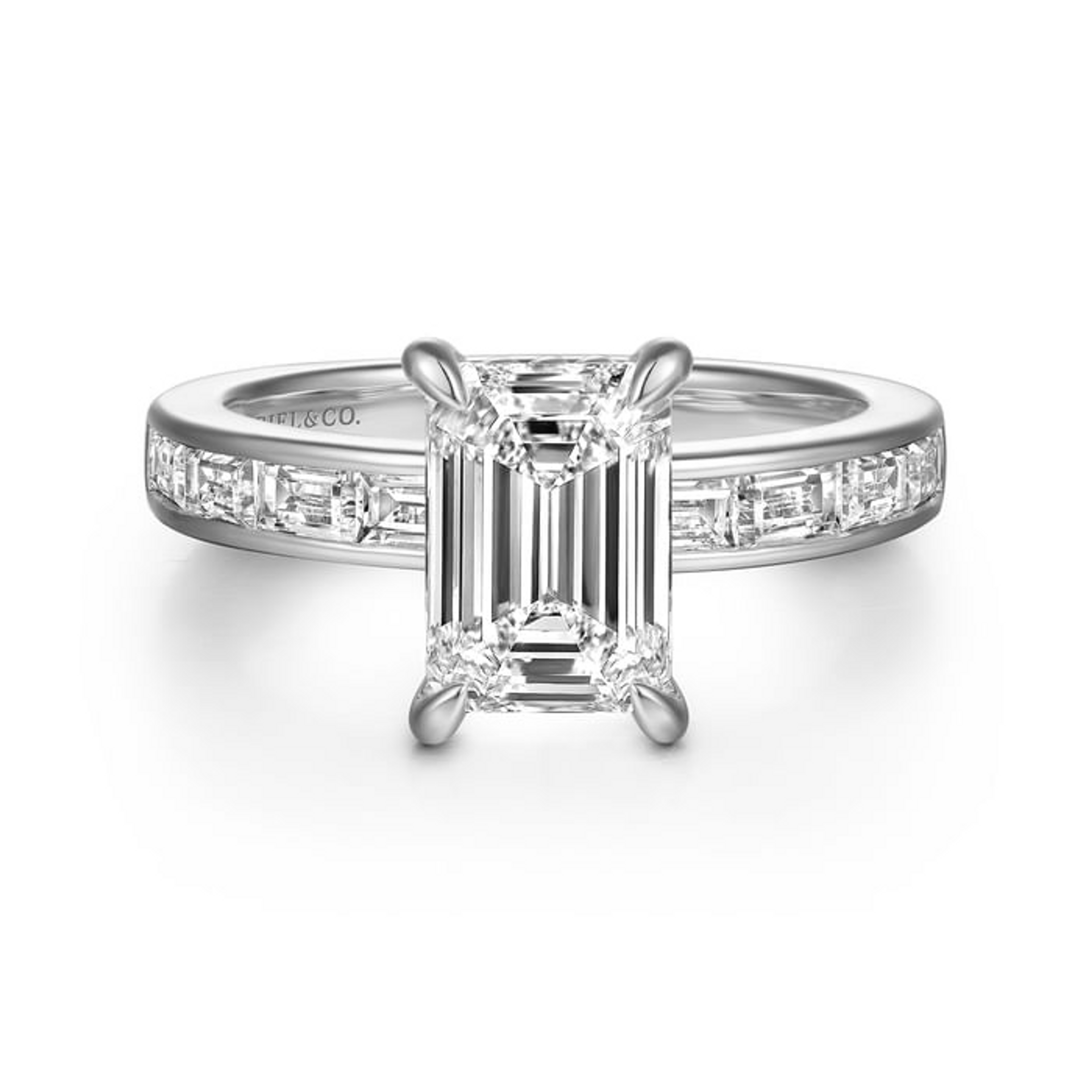 This exquisite ring showcases a brilliant round center diamond, perfectly complemented by a band adorned with striking emerald-cut diamonds. Pair with our Cassandra Wedding Band for a unified look in your wedding stack.