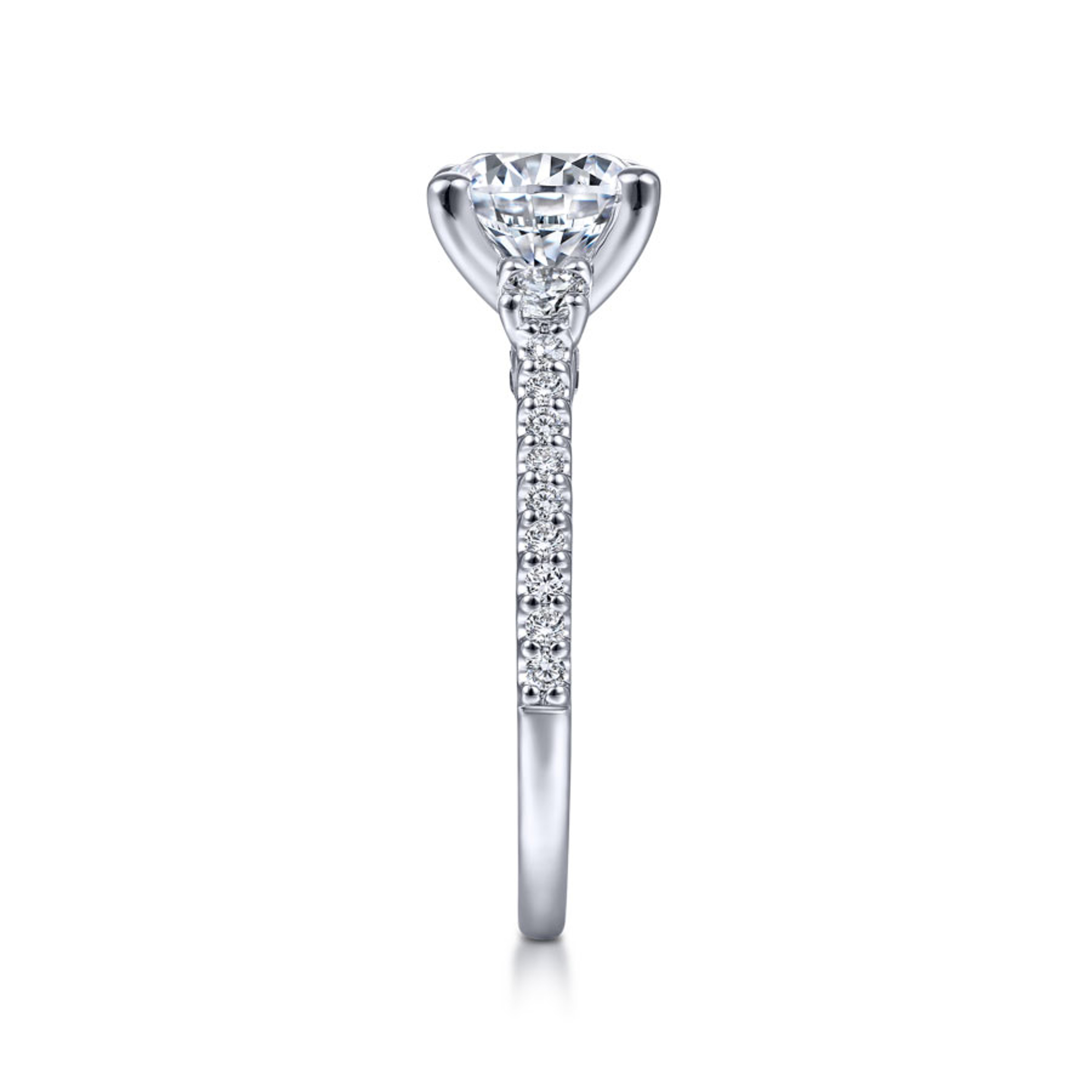 This three stone setting is beautifully handcrafted to represent the past, present and future of your relationship. two side stones, creating a balanced and uniform appearance. Including accent stones along the upper shank and a trifecta of dazzling diamonds in the gallery, this setting boasts 0.44 carats of sparkle!