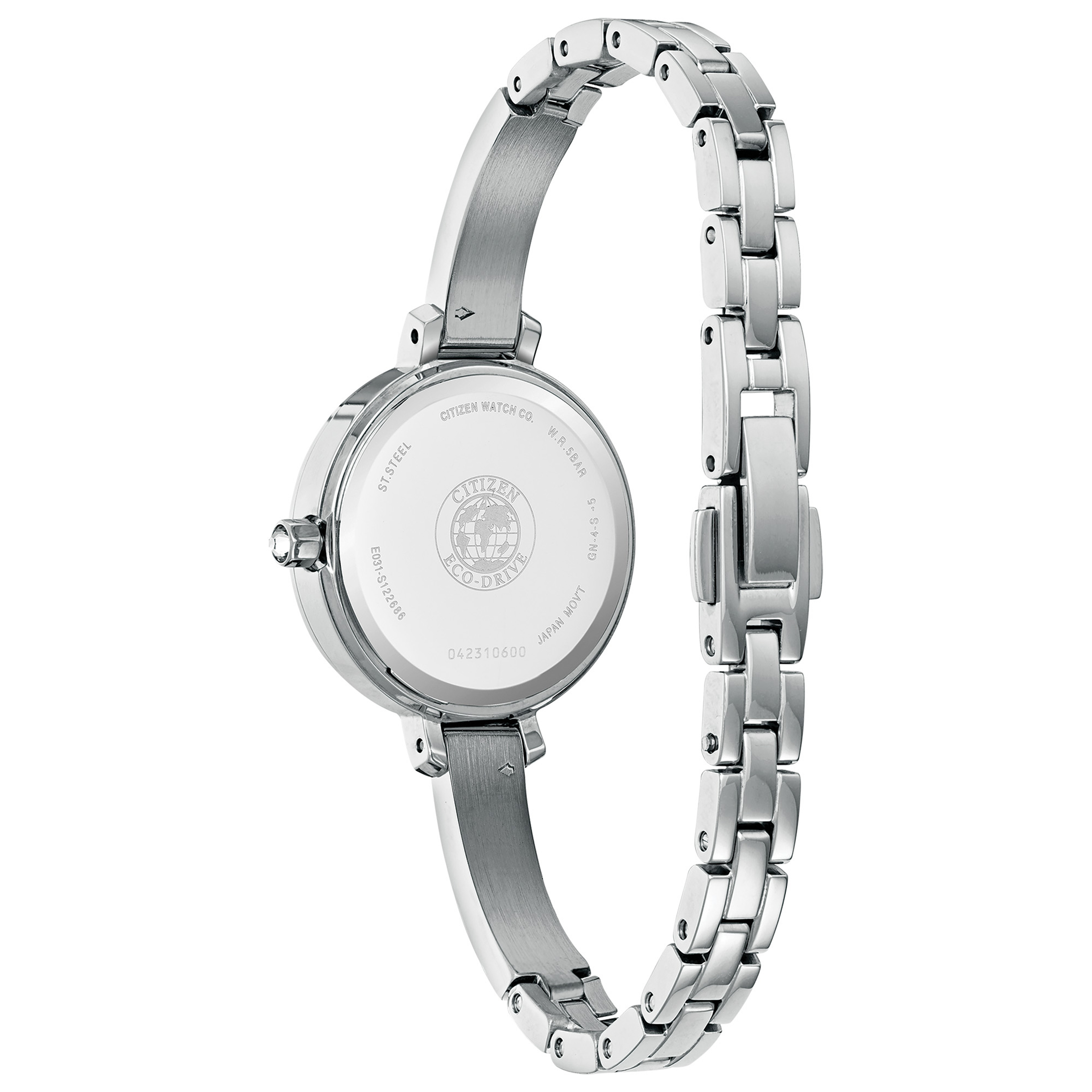 An exciting addition the Silhouette Crystal collection from Citizen is the princess cut bangle design. Both the stainless-steel bracelet and 25mm stainless-steel case are inset with crystals and the delicate profile means this timepiece can easily be worn alone as a statement piece, or alongside other bracelets for a unique and stunning formal look. It has a mother of pearl face, a three-hand dial and runs on Eco-Drive technology, so it is powered by light — any light.