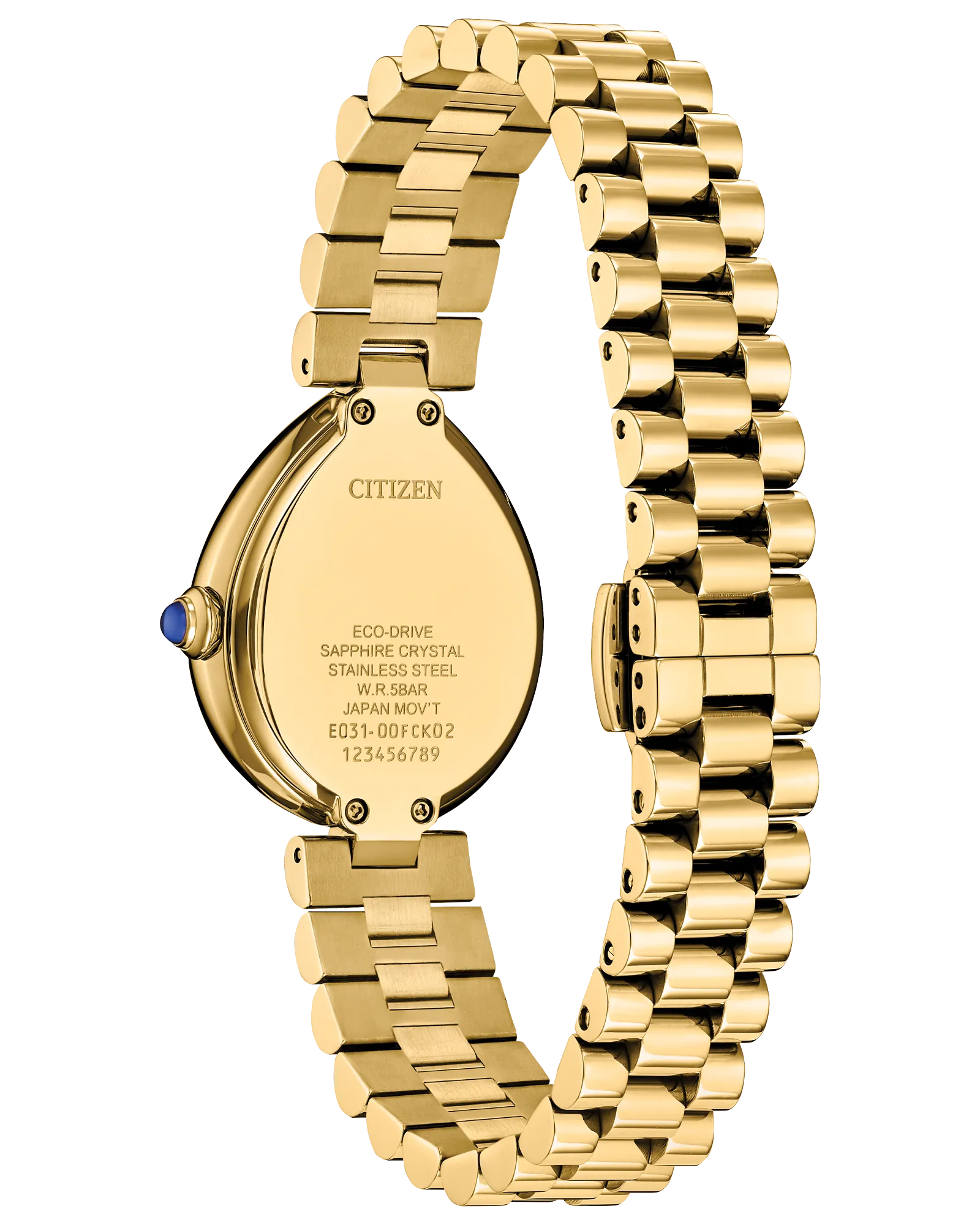 Flirty and feminine, the new Citizen L Rainell is a watch as creative and elegant as those who wear it. With subtle dimensions of 26mm by 31mm, the signature shape of the timepiece speaks for itself in an elevated gold-tone stainless steel. An integrated bracelet and synthetic sapphire-set crown punctuate the look. A lovely gold-tone dial follows the shape of the case, with...a brushed background playing host to refined details in applied indices and matching hands. Sustainably powered by any light with our proprietary Eco-Drive technology that never needs a battery. Water resistant up to 50 meters. Caliber E031.