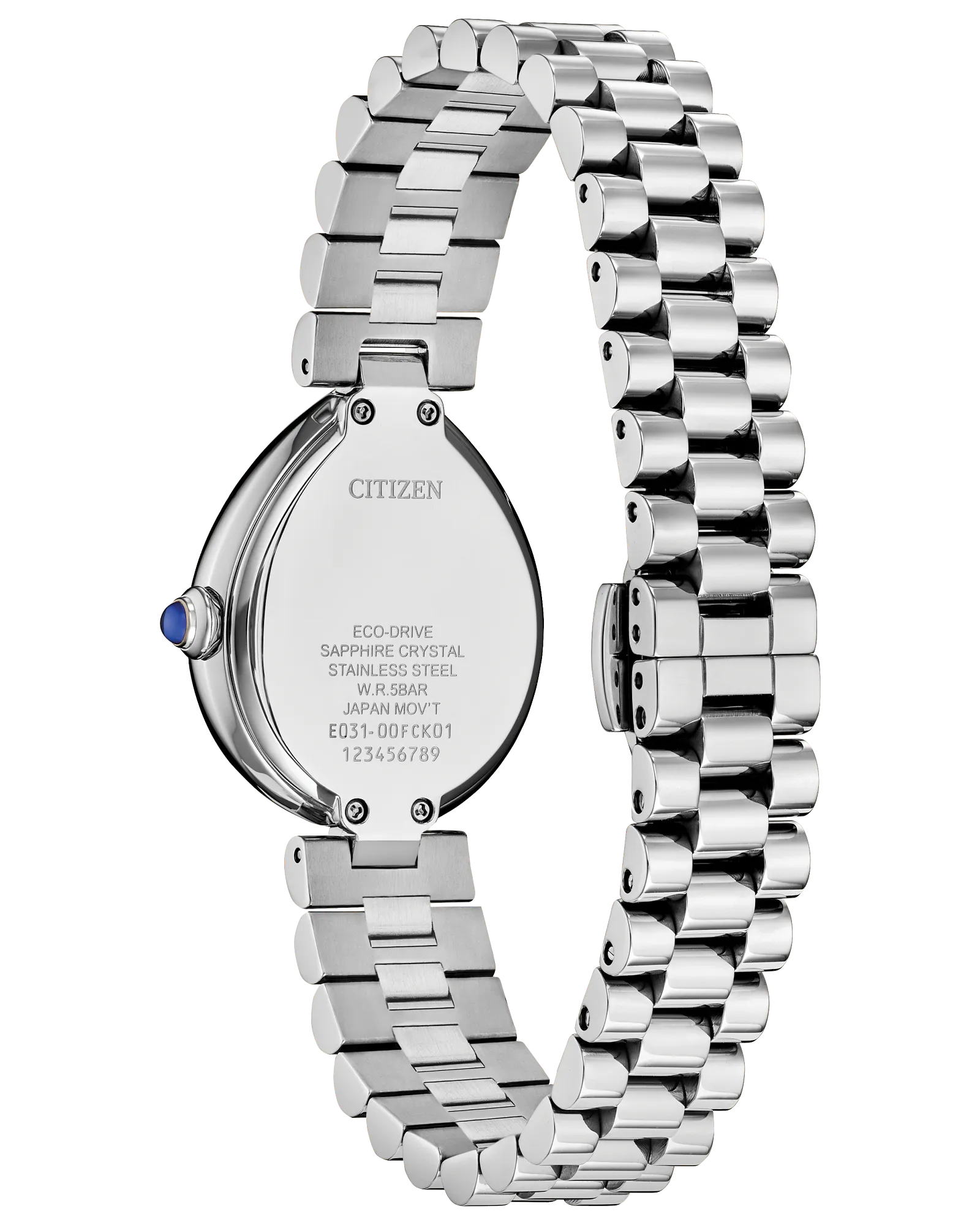 Flirty and feminine, the new Citizen L Rainell is a watch as creative and elegant as those who wear it. With subtle dimensions of 26mm by 31mm, the signature shape of the timepiece speaks for itself in understated silver-tone stainless steel. An integrated bracelet and synthetic sapphire-set crown punctuate the look. A lovely purple dial follows the shape of the case, with a...brushed background playing host to refined details in applied indices and matching hands. Sustainably powered by any light with our proprietary Eco-Drive technology that never needs a battery. Water resistant up to 50 meters. Caliber E031.