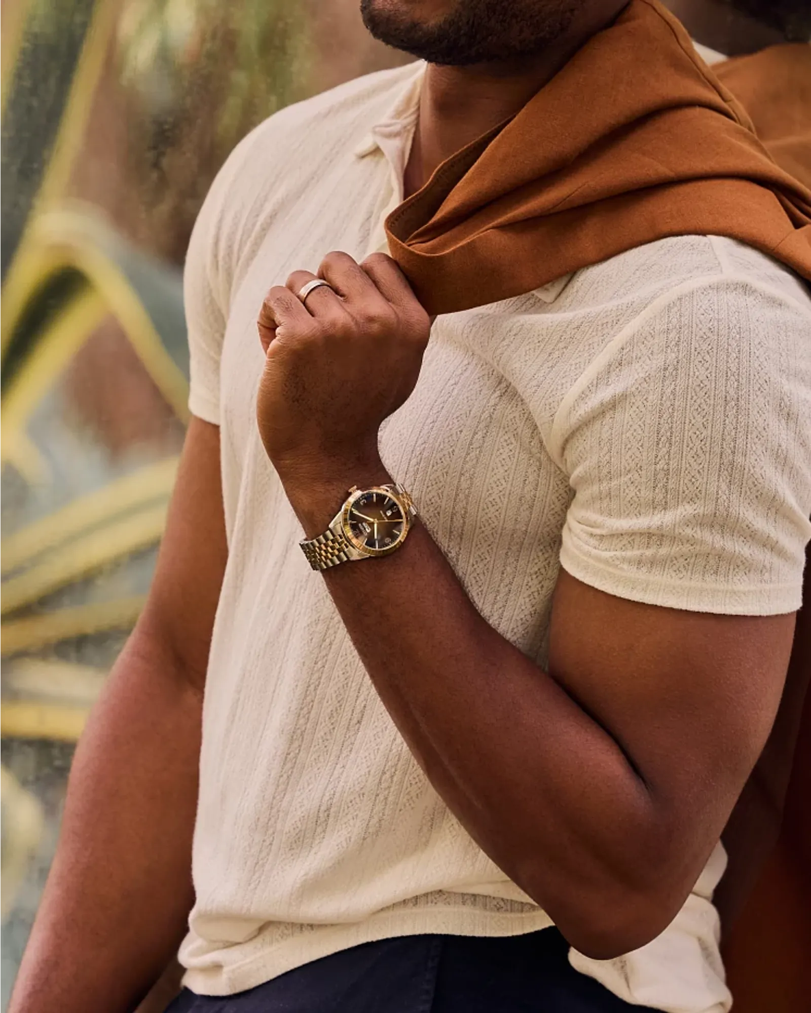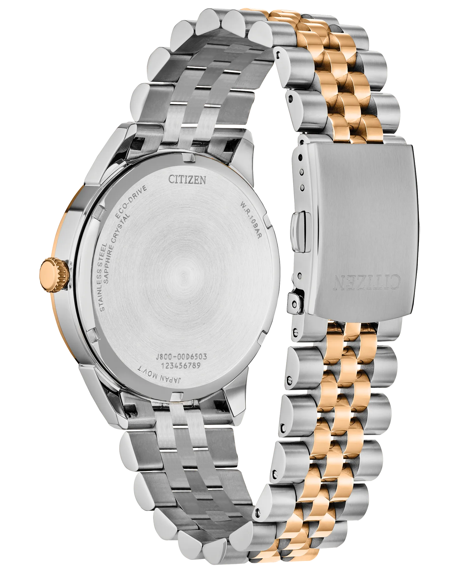 This vintage-inspired timepiece is a paragon of timeless elegance. With a 40.5mm, two-tone silver- and rose gold-tone case and matching five-link bracelet, the new Rolan features a rich brown dial with a gradient effect. Applied rose gold-tone accents and Arabic numerals at the quarter hours add to its charm, while day and date indicators on opposite sides of the top and bottom of the dial place the watch firmly in the realm of retro-style. The watch features Citizen's Eco-Drive technology – sustainably powered by light, any light, and never needs a battery. Water resistant to 100 meters. Caliber J800.