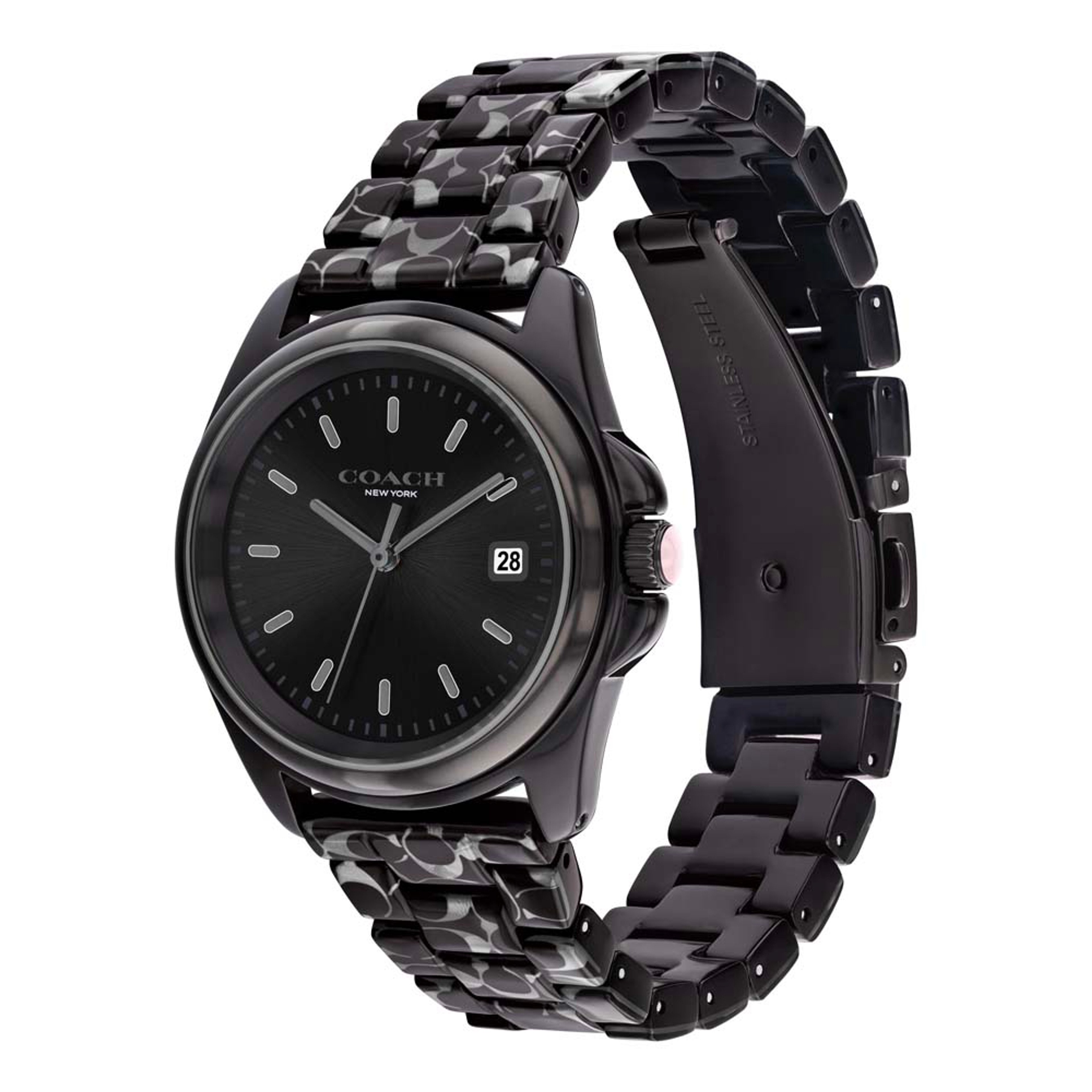 The epitome of refined sophistication, Greyson is a polished, go-everywhere timepiece. Finished with a versatile, durable strap crafted of custom-designed acetate featuring the iconic Coach Signature, this black ionic plated design has a black sunray dial detailed with stick markers and a date window at 3 o’clock.