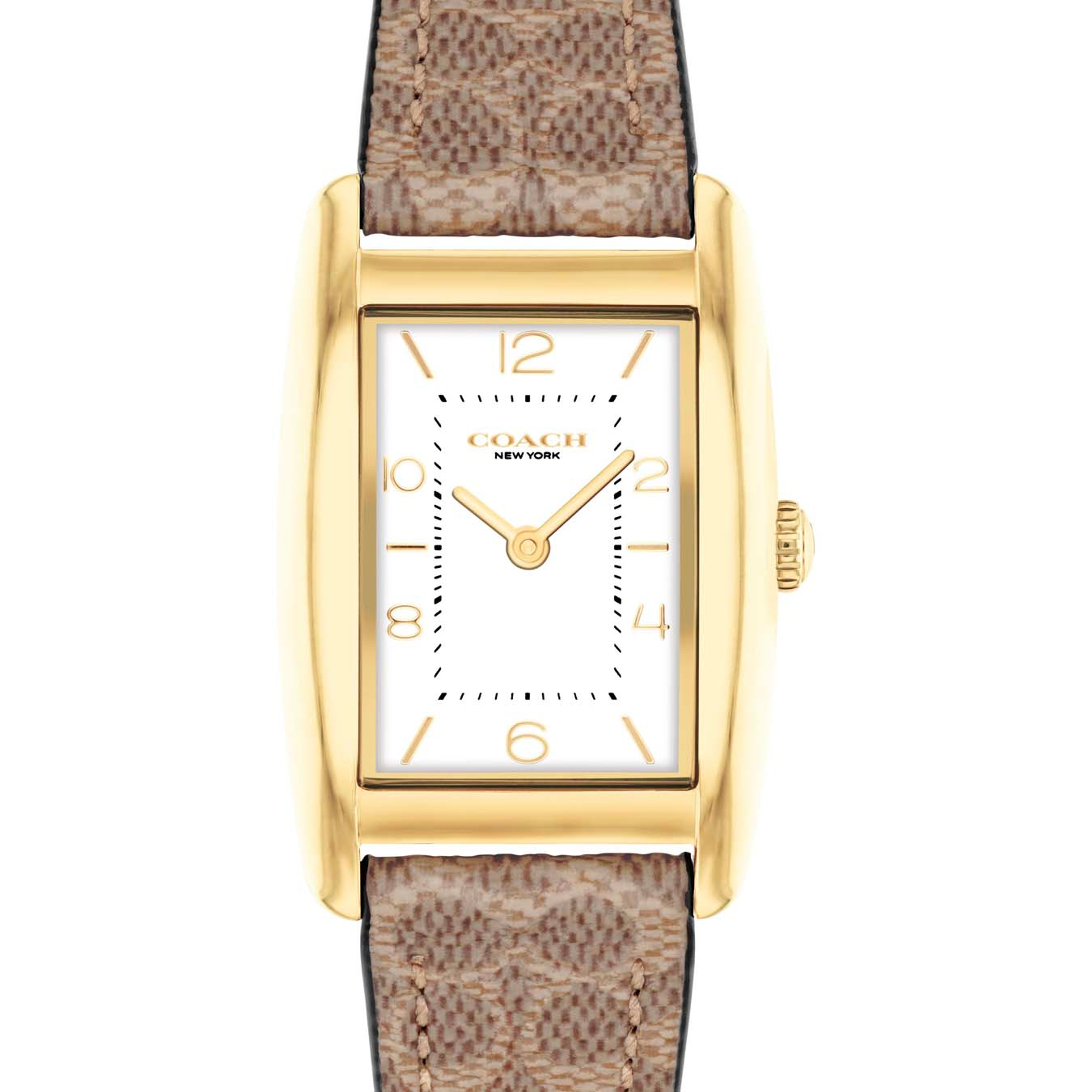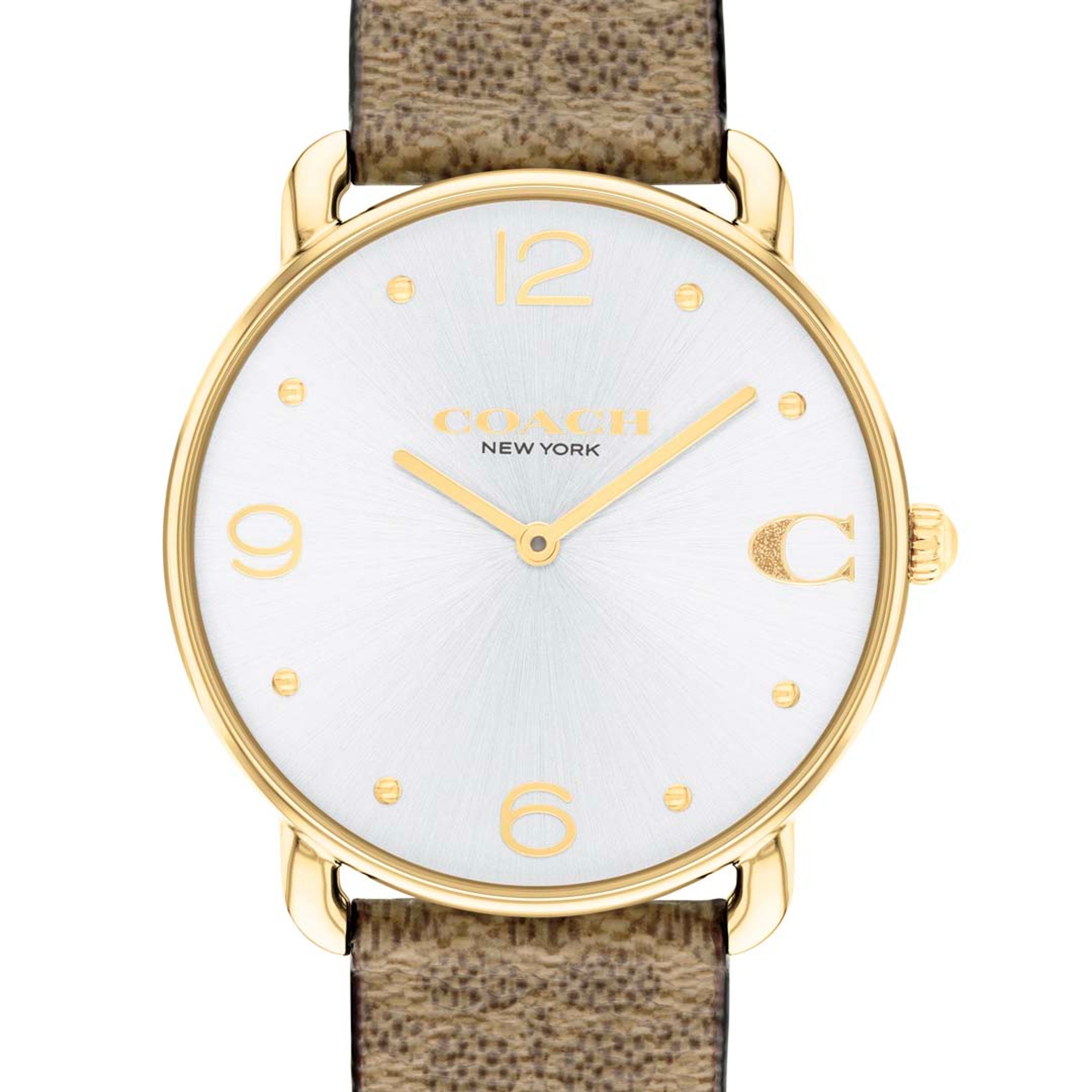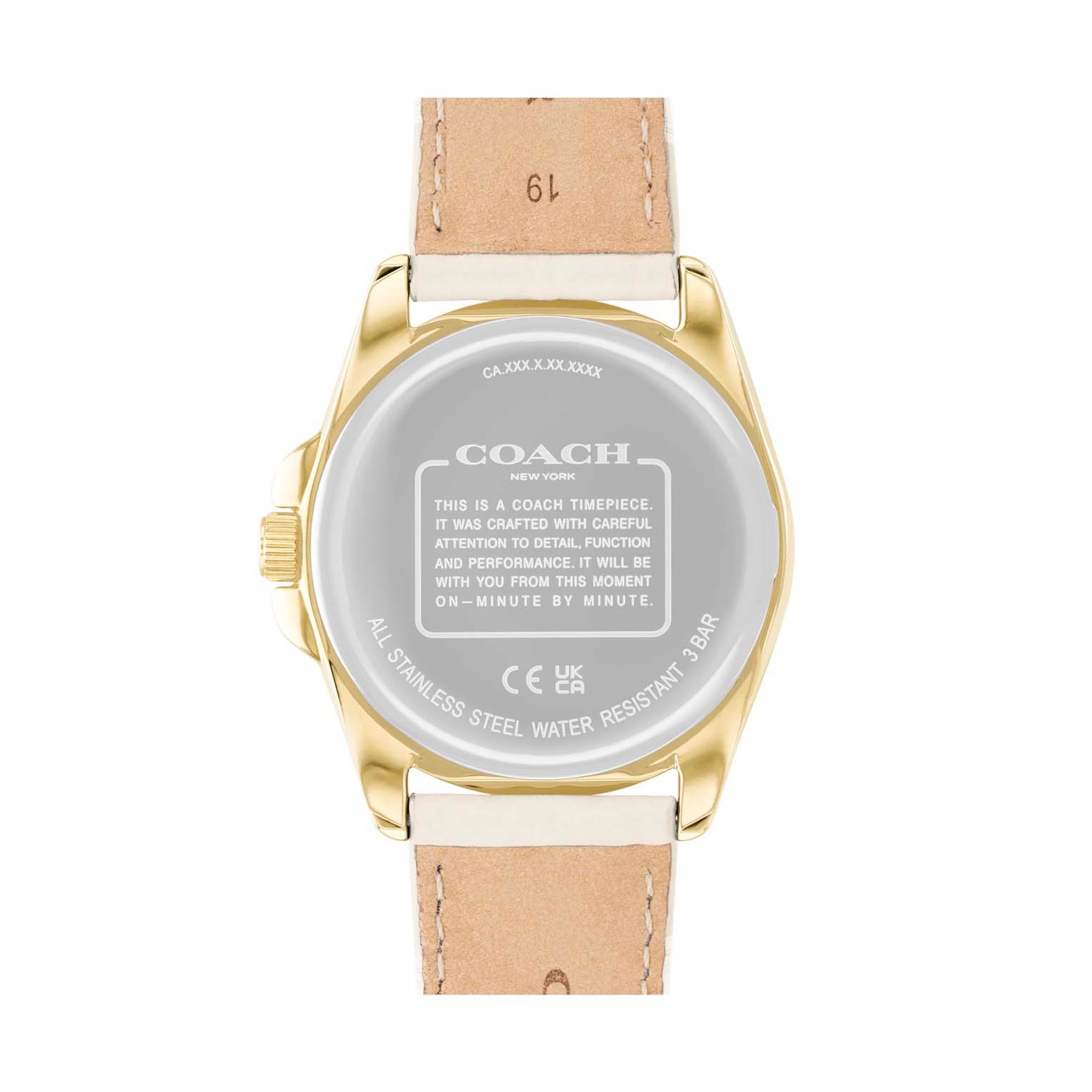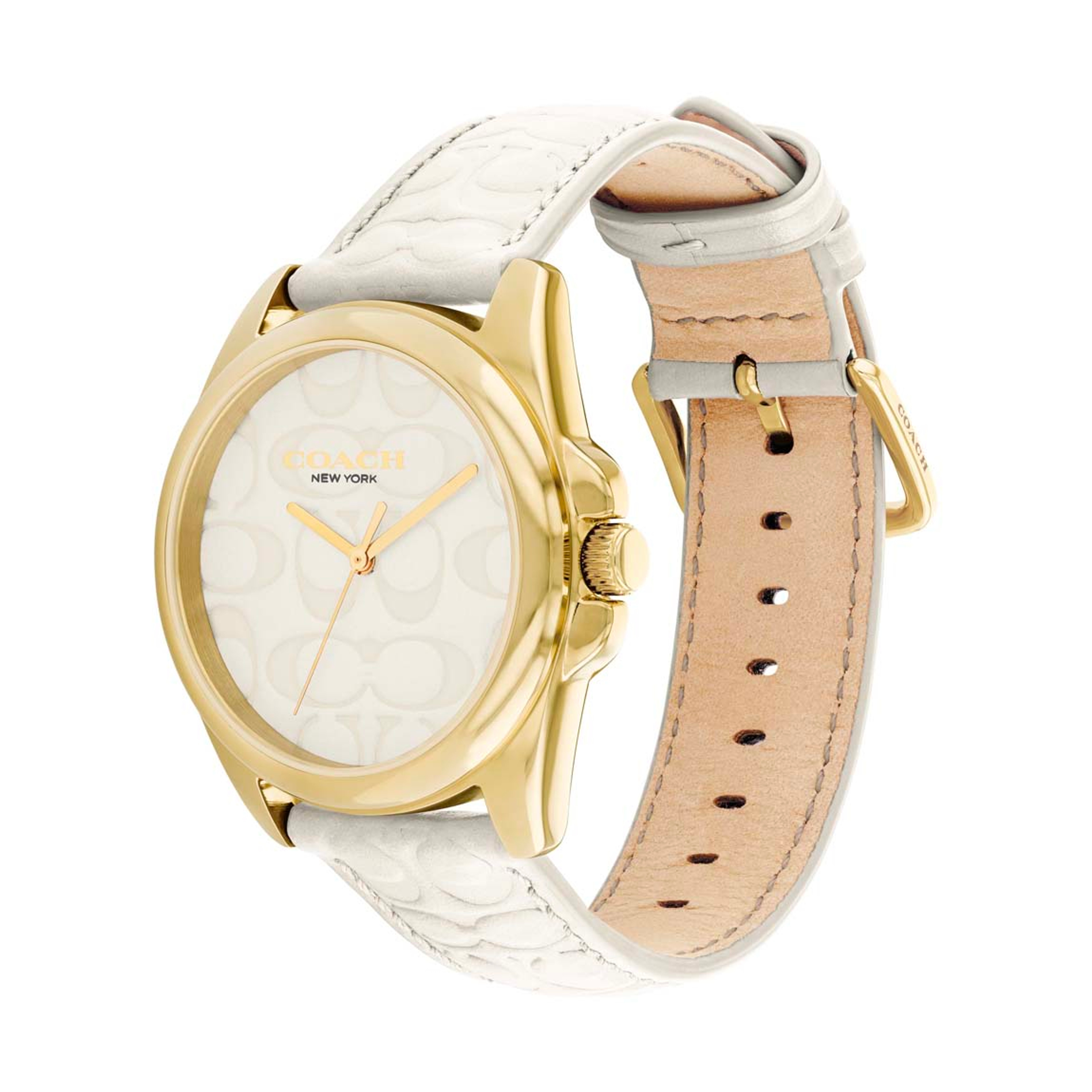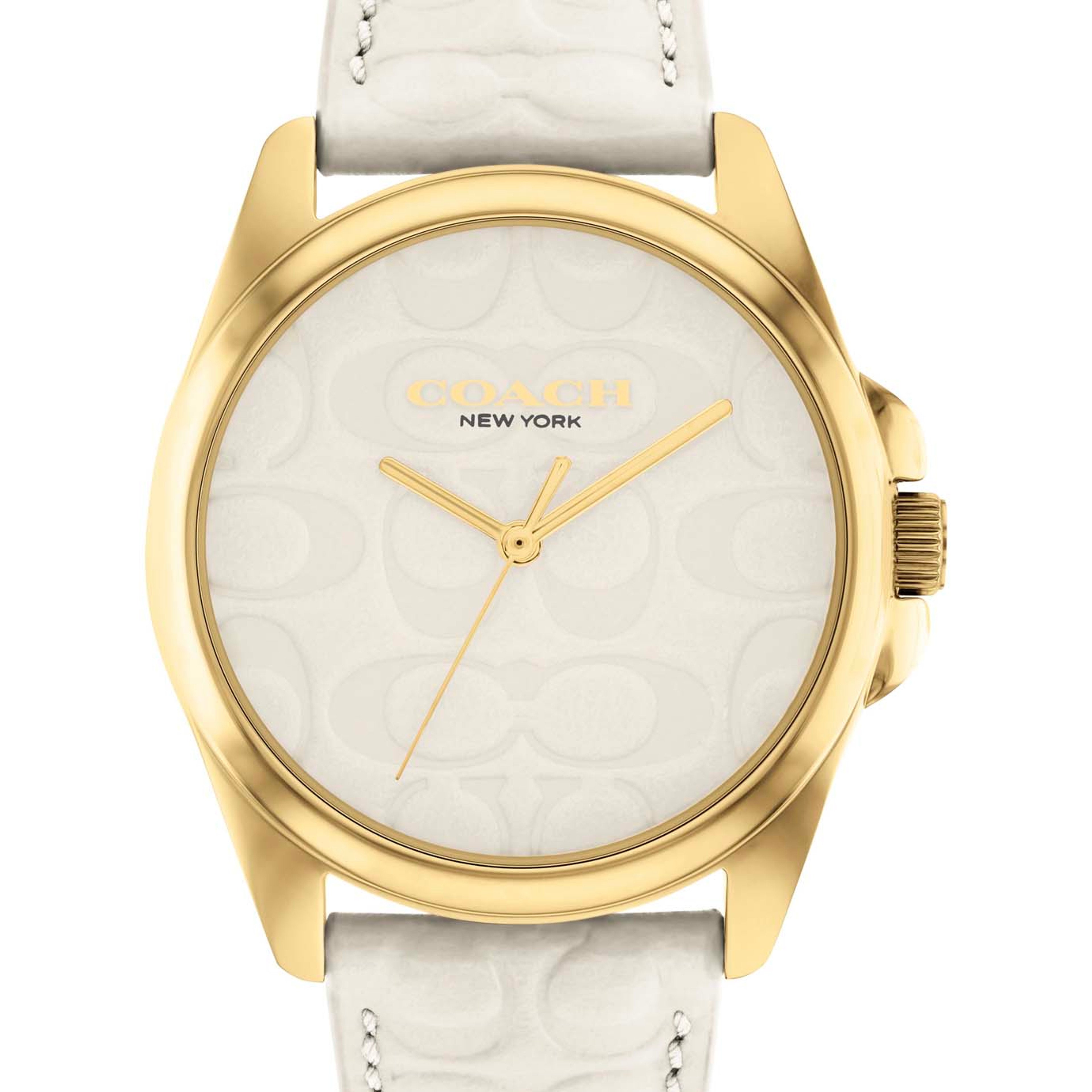 The epitome of refined sophistication, Greyson is a polished, go-everywhere timepiece. Featuring Coach’s debossed Signature on the chalk leather strap and dial, the gold tone is finished with a sweeping second hand.