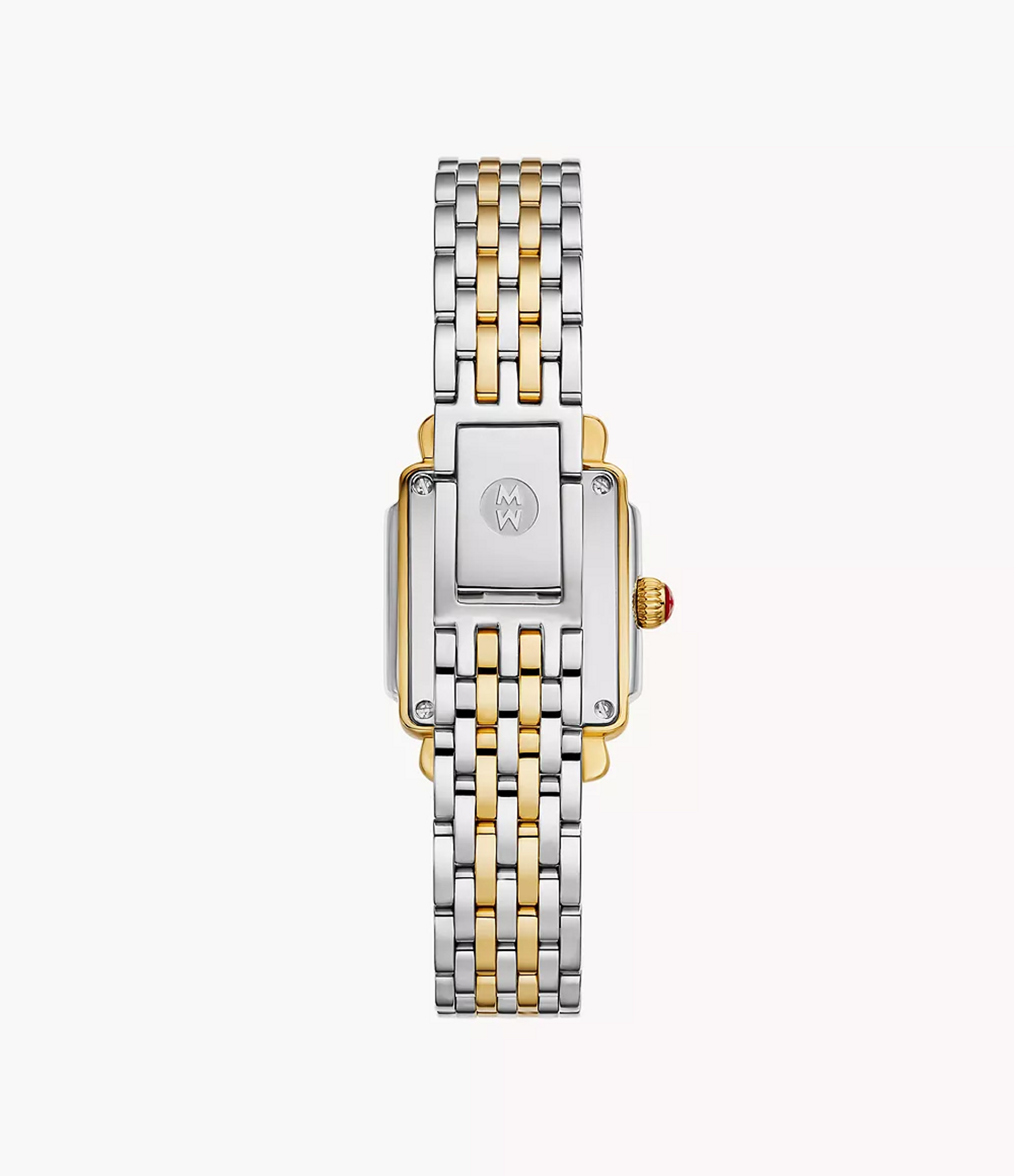 This petite two-tone stainless steel and 18K gold-plated rectangular timepiece perfectly balances vintage-inspired style with a modern edge. The white mother-of-pearl dial shines with 122 diamond accents (0.43 carat weight) and Swiss movement. The two-tone 18K gold-plated bracelet is made specifically for the Deco Madison Mini collection and is interchangeable with any 12mm MICHELE strap.