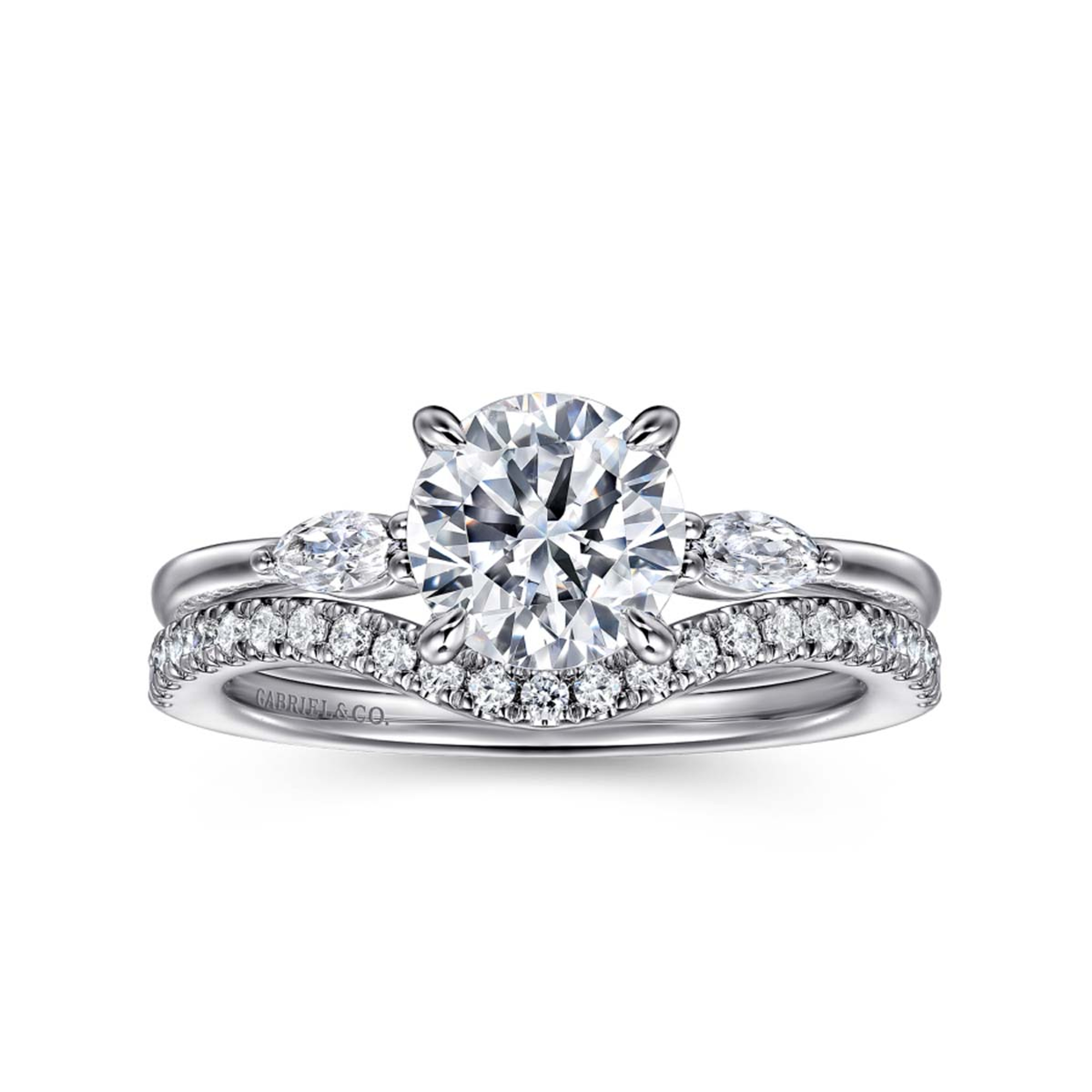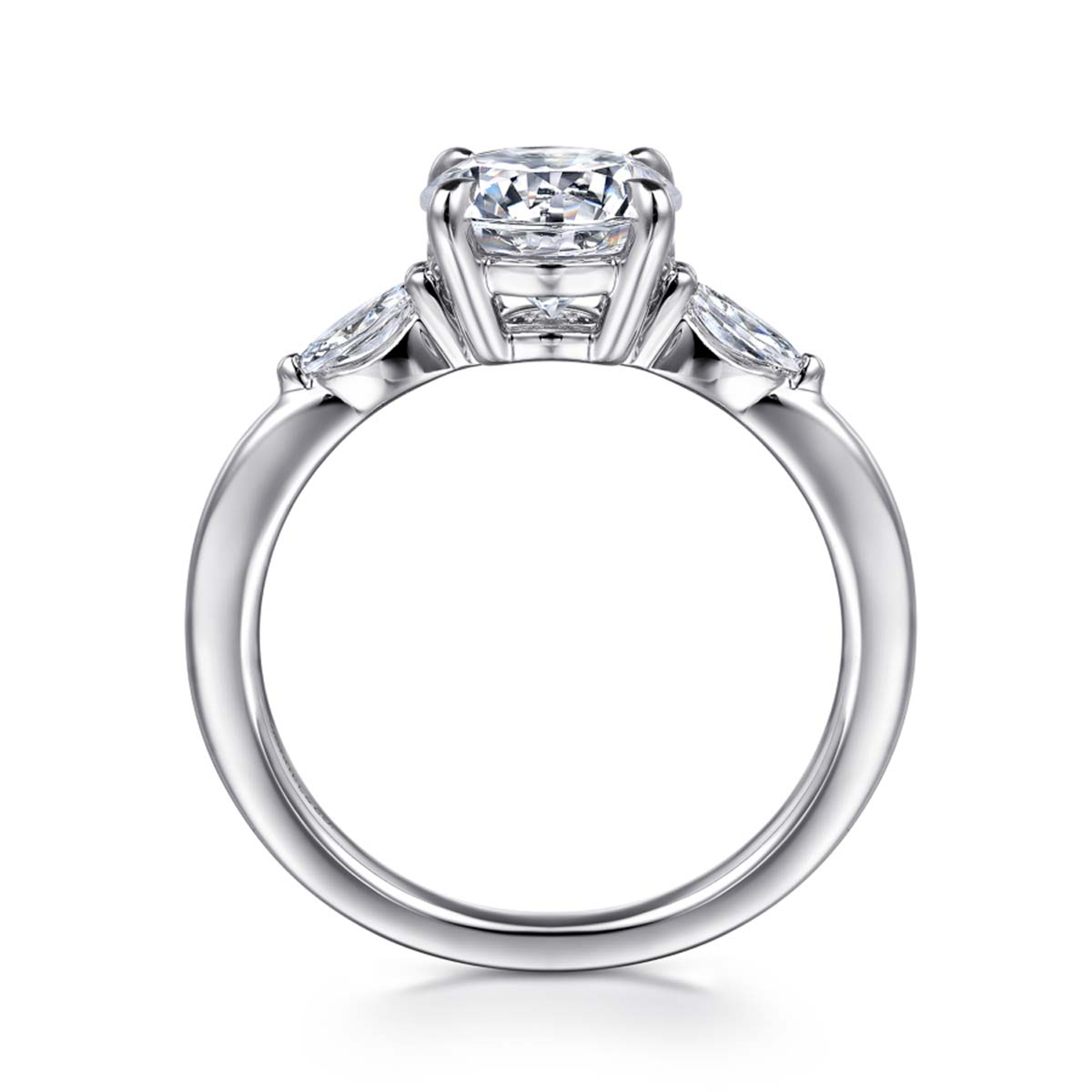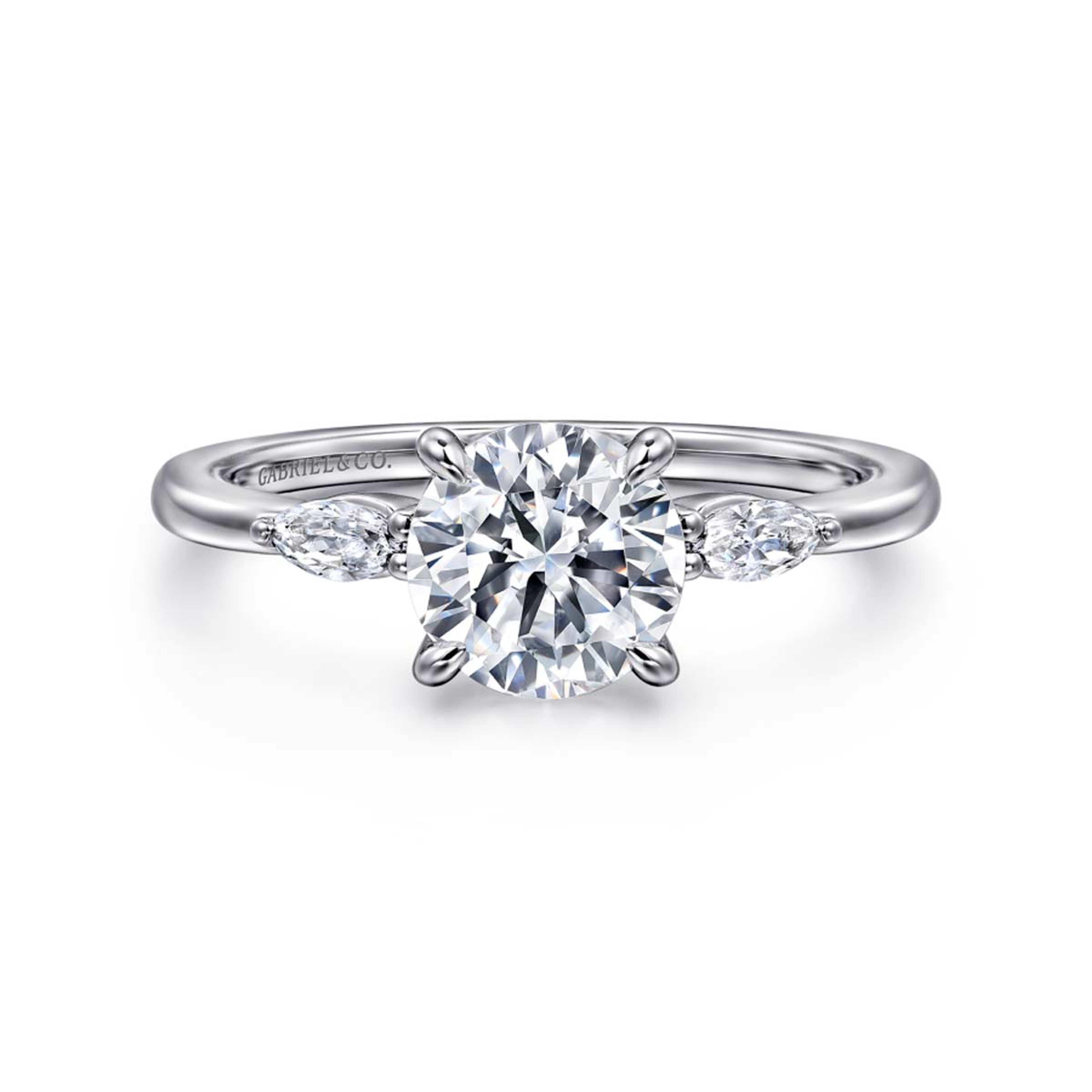 This engagement ring setting is timeless with a twist - it features a classic three stone style, but the side stones are stunning natural marquise diamonds.