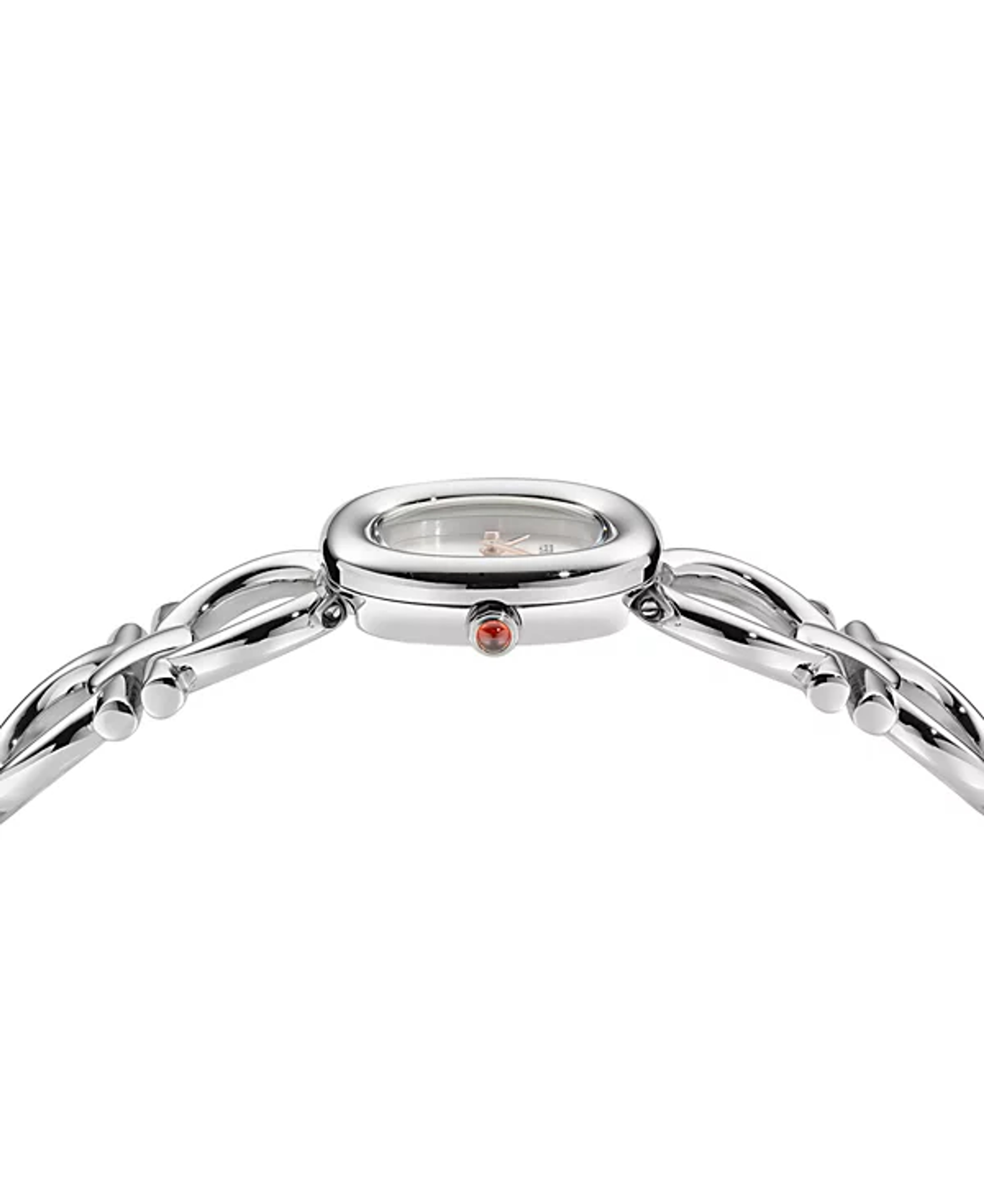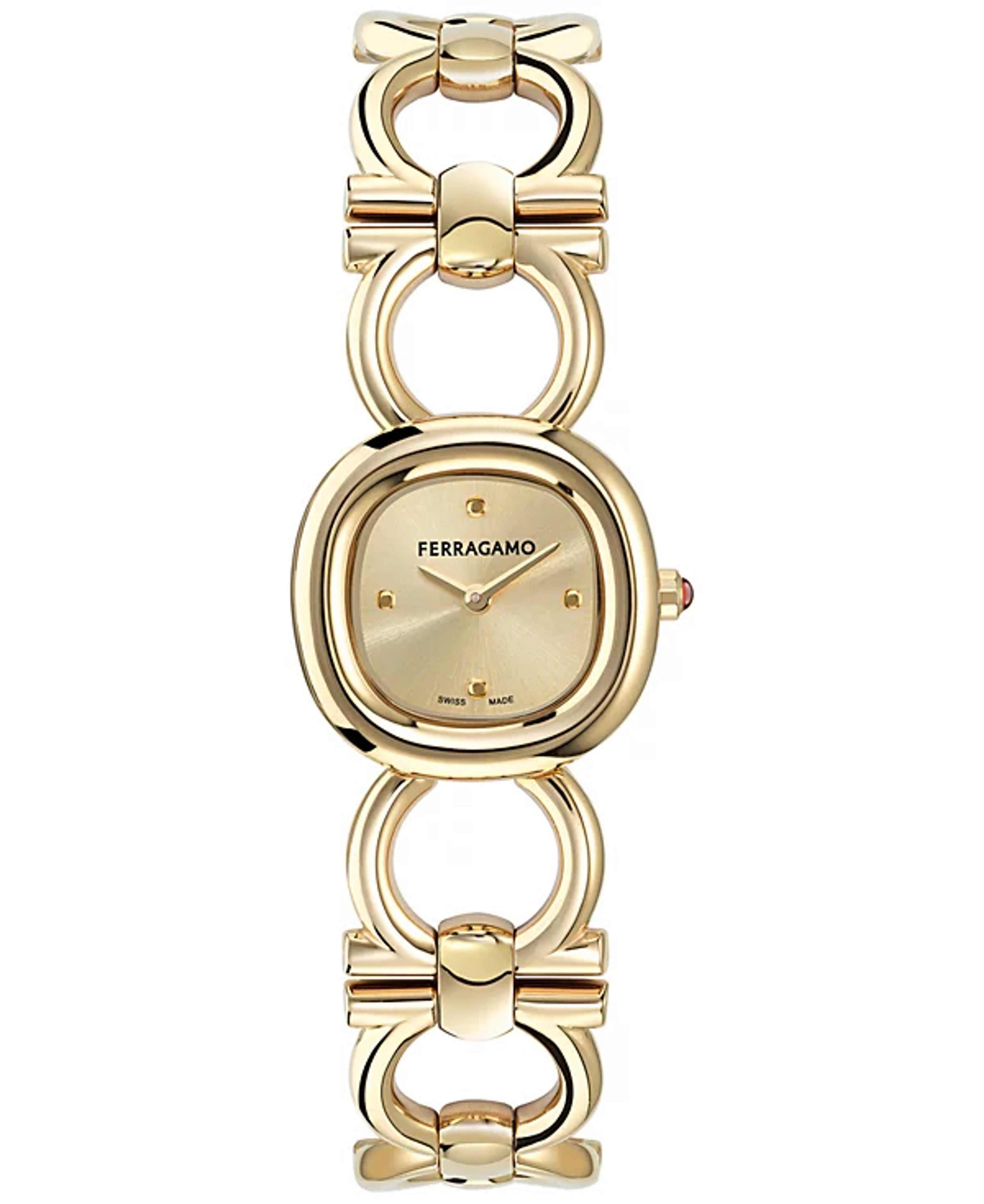 Among Ferragamo's best-selling watches, the Double Gancini style is reimagined as a stunning jewellery piece. The slightly rounded case features a raised outline that echoes the iconic motif of the bracelet, enhancing the sense of elegance and individuality.