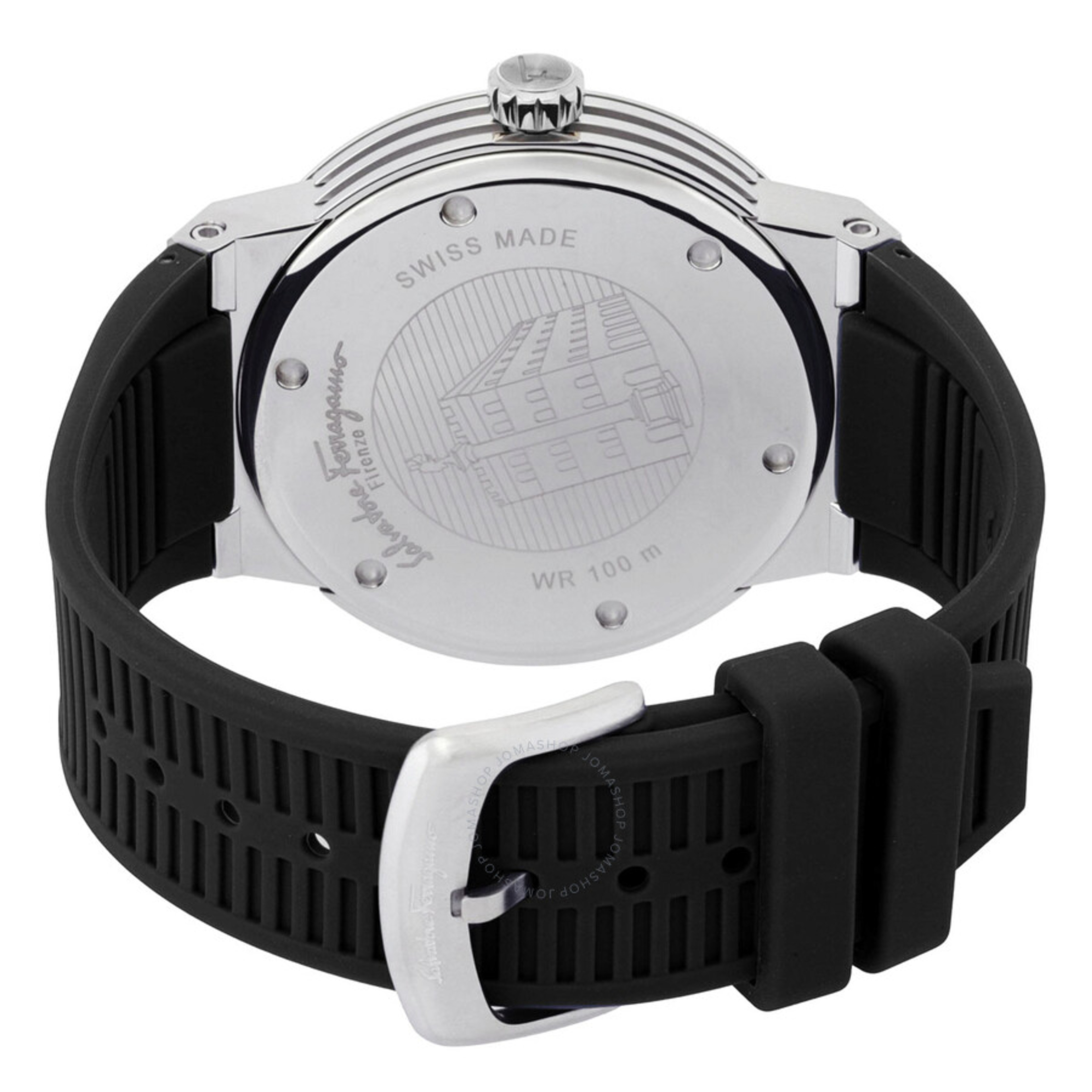 Silver-tone stainless steel case with a black rubber strap. Fixed silver-tone stainless steel bezel. Black dial with silver-tone hands and index-Arabic numeral hour markers. Minute markers around the outer rim. Dial Type: Analog. Luminescent hands and markers. Date display at the 3 o'clock position. Quartz movement. Scratch resistant sapphire crystal. Pull / push crown. Solid case back. Round case shape, case size: 44 mm, case thickness: 10.3. Band width: 16.5. Buckle clasp. Water resistant at 100 meters / 330 feet. Functions: date, hour, minute, second. F-80 Series. Sport watch style. Watch label: Swiss Made. Ferragamo F-80 Quartz Black Dial Men's Watch SFHY01322.