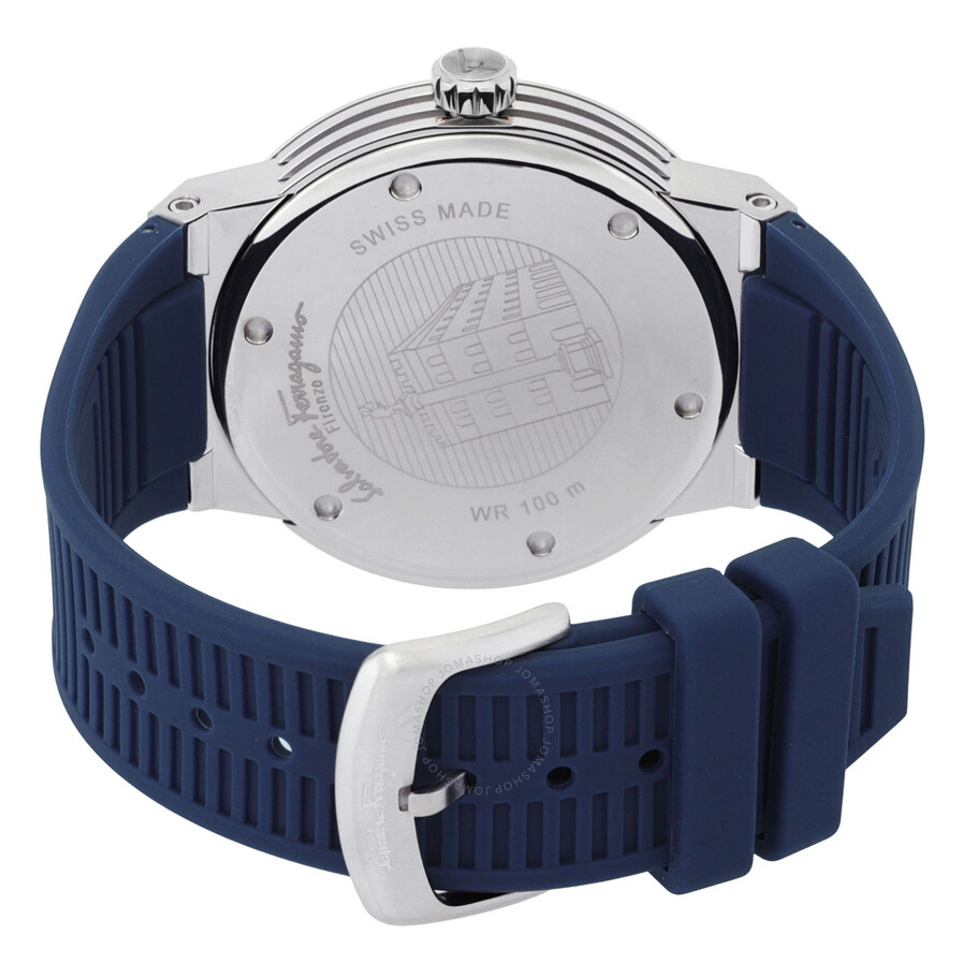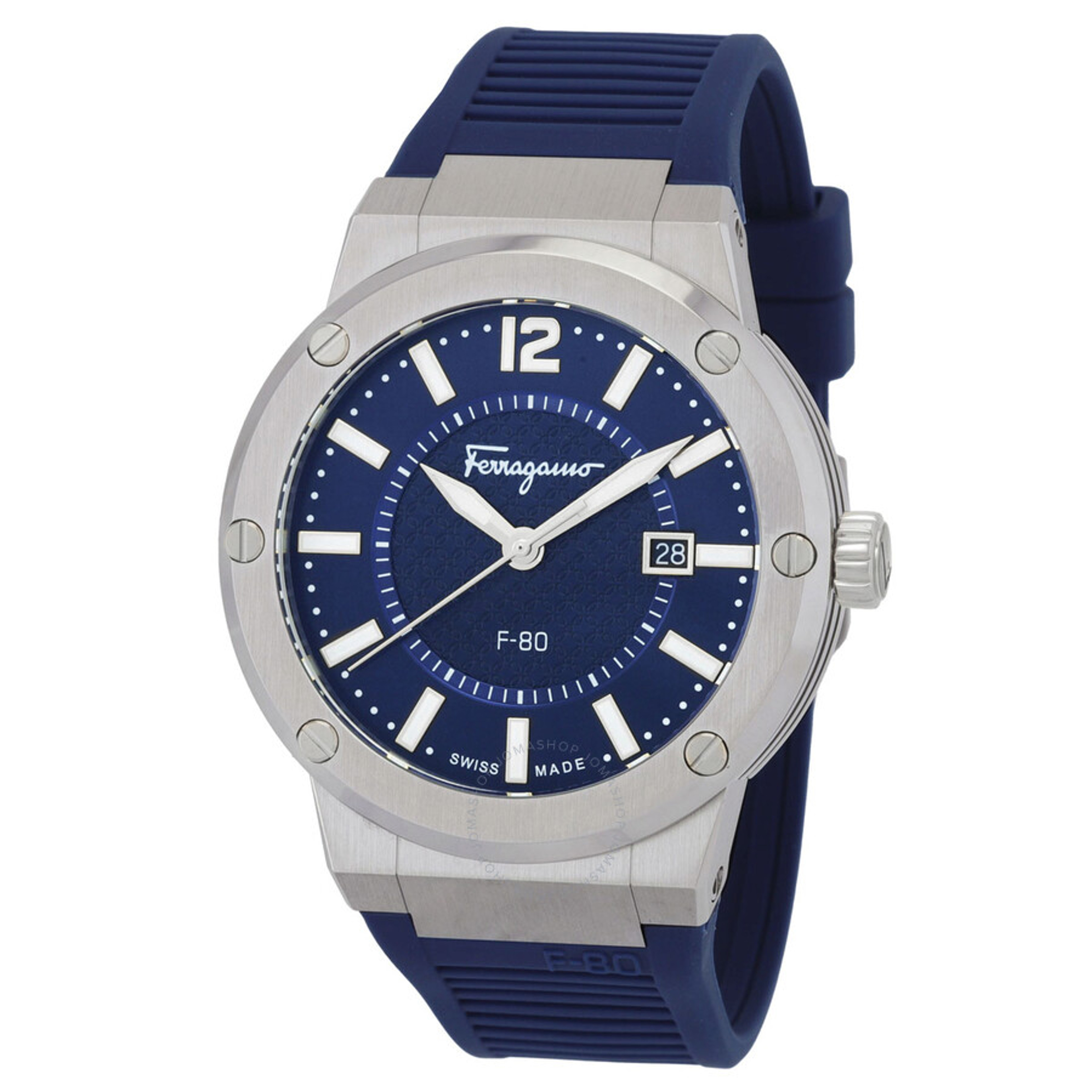 Silver-tone stainless steel case with a blue rubber strap. Fixed silver-tone stainless steel bezel. Blue dial with silver-tone hands and index-Arabic numeral hour markers. Minute markers around the outer rim. Dial Type: Analog. Luminescent hands and markers. Date display at the 3 o'clock position. Quartz movement. Scratch resistant sapphire crystal. Pull / push crown. Solid case back. Round case shape, case size: 44 mm, case thickness: 10.3 mm. Buckle clasp. Water resistant at 100 meters / 330 feet. Functions: date, hour, minute, second. F-80 Series. Sport watch style. Watch label: Swiss Made. Ferragamo F-80 Quartz Blue Dial Men's Watch SFHY01022.
