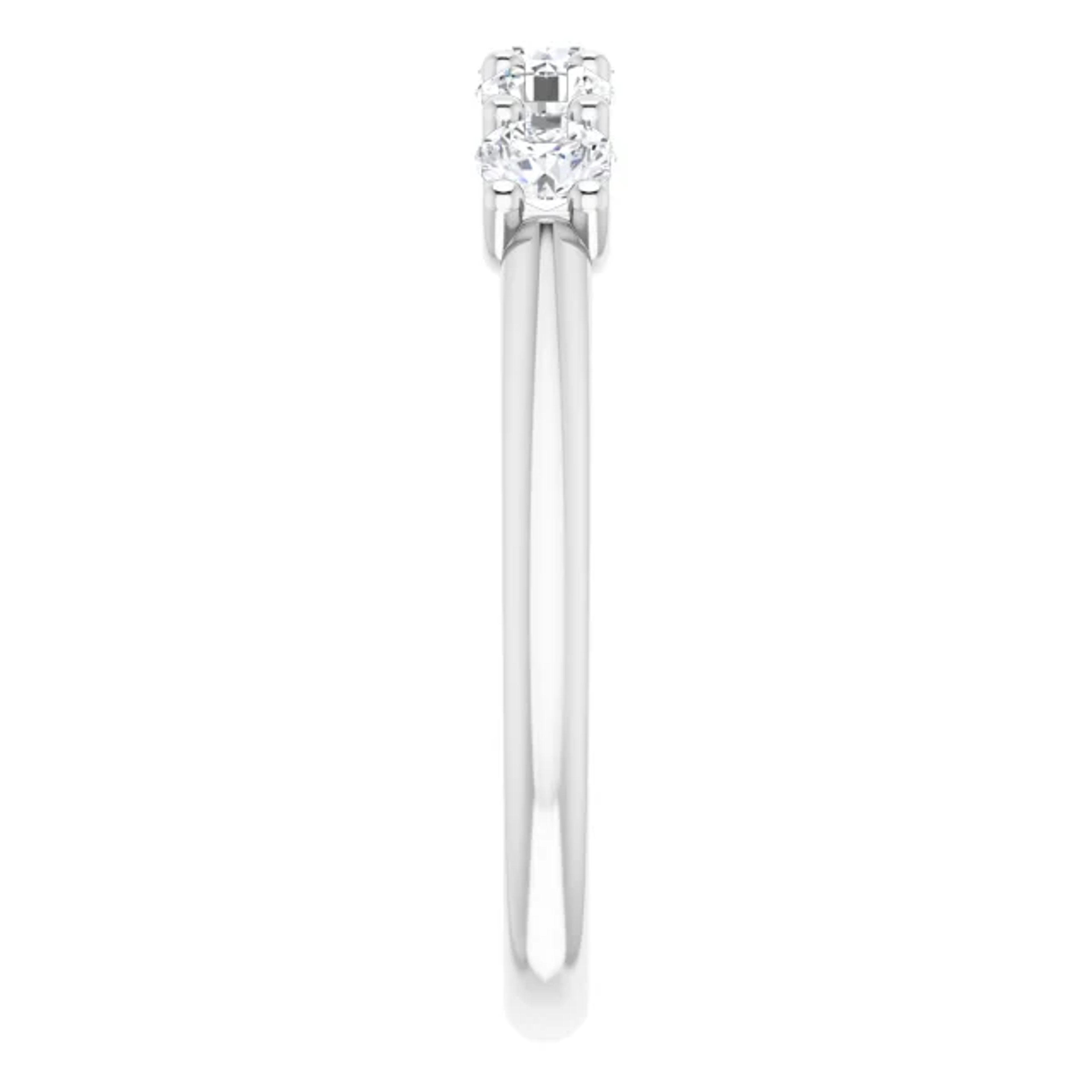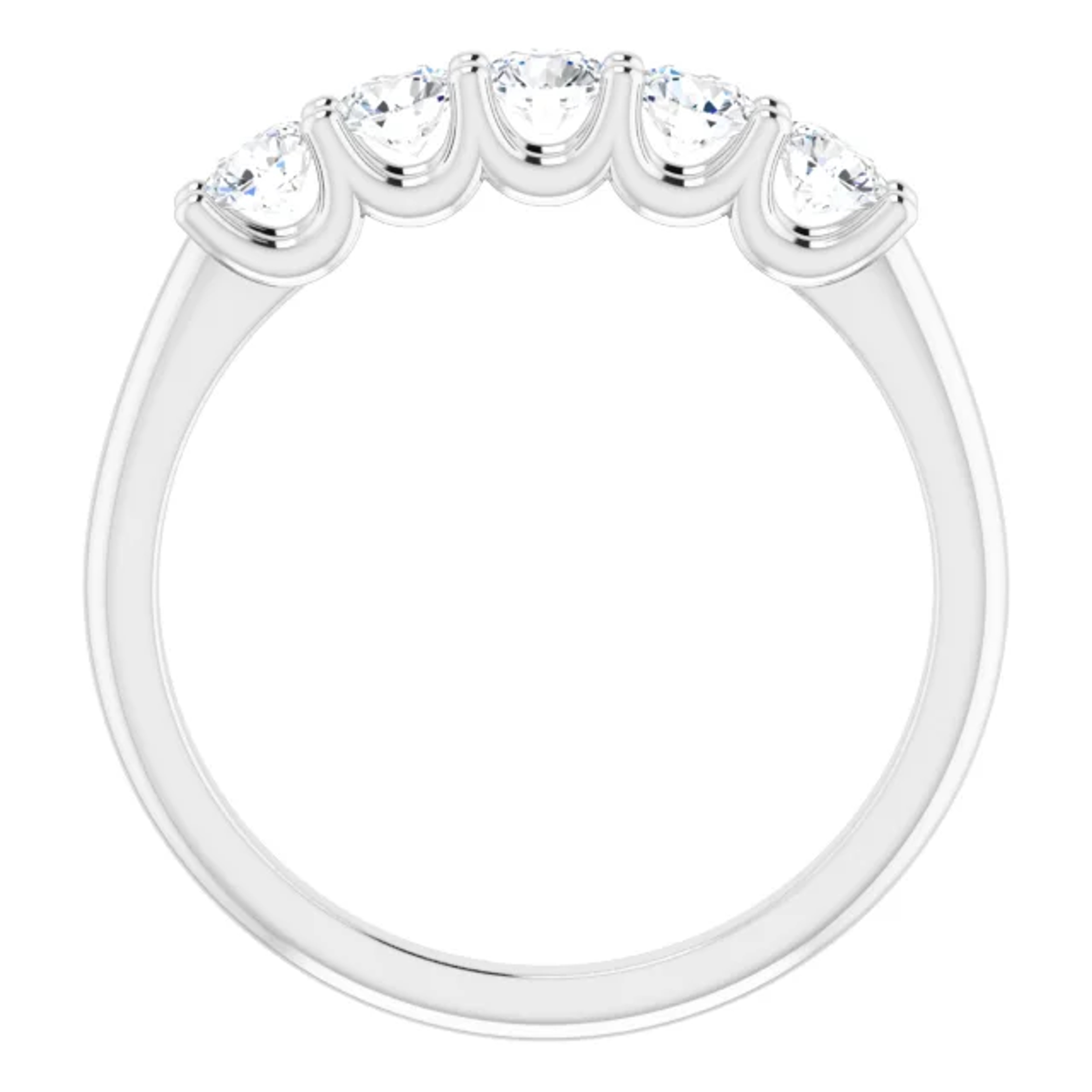 Five lustrous round-cut stones take center stage, each representing a cherished year of shared memories and milestones. Set in a sleek band of your choice, whether it be gleaming platinum, warm gold, or classic white gold, the stones are arranged in a captivating sequence that draws attention to their brilliance.