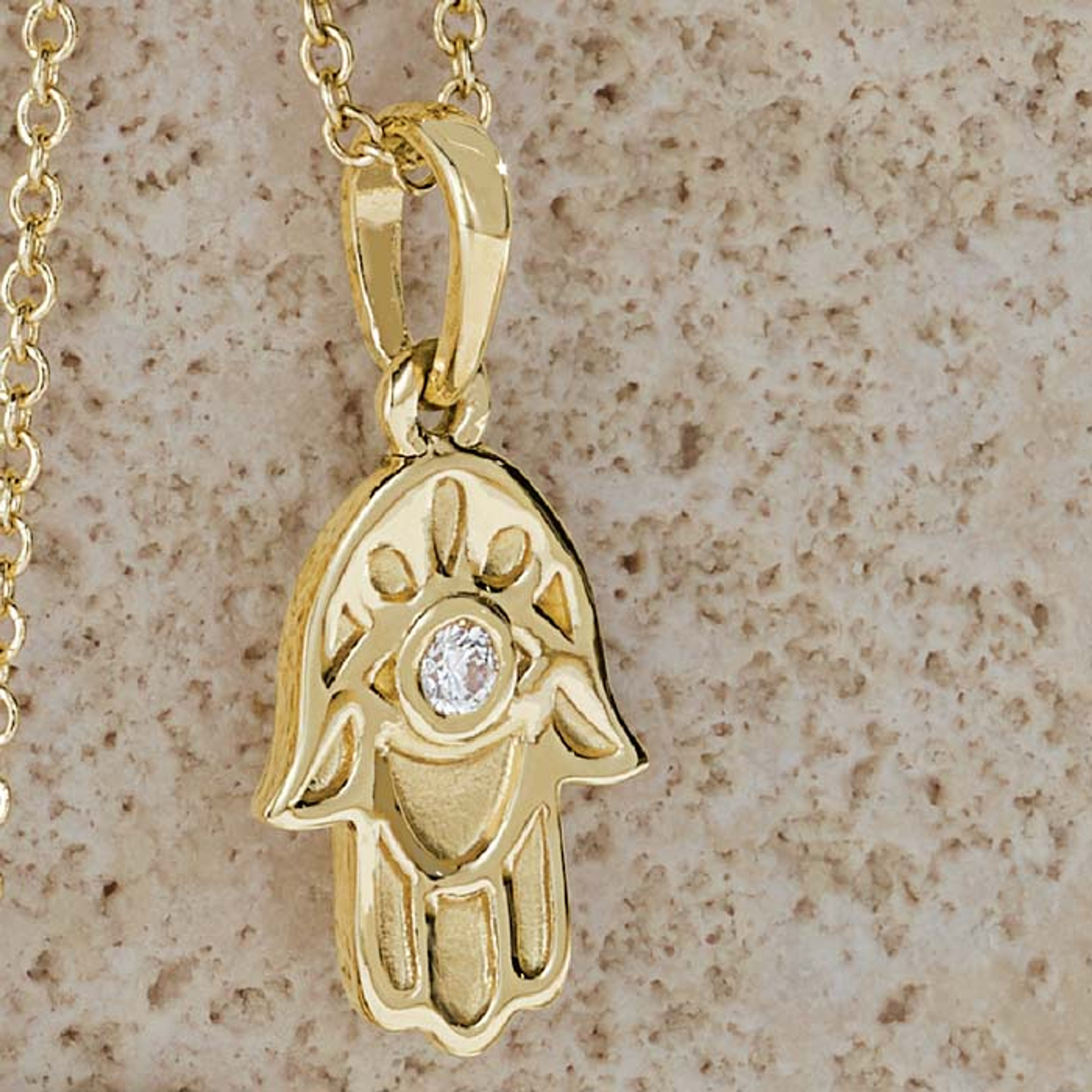 Unveil the mystique and ancient symbolism of protection with our Hamsa Hand Diamond Pendant Necklace. At the heart of the pendant lies a singular diamond that accentuates the intricate beauty of the Hamsa Hand design.