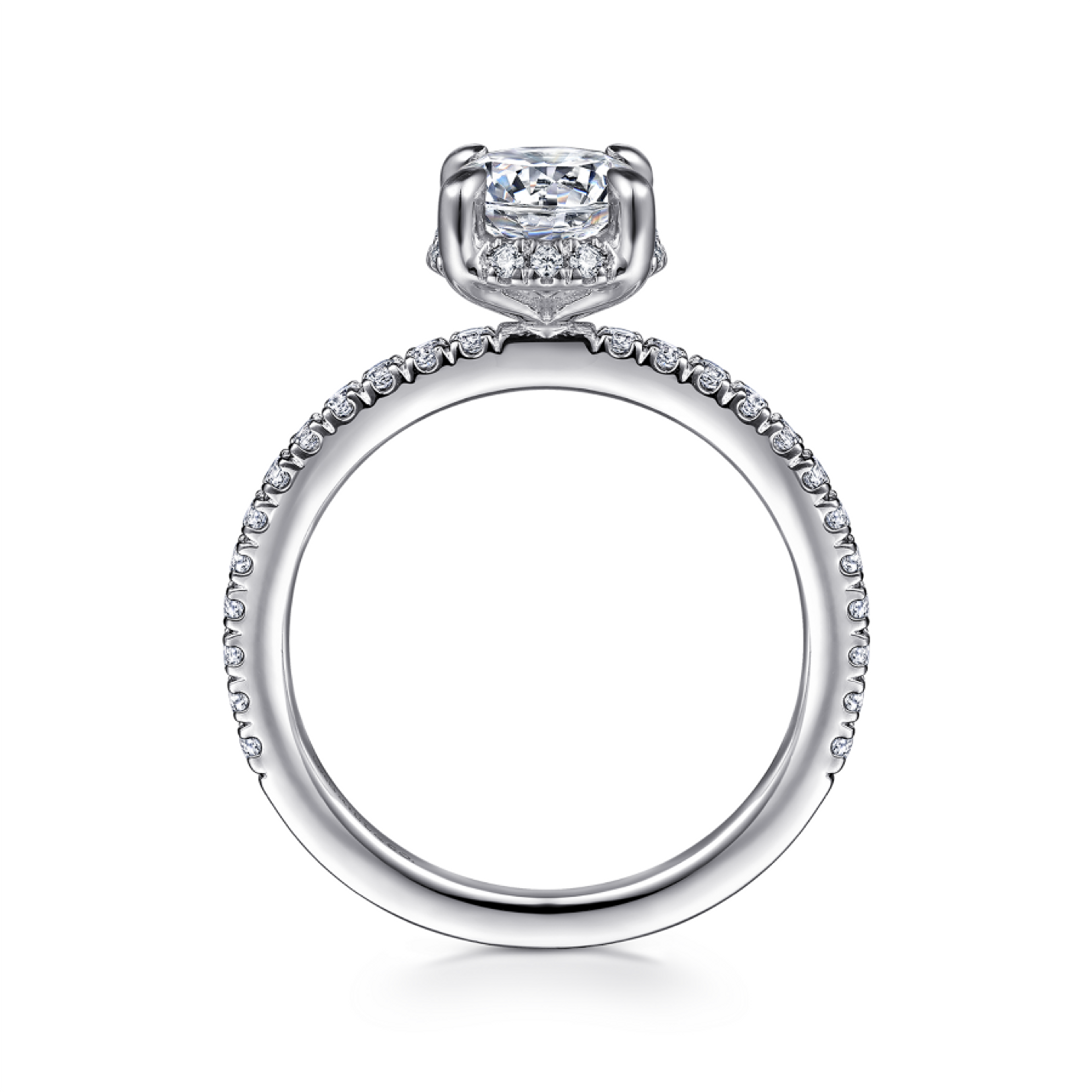 Show them the significance of love with this glamorous hidden halo engagement ring setting. Carefully encrusted diamonds across the hidden halo and delicately tapered band create an air of sophistication. This setting will showcase your center stone to its best advantage.