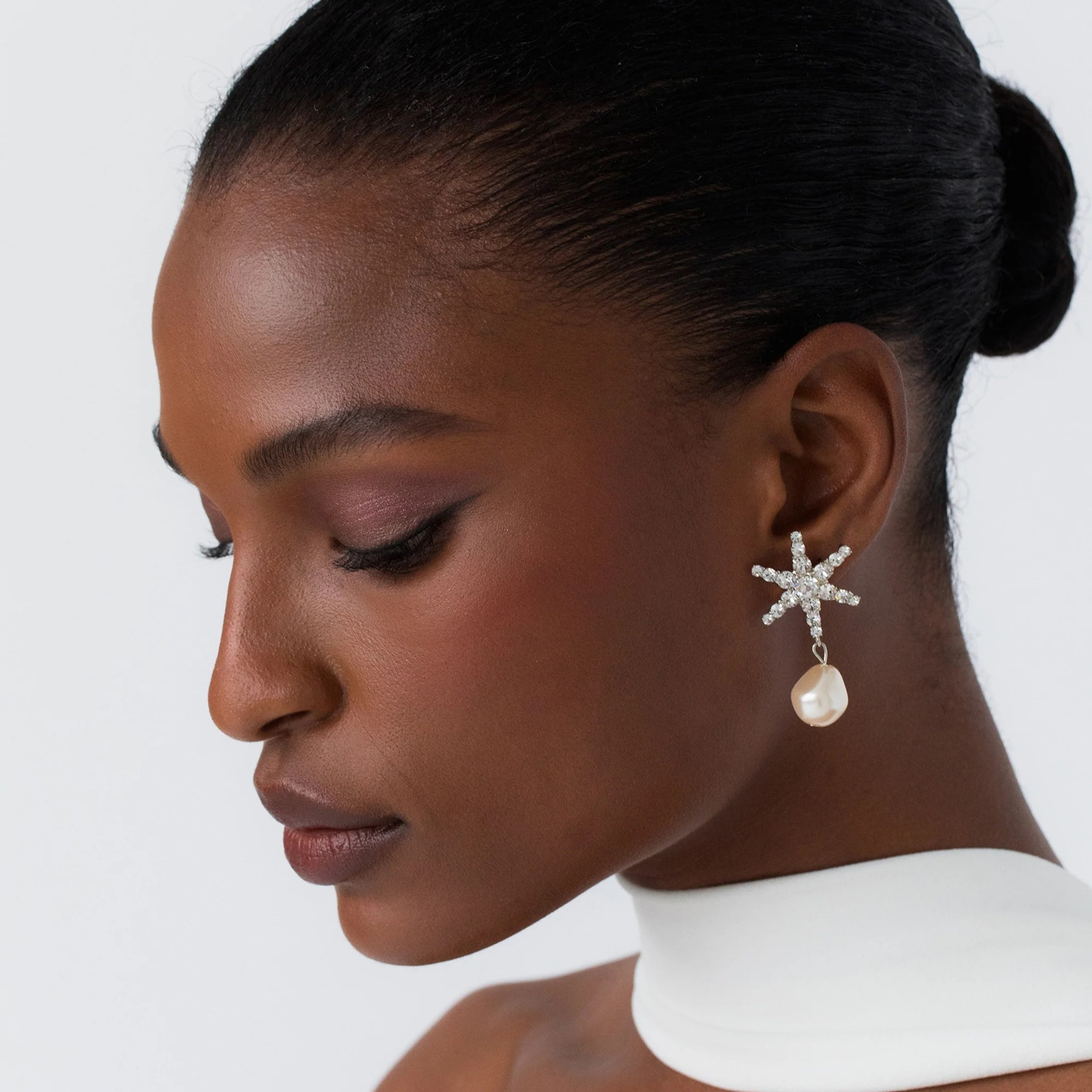 With their alluring movement, the celestial Aruna Earrings just may be the most beautiful pair in the Milky Way. They feature a crystal-set star, masterfully balanced with a baroque-style pearl drop. Made by hand in New York, the crystals are individually set by hand to maximize sparkle.