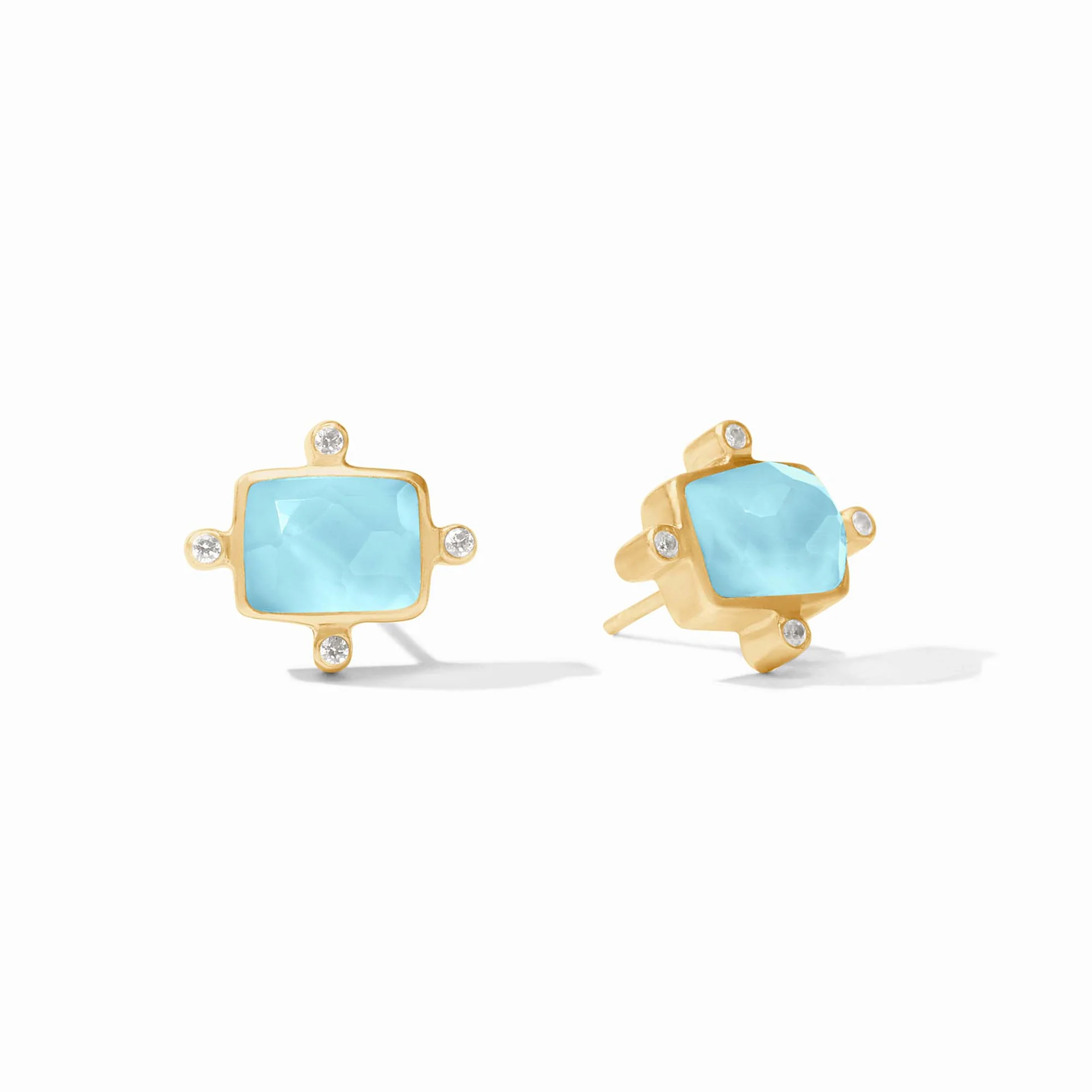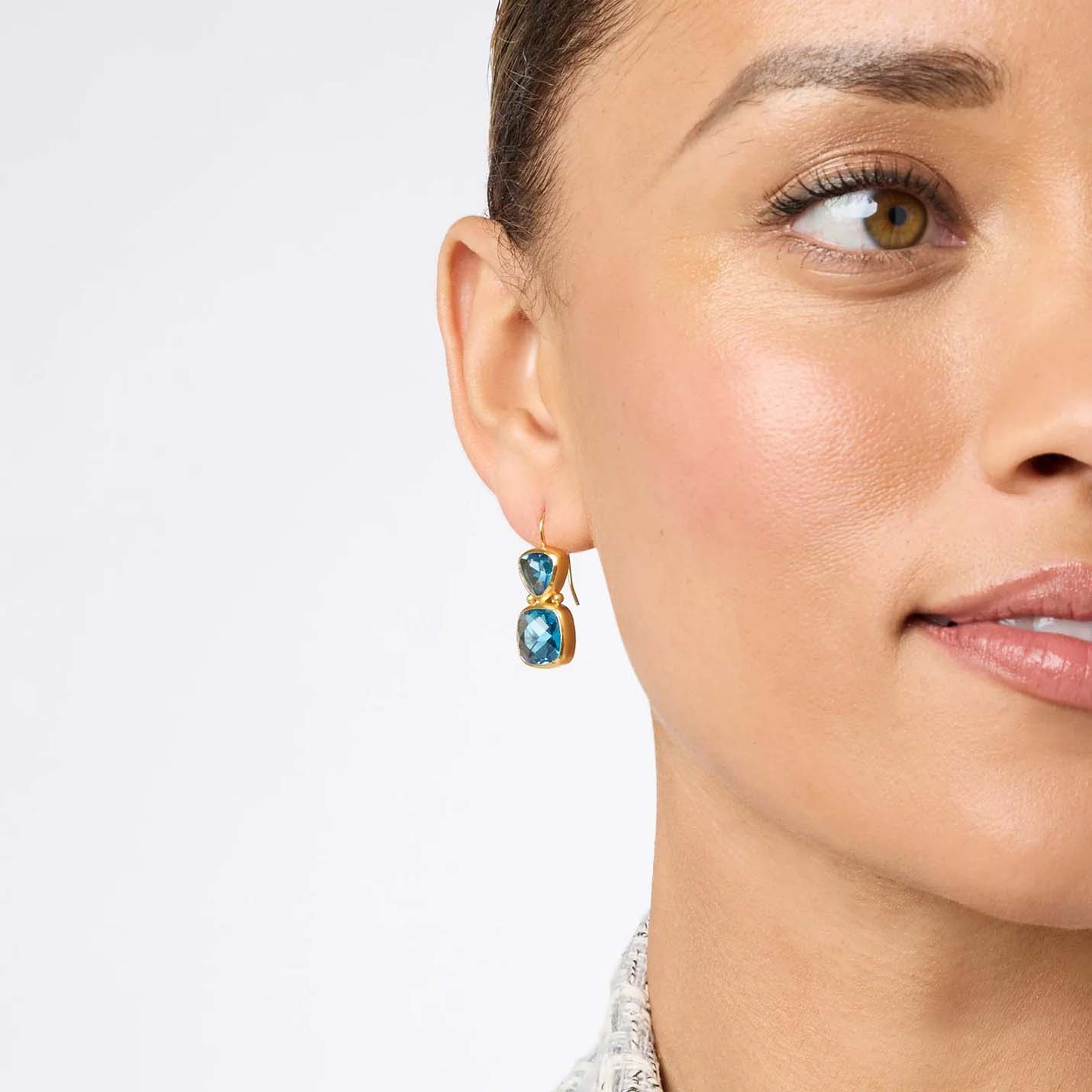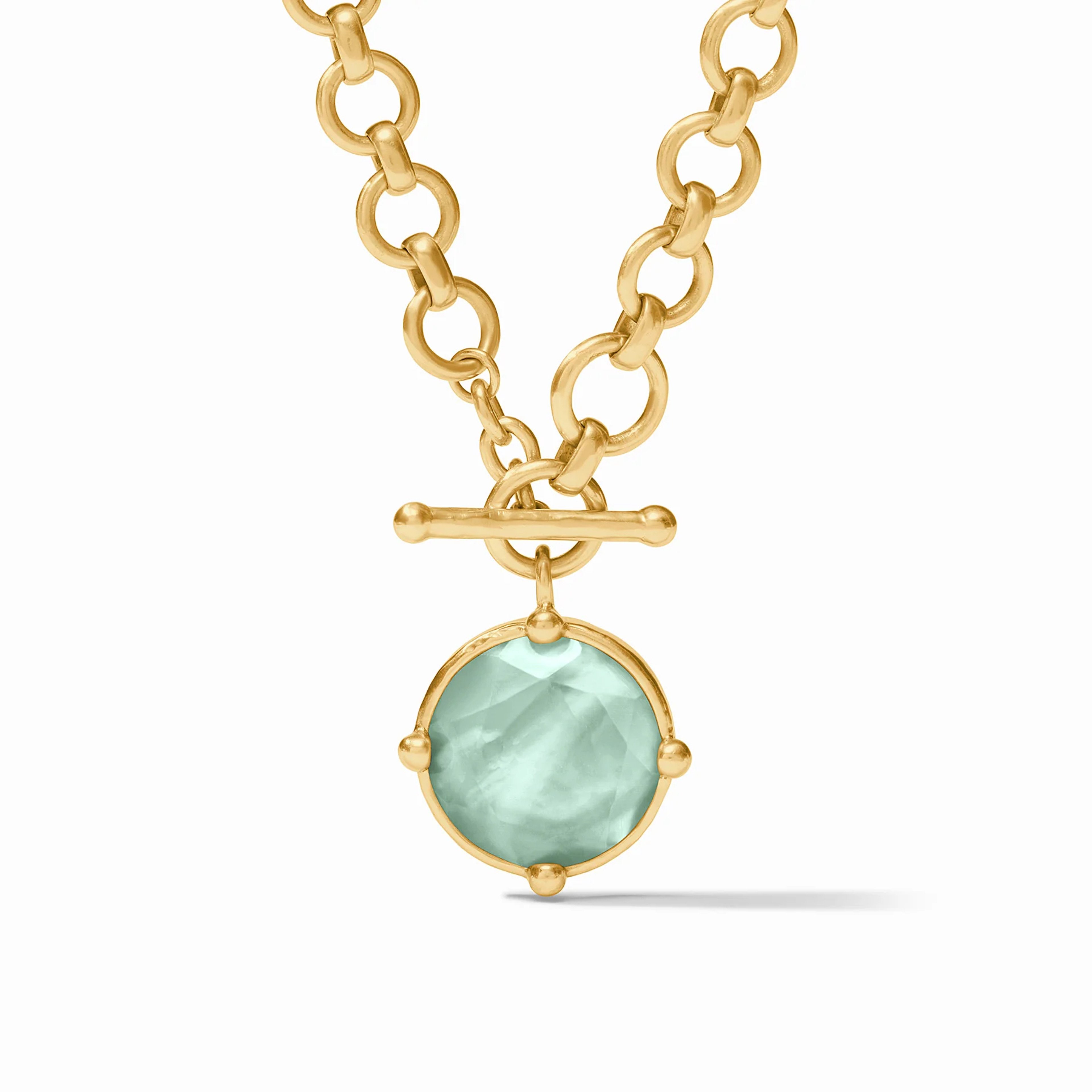 A trillion cut gemstone sits atop a larger stone in a rounded square shape, delicately connected with golden beads and suspended from an elegant French wire.