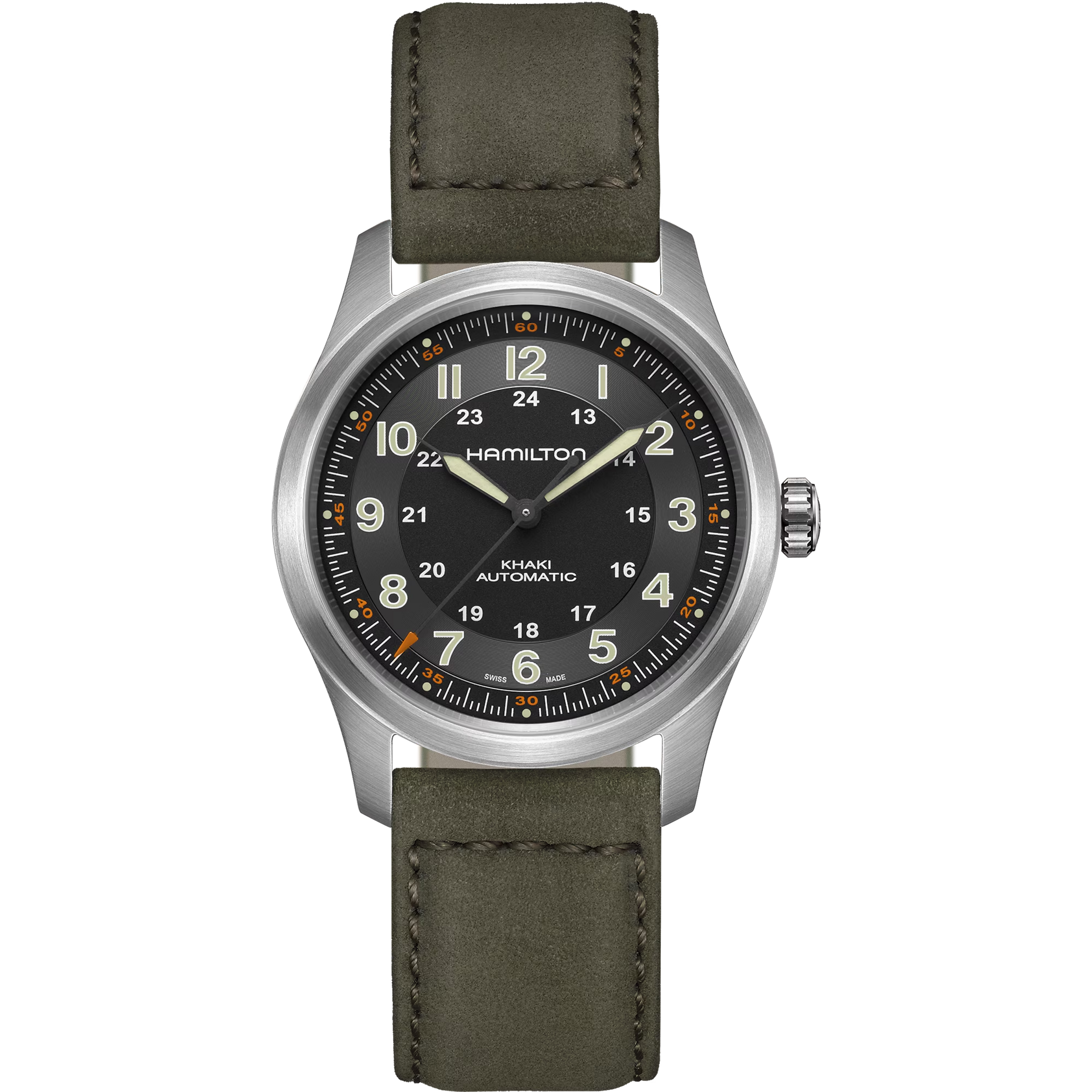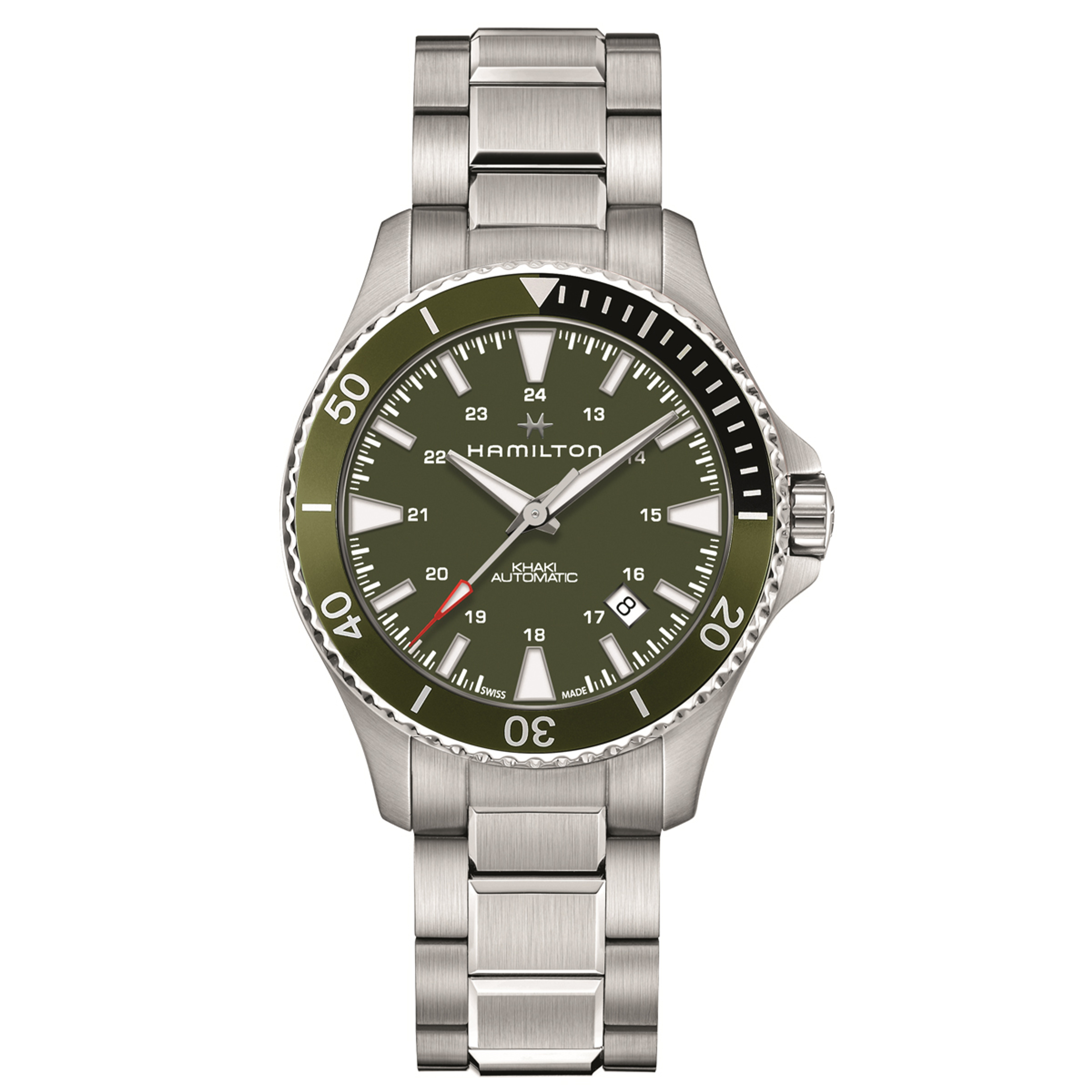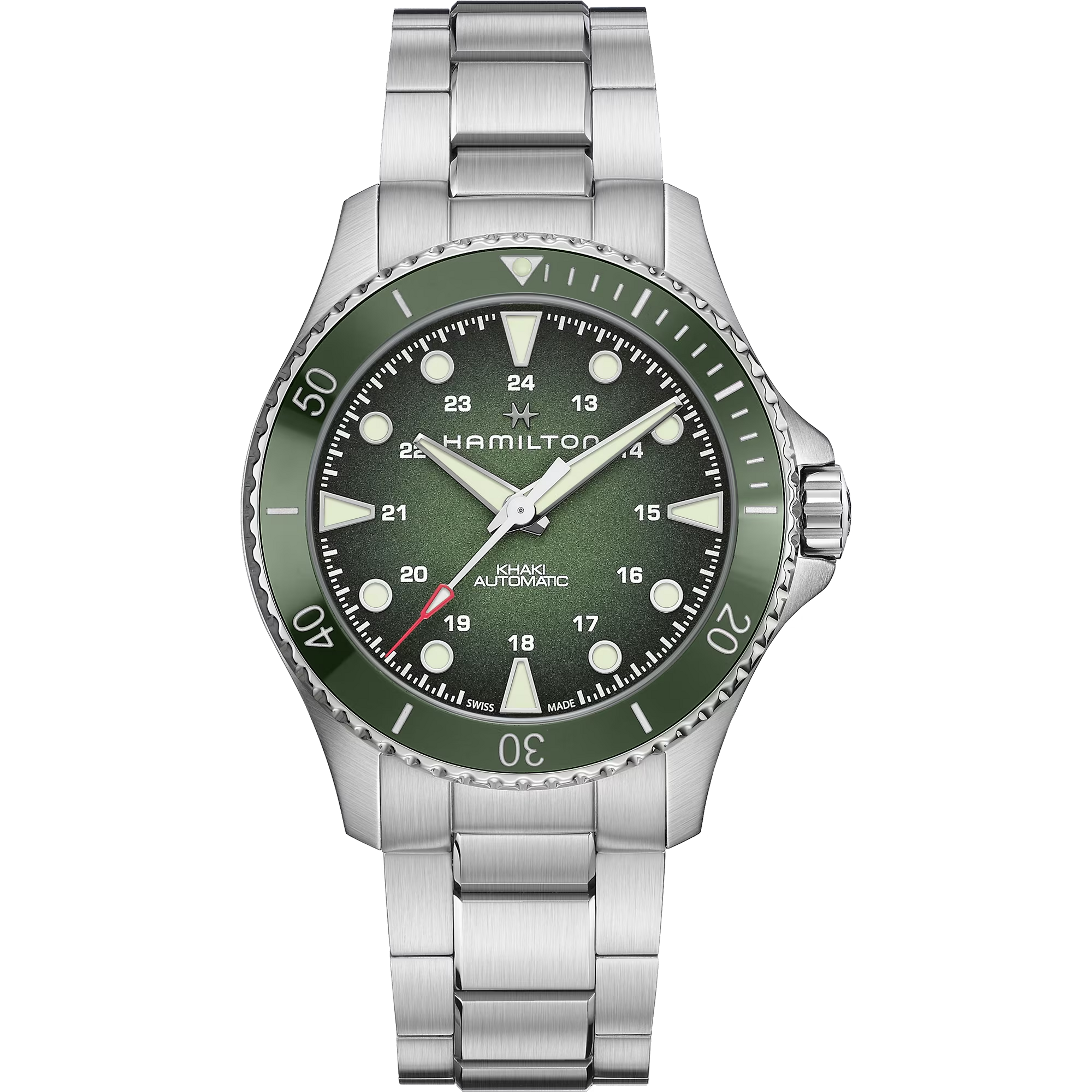 The 43mm Khaki Navy Scuba Automatic pairs a deep green ceramic bezel with a matching gradient dial, exposing a palette of shades from dark to forest green. Powered by our H-10 automatic movement, this timepiece is a perfect choice for those who appreciate form and function at once. Appealing and ubiquitous, the green colorway adds an edge to the Khaki Navy Scuba, making it a timeless companion for any challenge, from aquatic explorations to urban adventures.