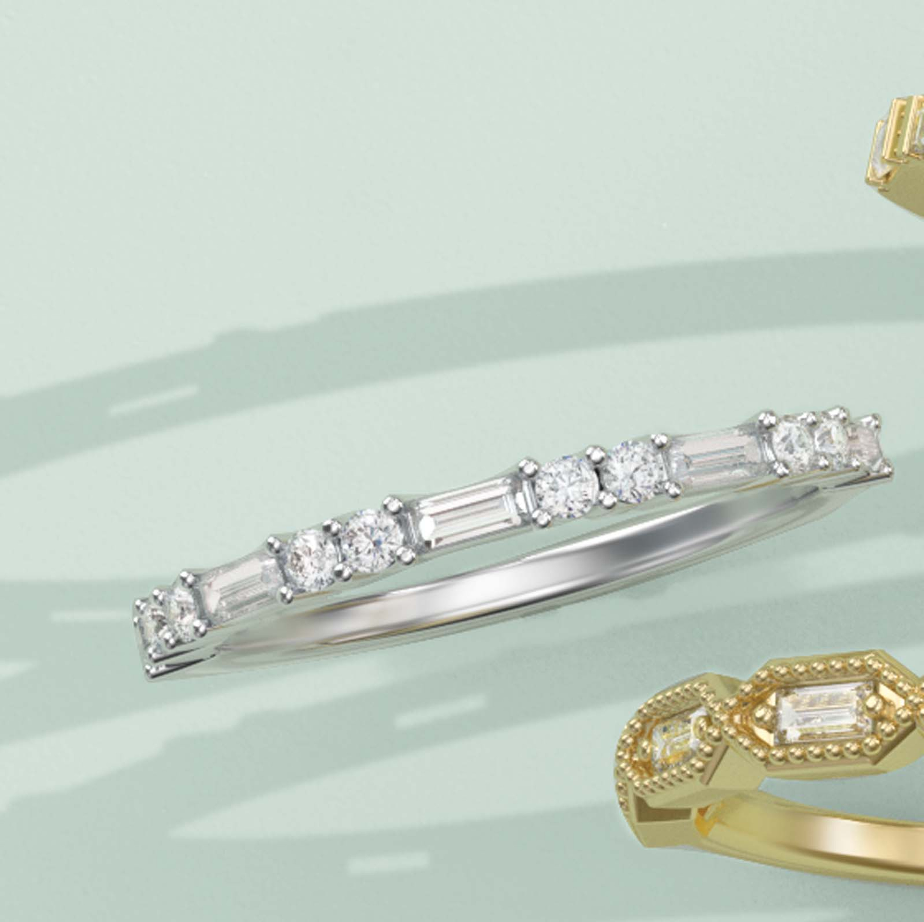 You and your partner are a matching set, just like the diamonds in this unique anniversary ring. Pairs of round cut diamonds are sprinkled across the top of the super sleek band, and a slender baguette diamond is nestled between each pair. This piece is perfect for stacking or making a statement on its own.