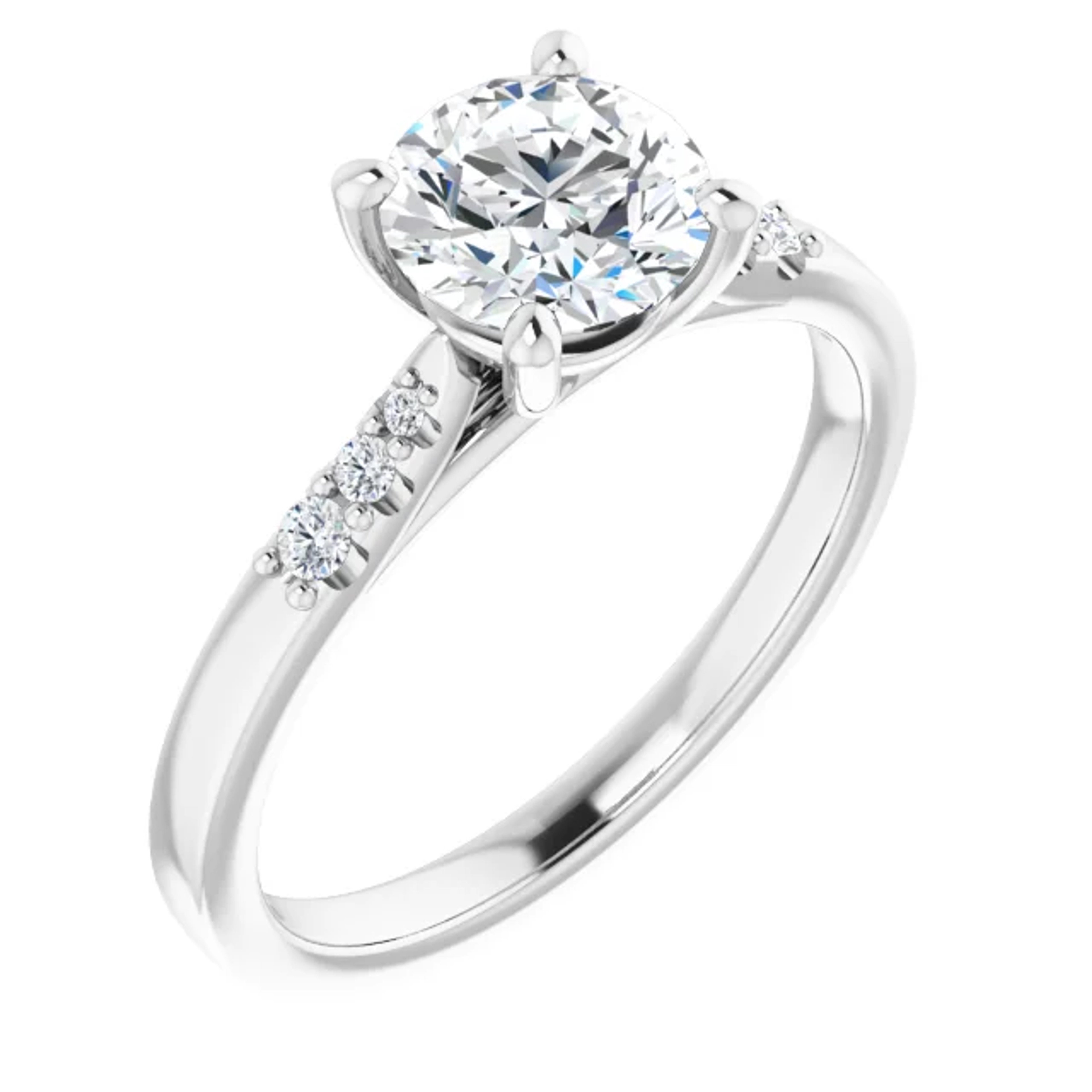 Support your partner like this straight ring setting supports its gem. In this cathedral engagement ring, the sides of the band extend upward toward your center stone of choice. Three round cut diamonds are delicately placed on both sides of the super sleek band, which completes the look.