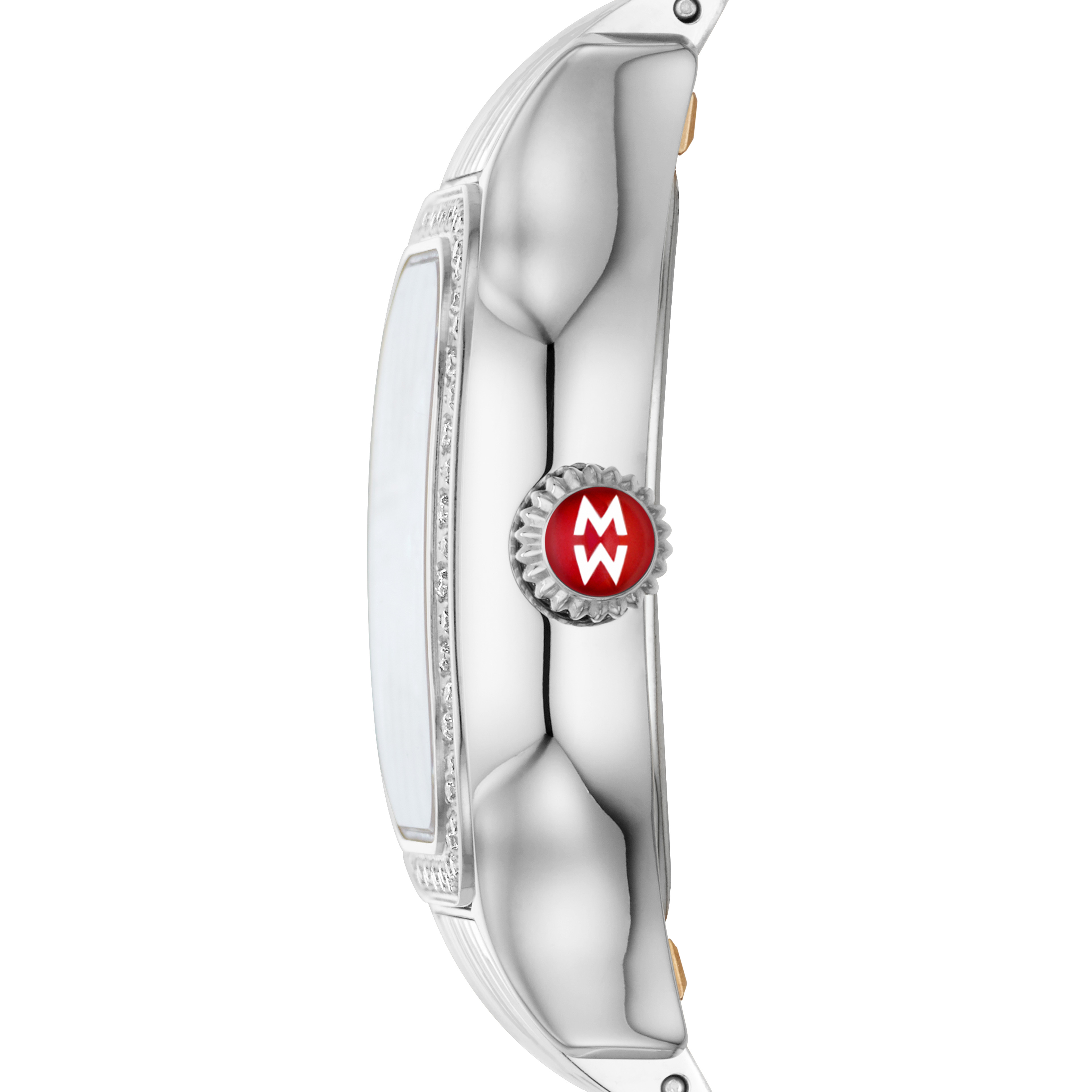 Elegant curves add modern elegance to the case of MICHELE's stunning Meggie watch that sparkles with 64 hand-set diamonds on the top ring in our signature MW pattern and a mother-of-pearl dial with diamond inner ring and signature double diamond indexes. This watch features a Swiss movement and a gleaming 14mm seven-link stainless steel bracelet made specifically for the Meggie collection interchangeable with any 14mm MICHELE strap.