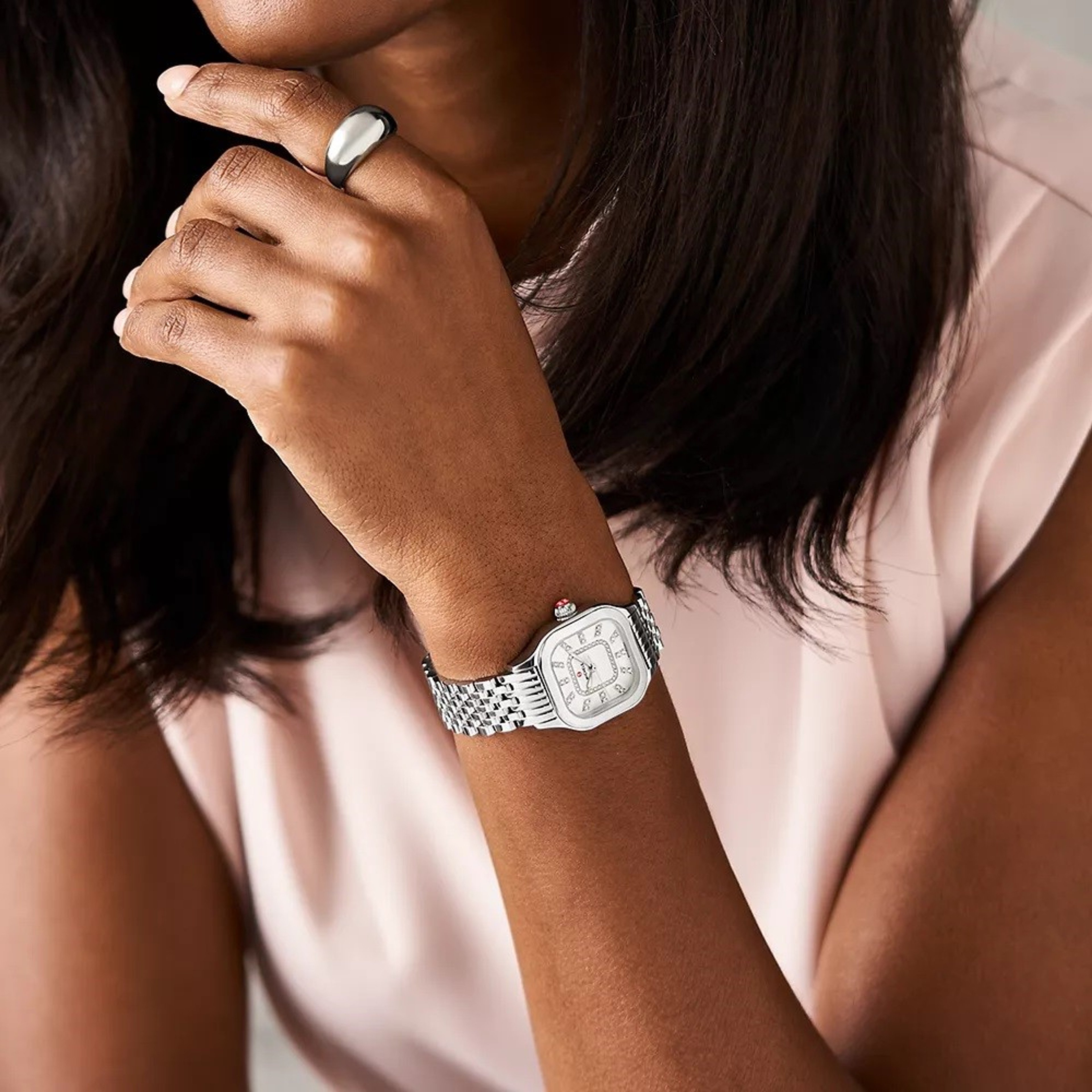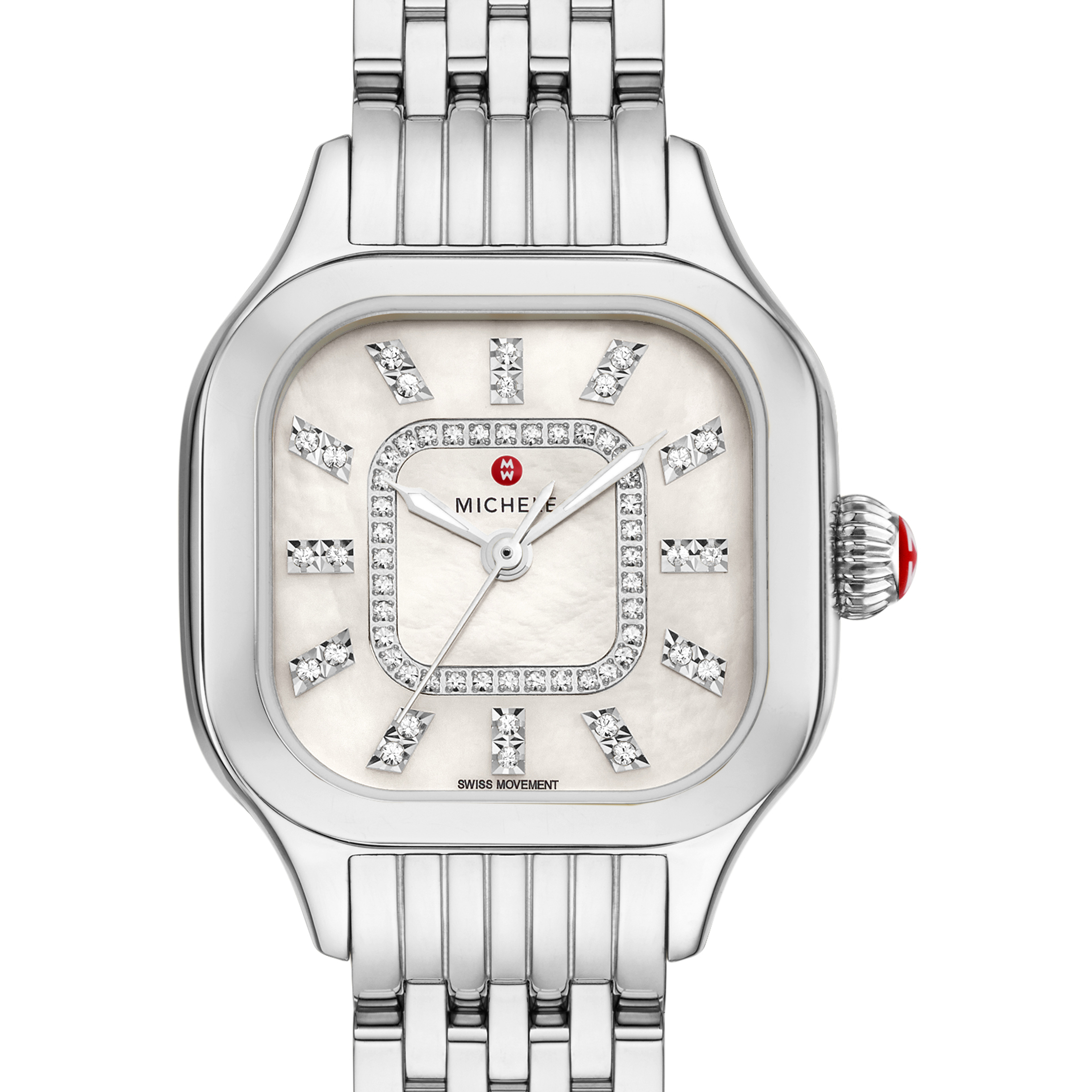 Elegant curves add modern elegance to the case of MICHELE's stunning Meggie watch that sparkles with 60 hand-set diamonds (0.19 carat weight) on the white mother-of-pearl dial with diamond inner ring and double diamond indexes. This watch features a Swiss movement and a gleaming 14mm seven-link stainless steel bracelet made specifically for the Meggie collection interchangeable with any 14mm MICHELE strap.