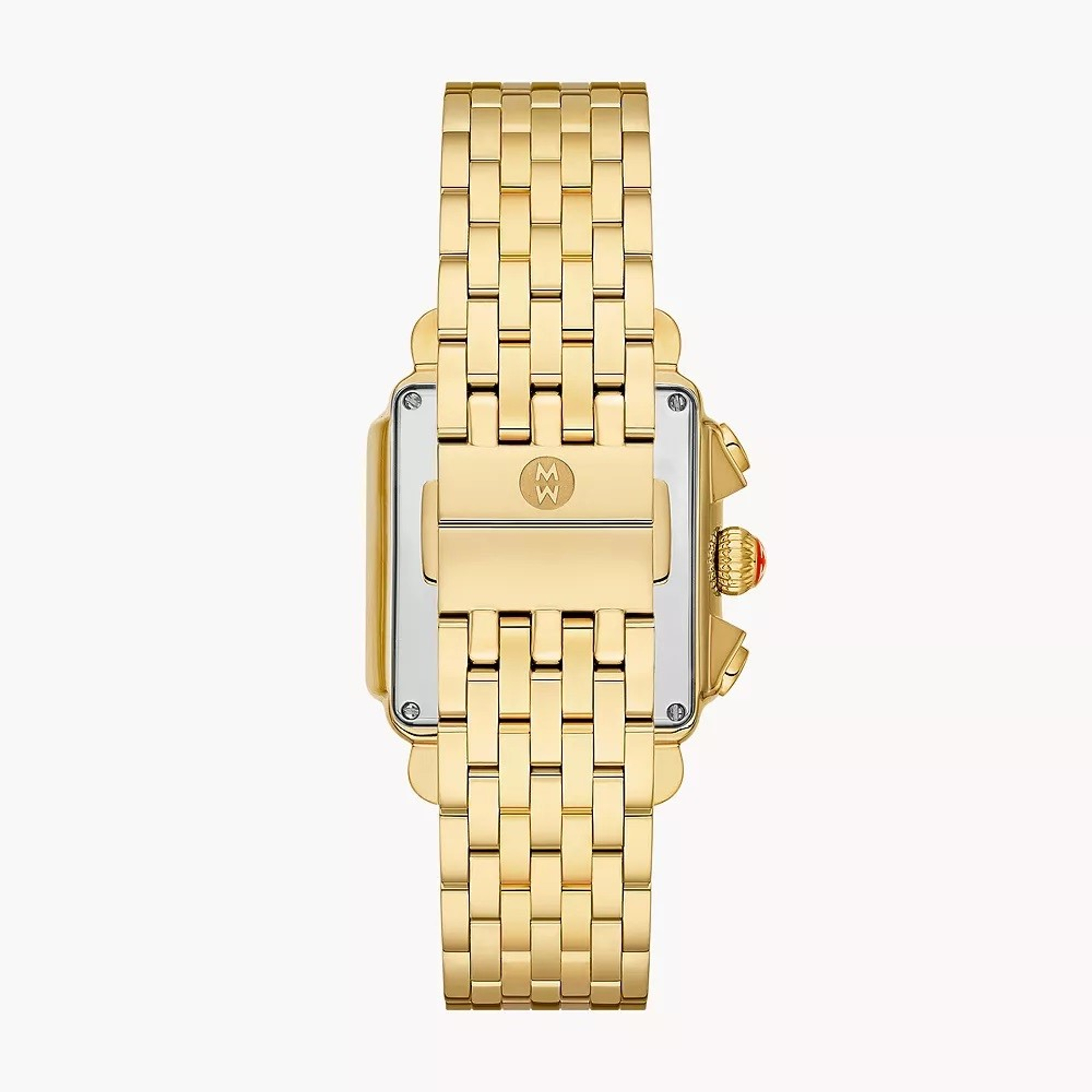 The rectangular case of the Deco 18k gold diamond watch reflects the geometric shapes identified with Art Deco architecture. This iconic Swiss chronograph timepiece features 120 brilliant hand-set diamonds (0.66 carat weight) along the bezel and mother-of-pearl dial, three subeyes accented with gold foil and engraved MICHELE logos within the case walls. An 18k gold plated seven-link bracelet adds the finishing touch and is interchangeable with any 18mm MICHELE strap.