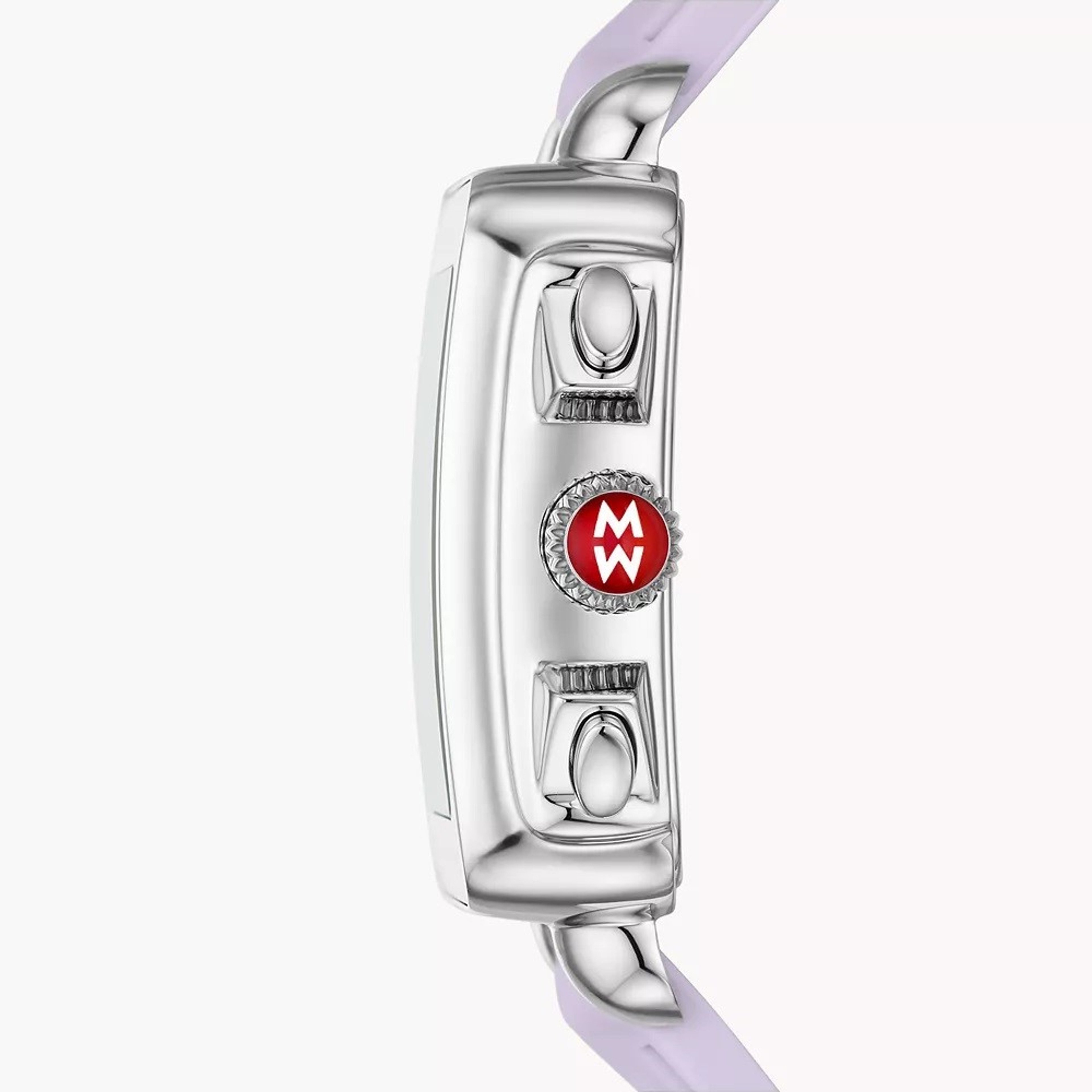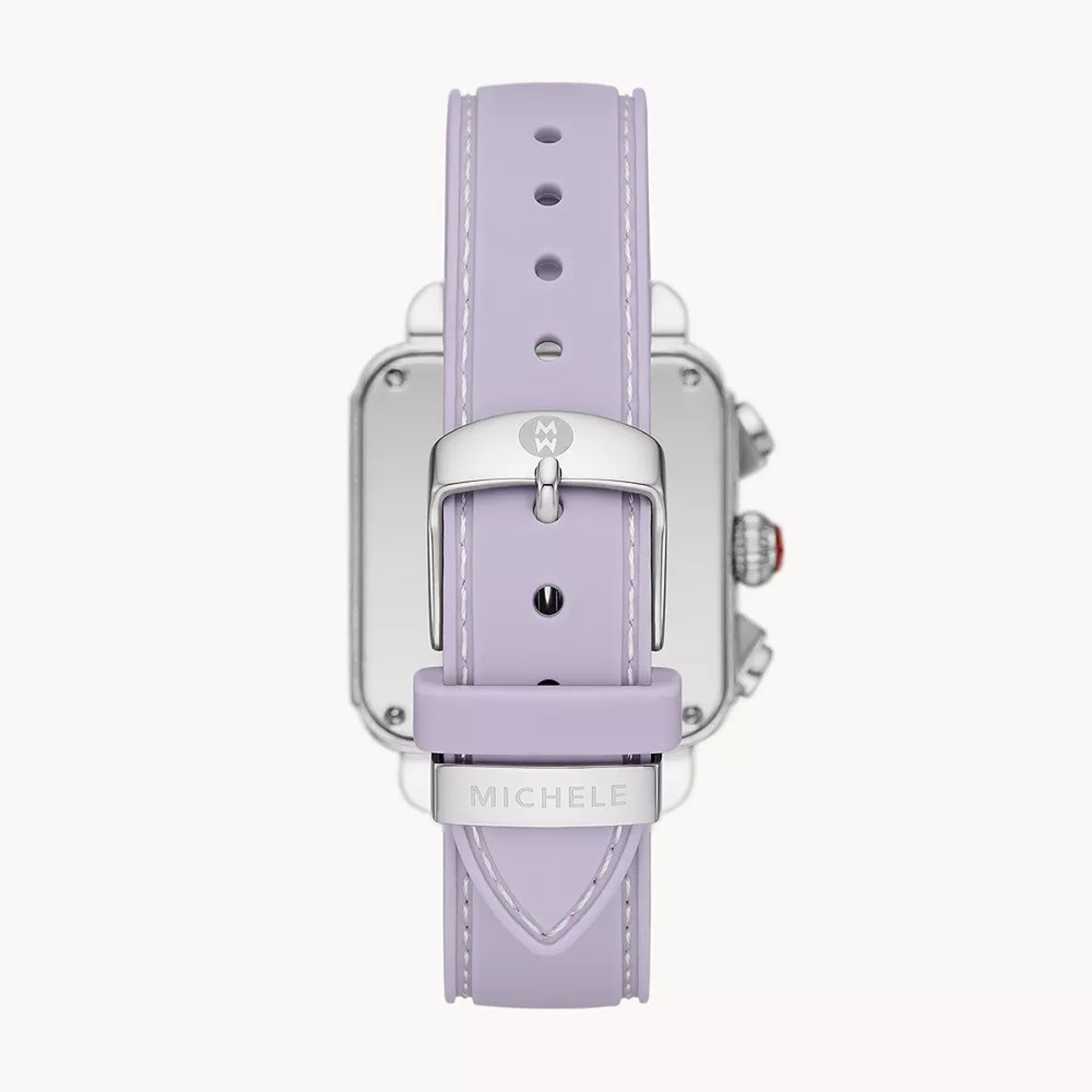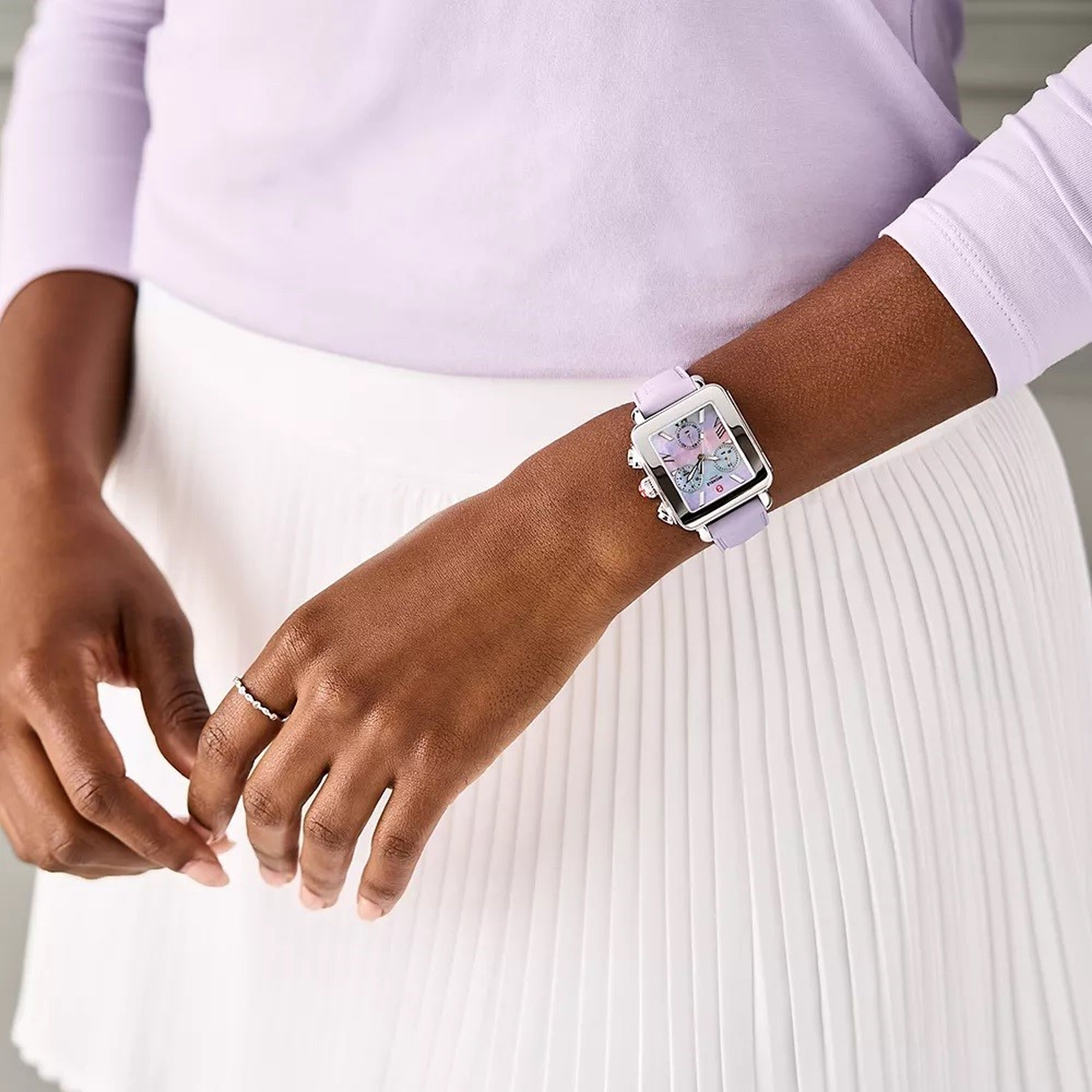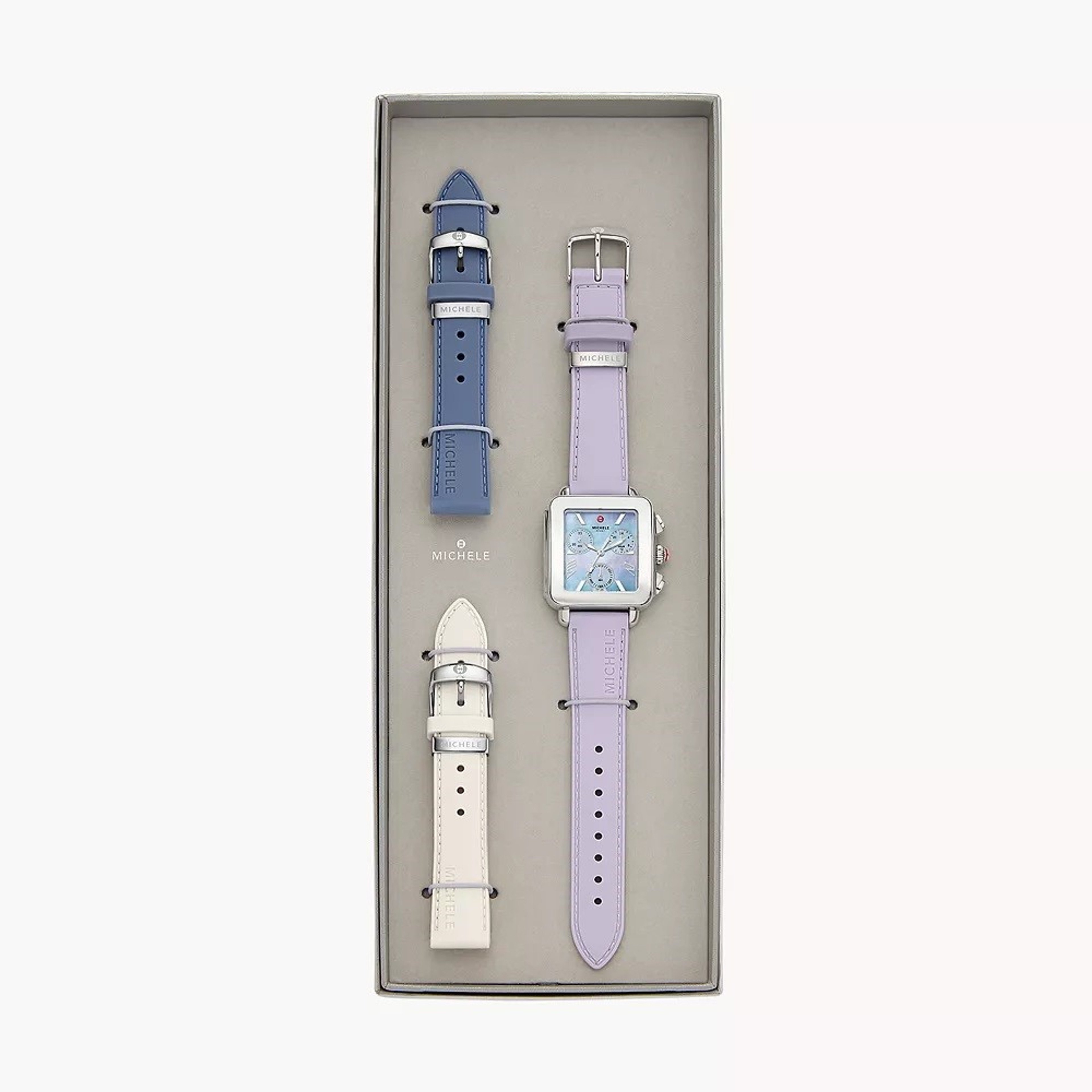 This Deco Sport Watch gift set includes a Deco Sport Chronograph watch featuring a stainless steel case and an Ombré-effect mother-of-pearl dial with straps in gentle lavender, blue dusk and chalk silicone. The 18mm straps are made specifically for the Deco collection and is interchangeable with any 18mm MICHELE straps.