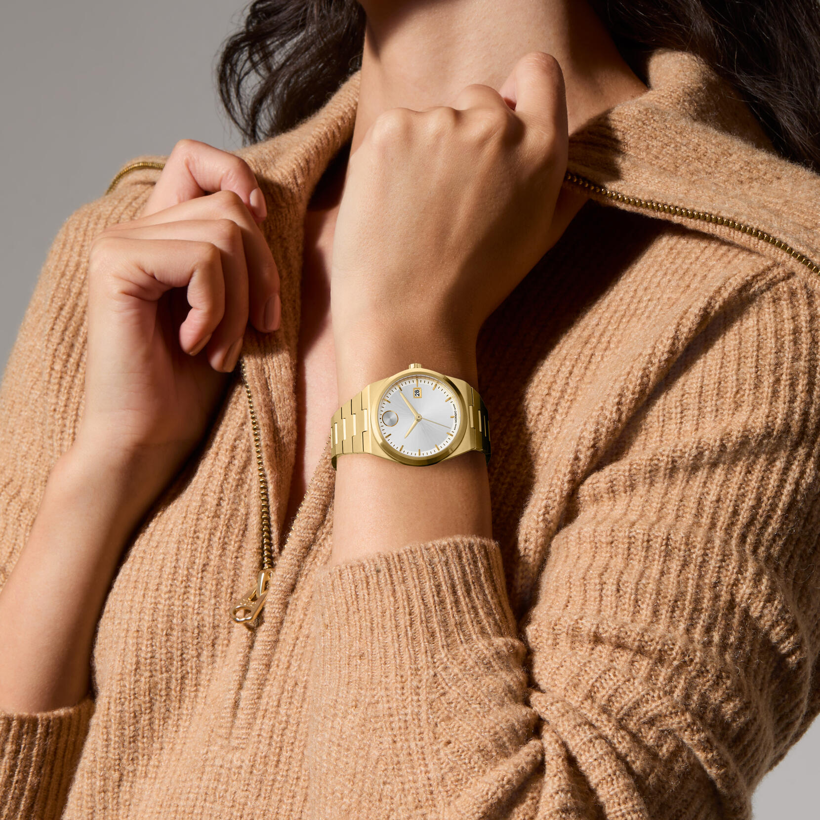 This 40mm watch features a black sunray dial, yellow goldtone hands, and our signature dot at 12 o'clock.
