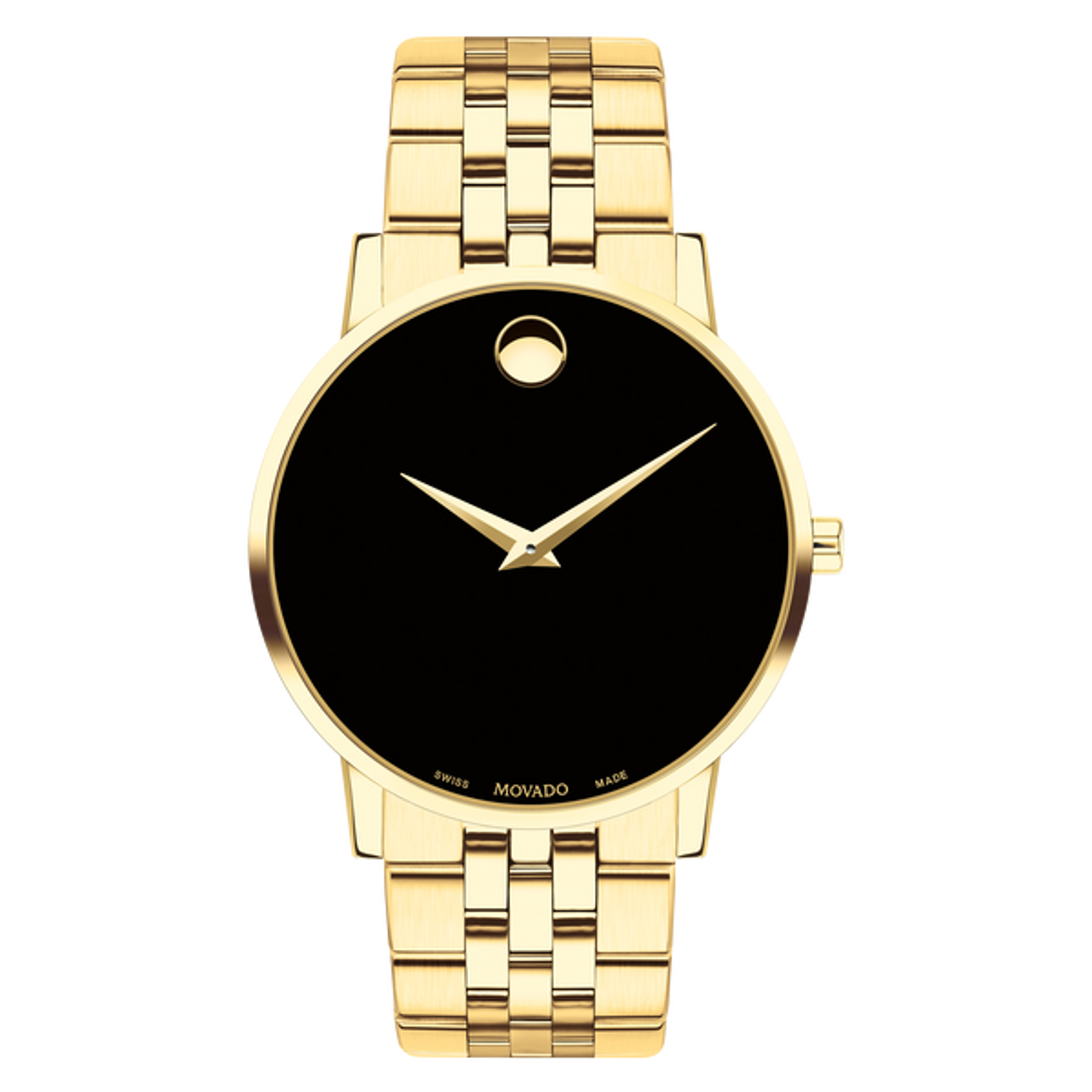 Men's Museum Classic watch, 40 mm yellow gold PVD-finished stainless steel case, black Museum dial with gold-toned dot and hands, yellow gold PVD-finished stainless steel link bracelet with deployment clasp.