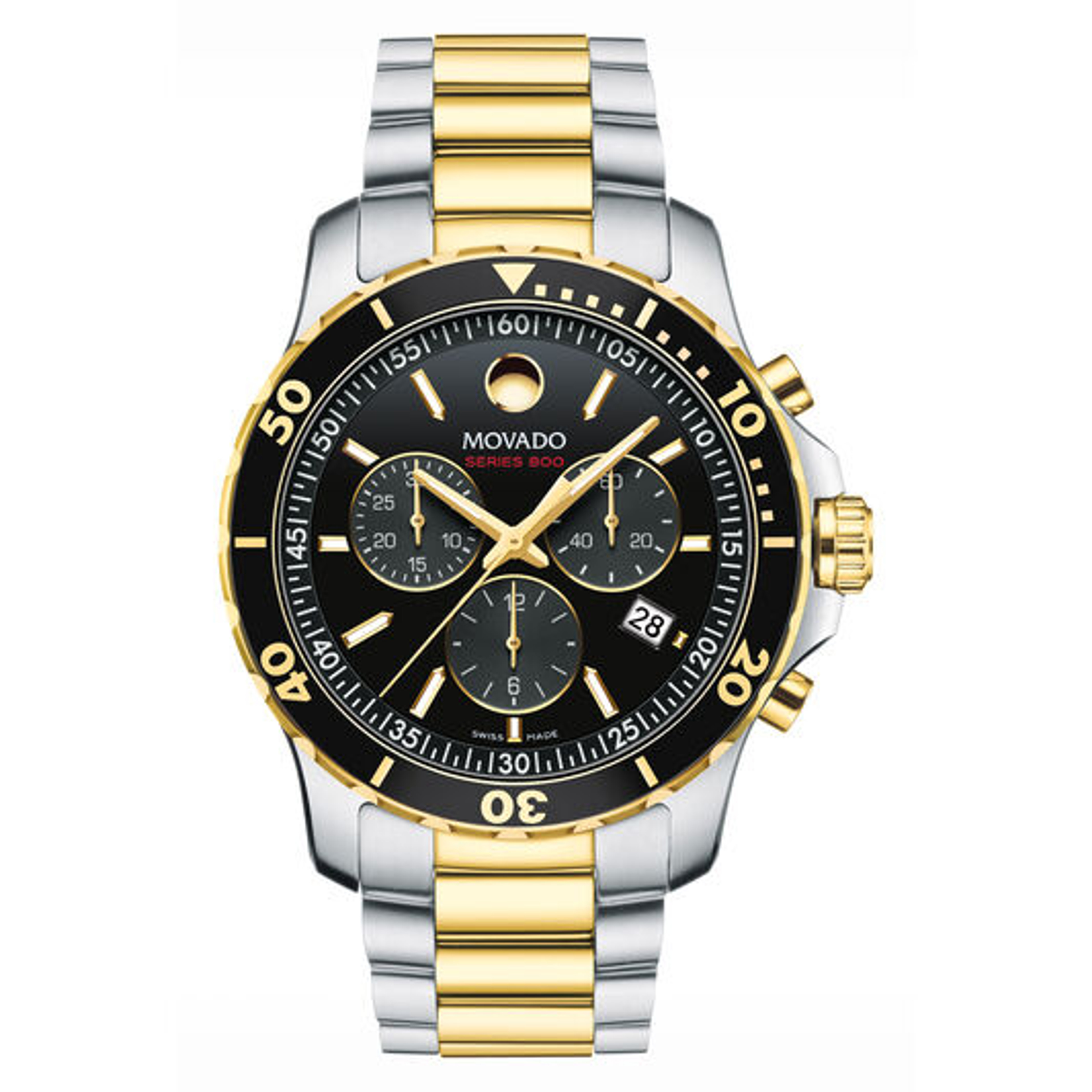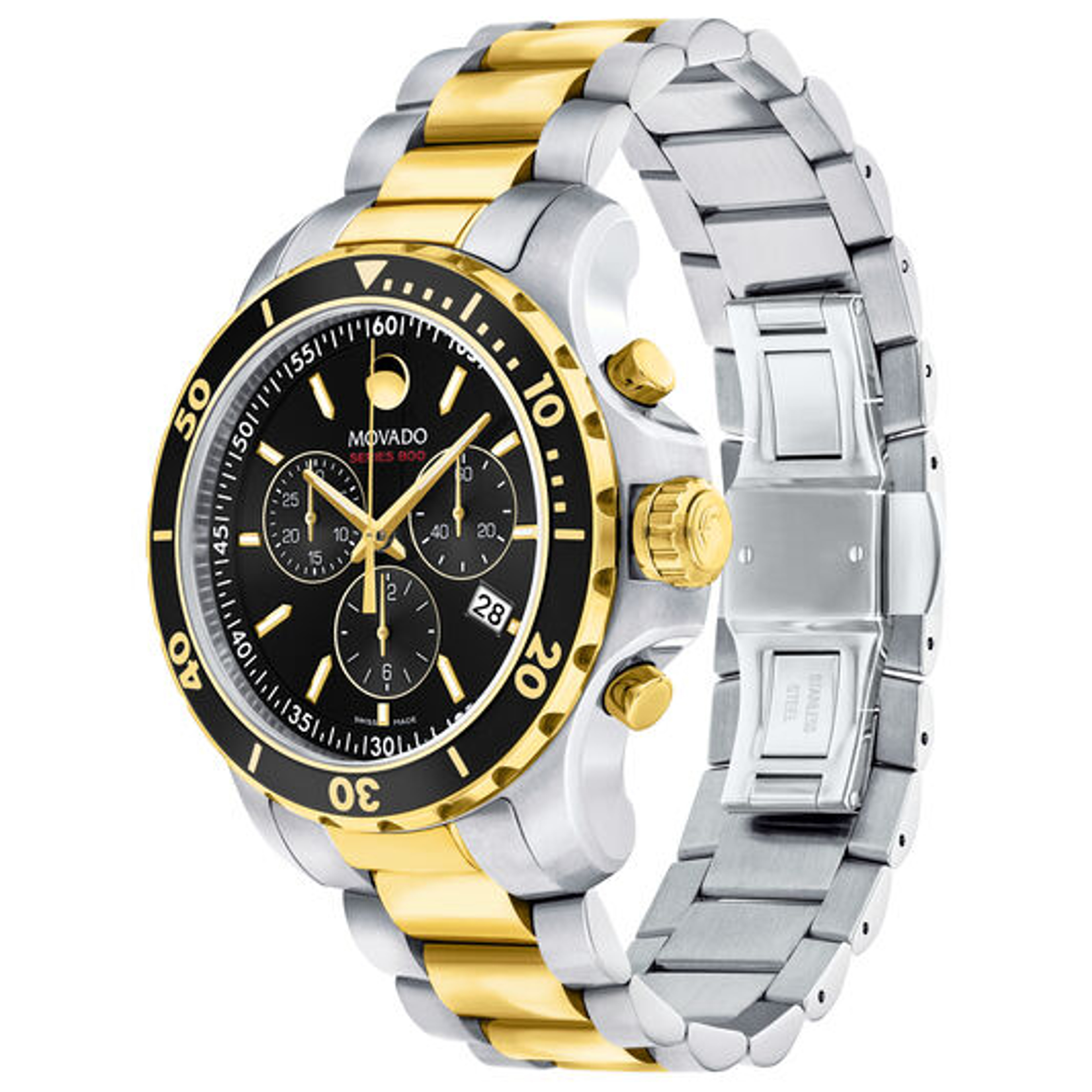 Men's series 800 watch, 42 mm stainless steel and yellow gold PVD-finished case with black aluminum unidirectional bezel, screw-down crown, round black dial with 3 matching timing subdials, gold-toned signature dot, hands and applied stick markers, printed Arabic minute index, and date display, stainless steel and yellow gold PVD-finished link bracelet with push-button deployment clasp.