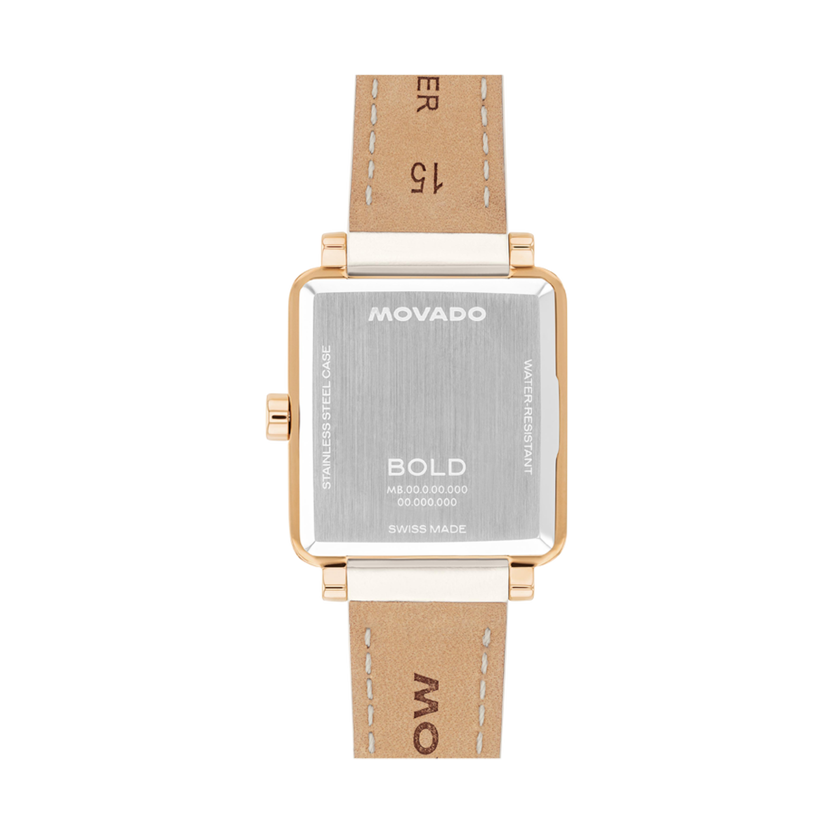This 28mm x 26mm square watch features a white lacquer dial, slim rose gold-tone hands, and our signature dot at 12 o'clock.