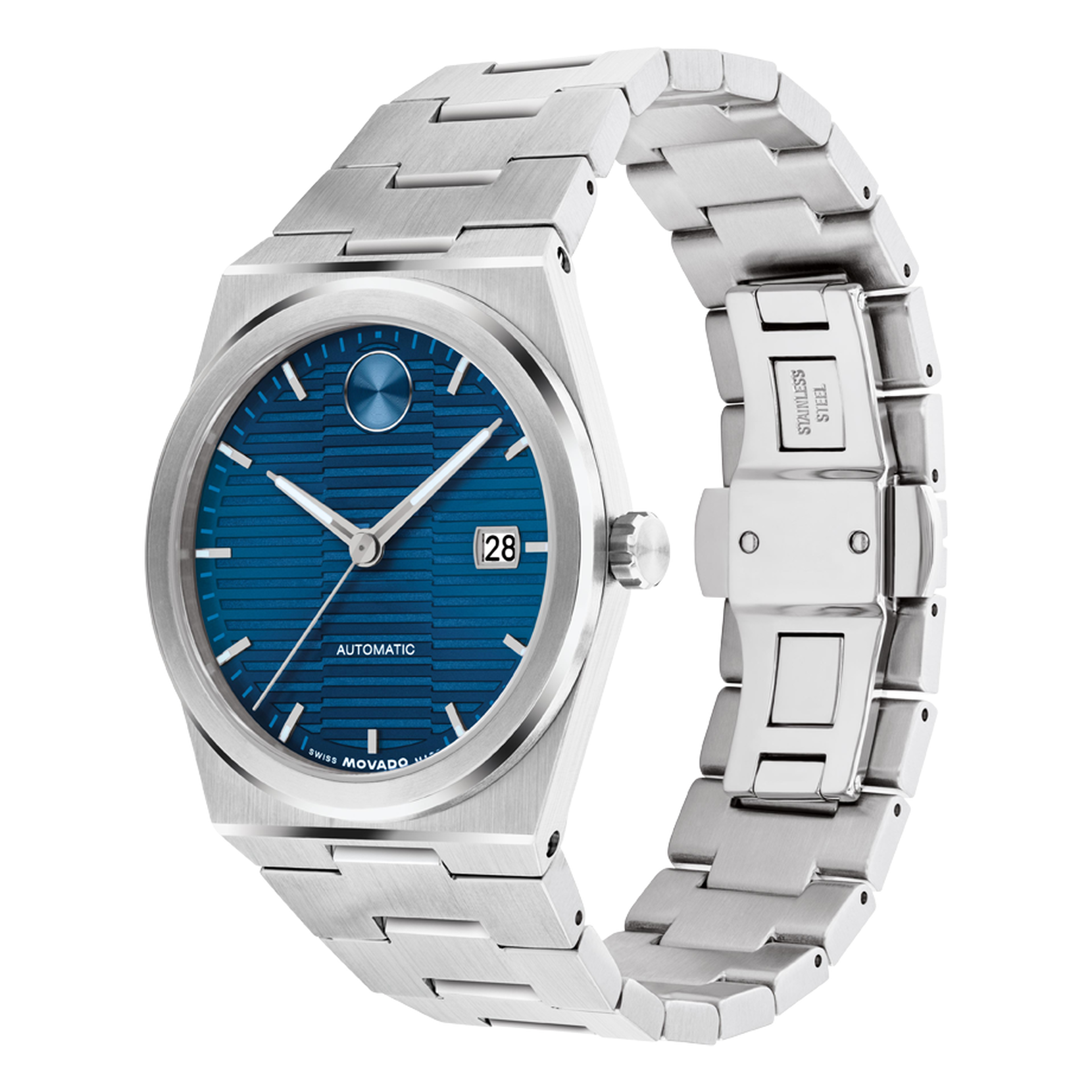 This 39mm watch features a moonlight blue dual texture dial, stainless steel hands, an exhibition caseback, and our signature dot at 12 o'clock.