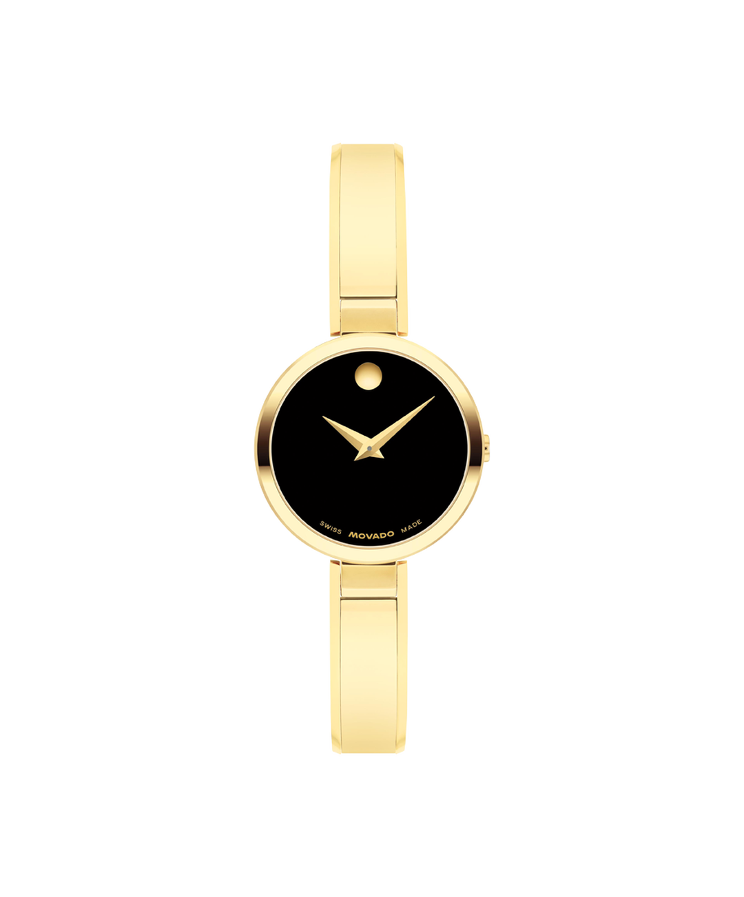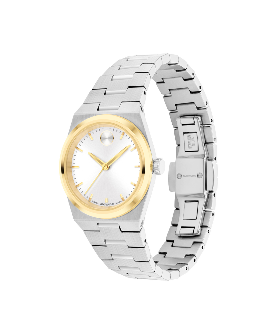 This 28mm watch features a white sunray dial, yellow gold tone hands, and our signature dot at 12 o'clock.