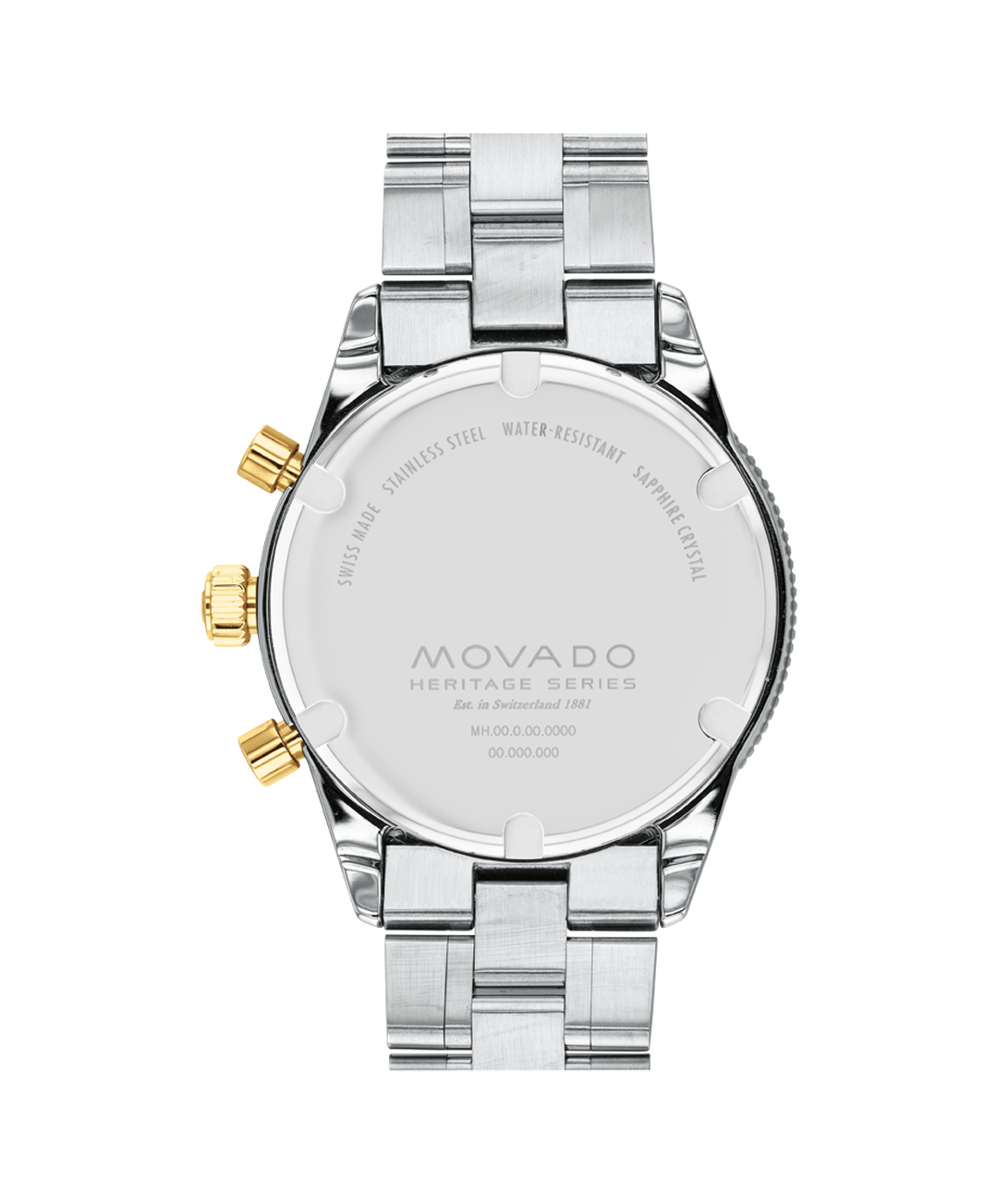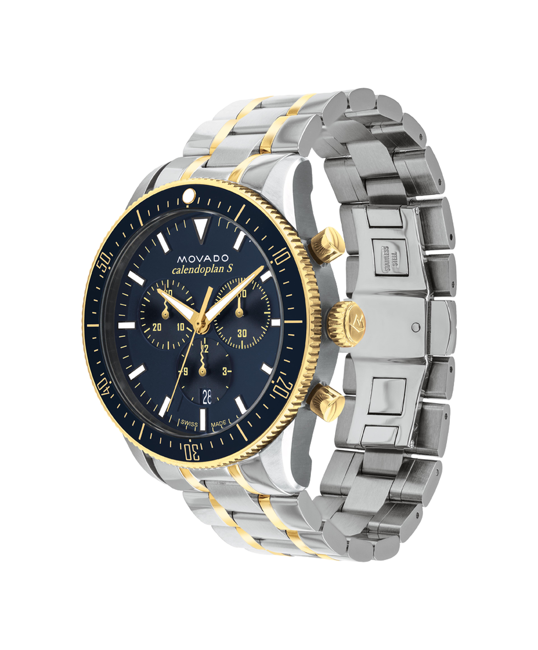 Heritage Calendoplan S Chronograph, 42mm stainless steel and pale yellow gold ion-plated case and bracelet with a navy blue chronograph dial & unidirectional bezel.