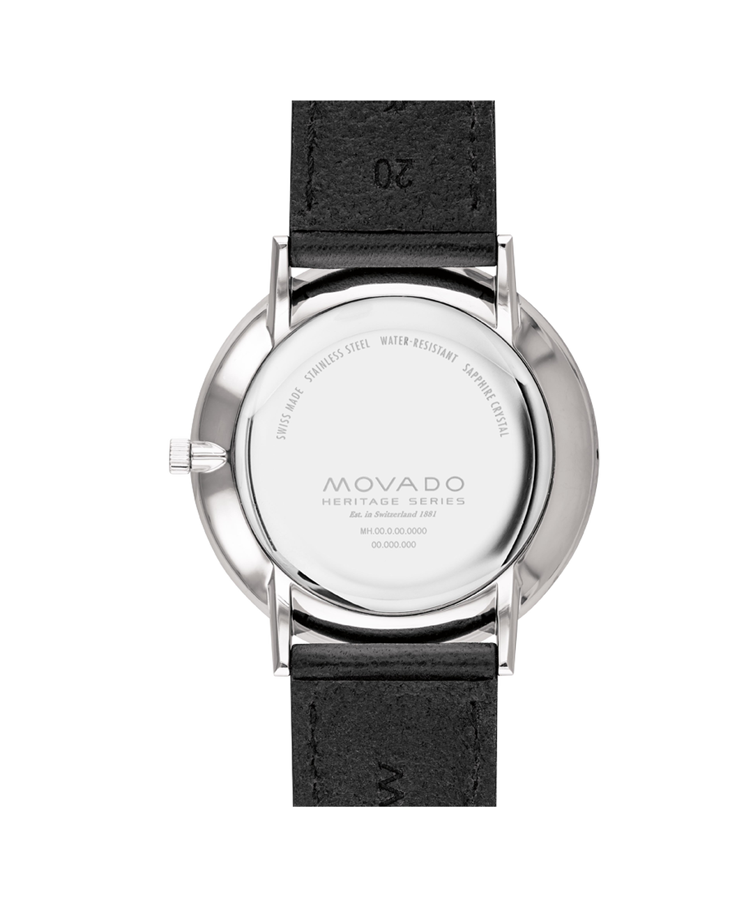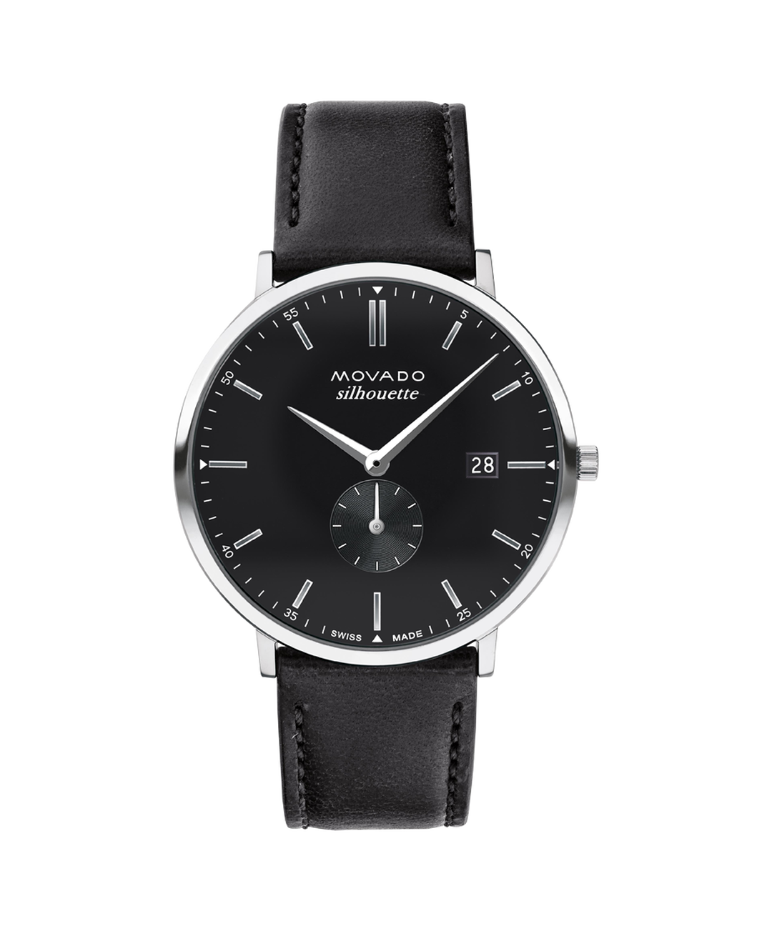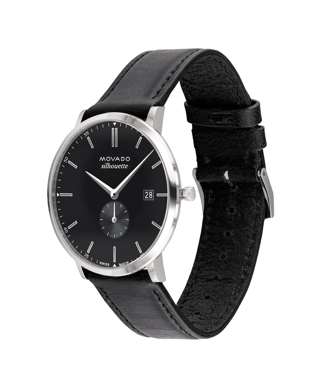 Heritage Silhouette, 40 mm stainless steel case with fluidly extended lugs, round black 2-hand dial with sub dial, luminescent silver-toned hands and applied markers, printed white minute index, and date display, Black top-stitched leather strap with classic stainless steel buckle.