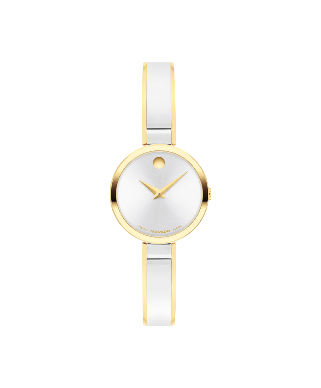 This 24mm watch features a silver white sunray dial, yellow gold tone dauphine hands, and a bangle bracelet.