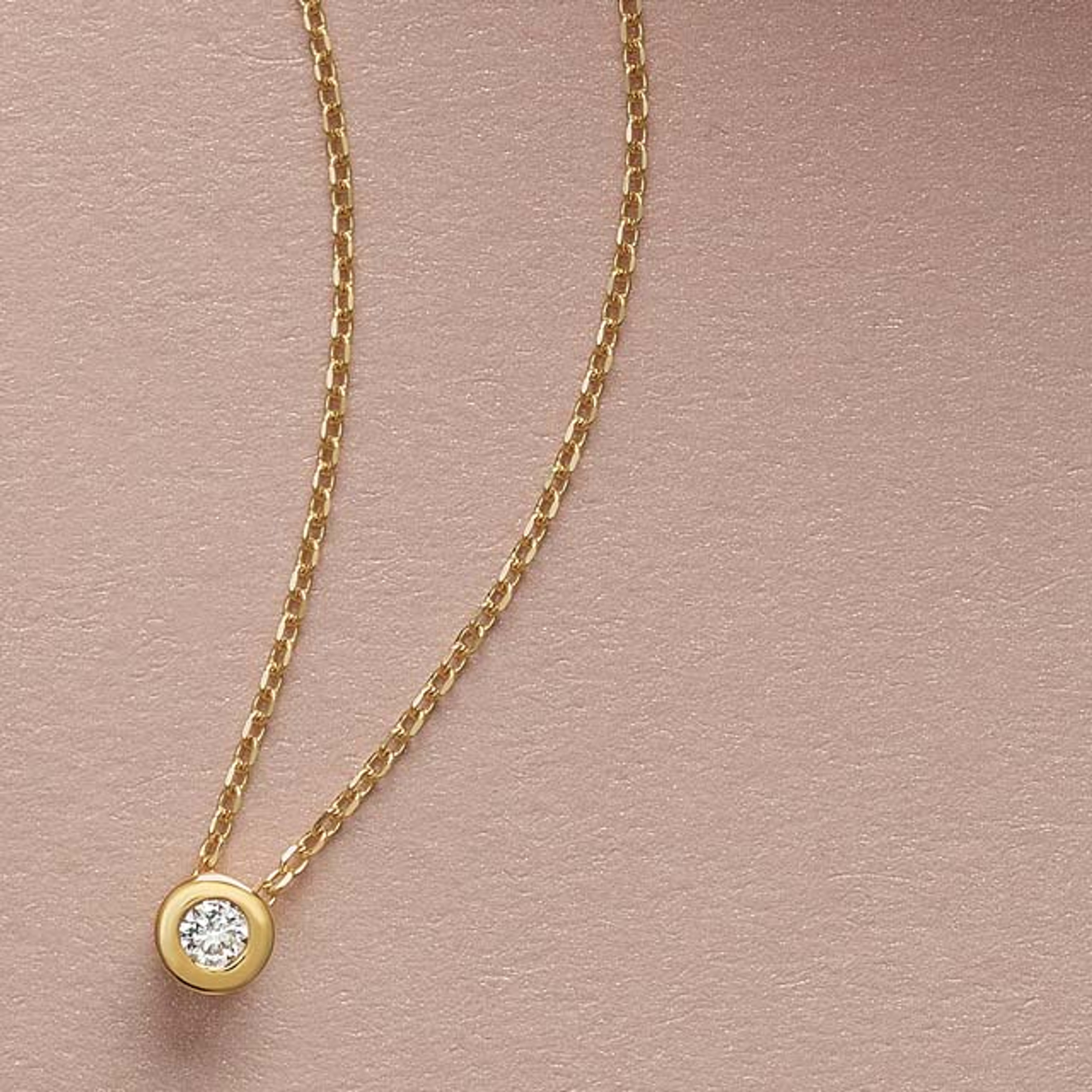 A dazzling 1/4 CT bezel-set diamond is delicately suspended from an adjustable 14K gold diamond-cut cable chain in this glamourous pendant necklace.