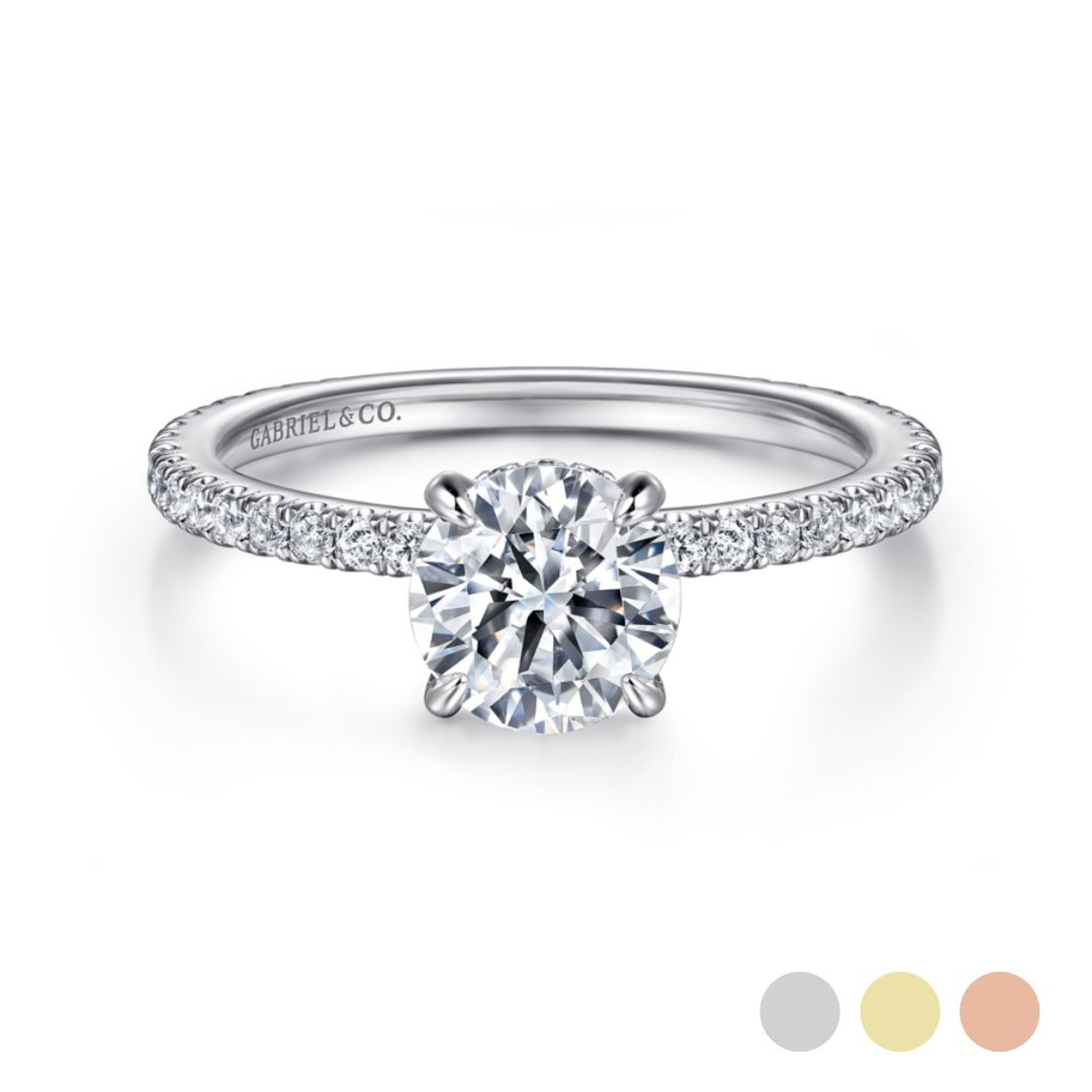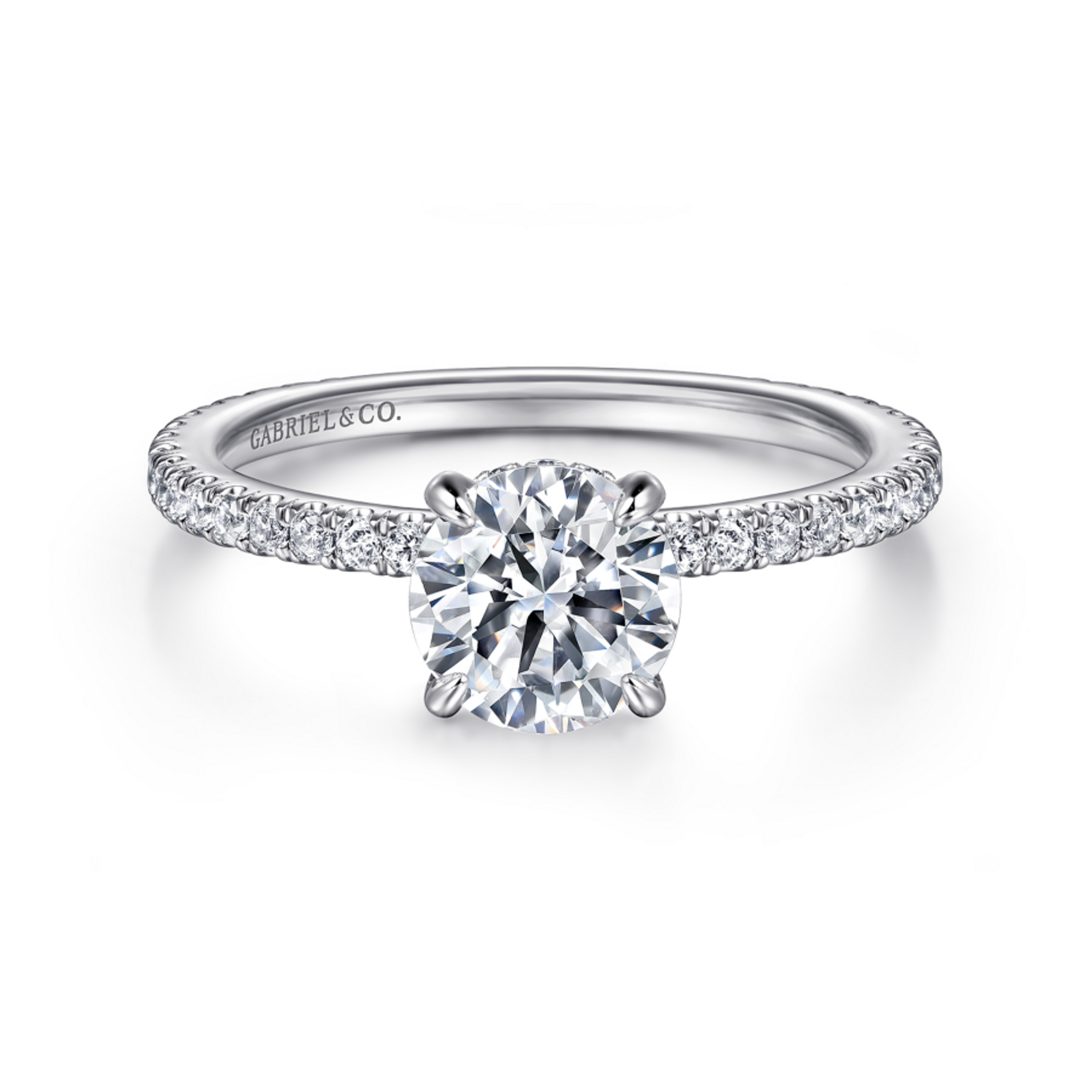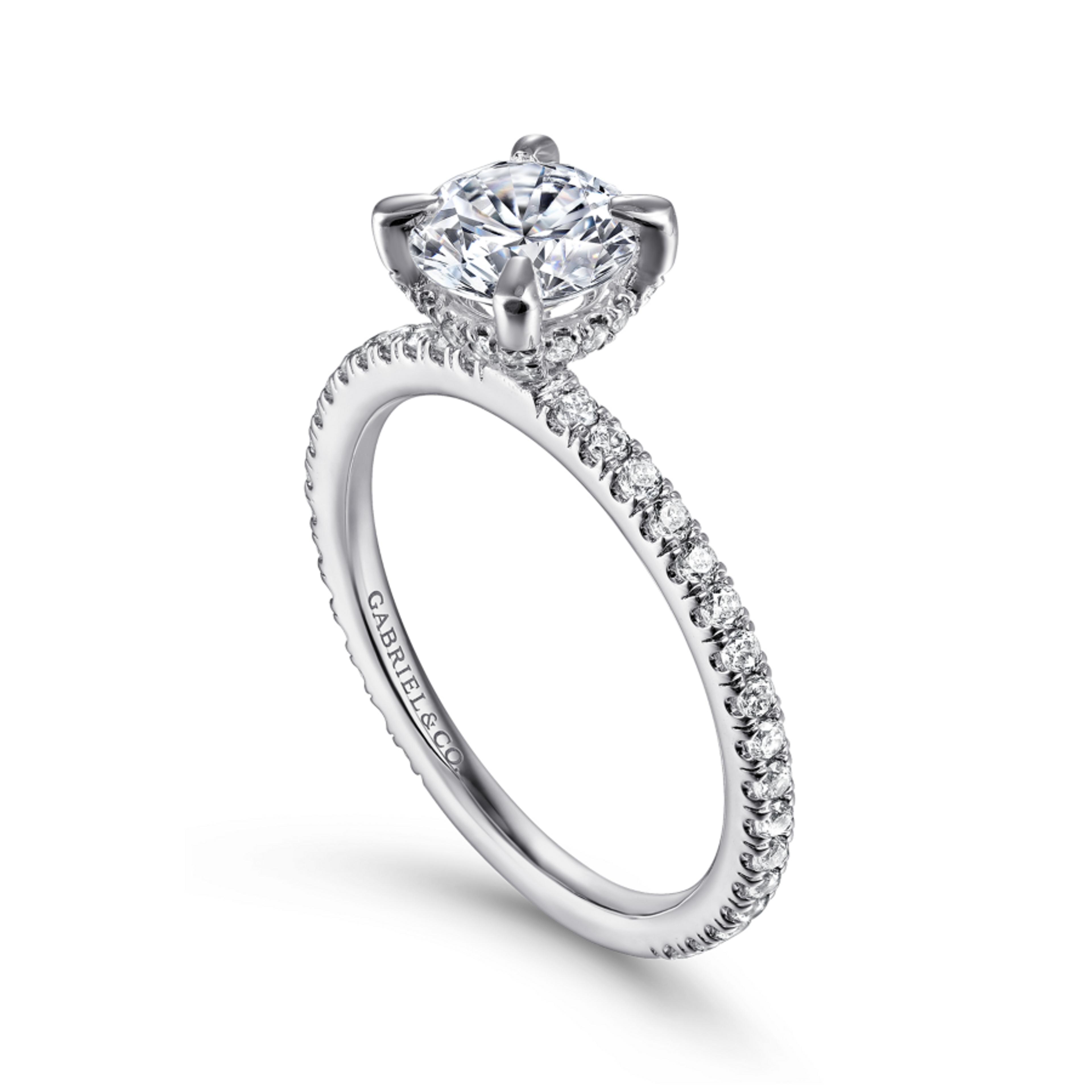 Allow your chosen center stone to truly shine with this understated diamond setting. Pavé set accent diamonds outline almost the entire shank which has a classic slim and straight silhouette. Surprise diamonds on the basket put the finishing touch on this skillfully crafted engagement ring setting.