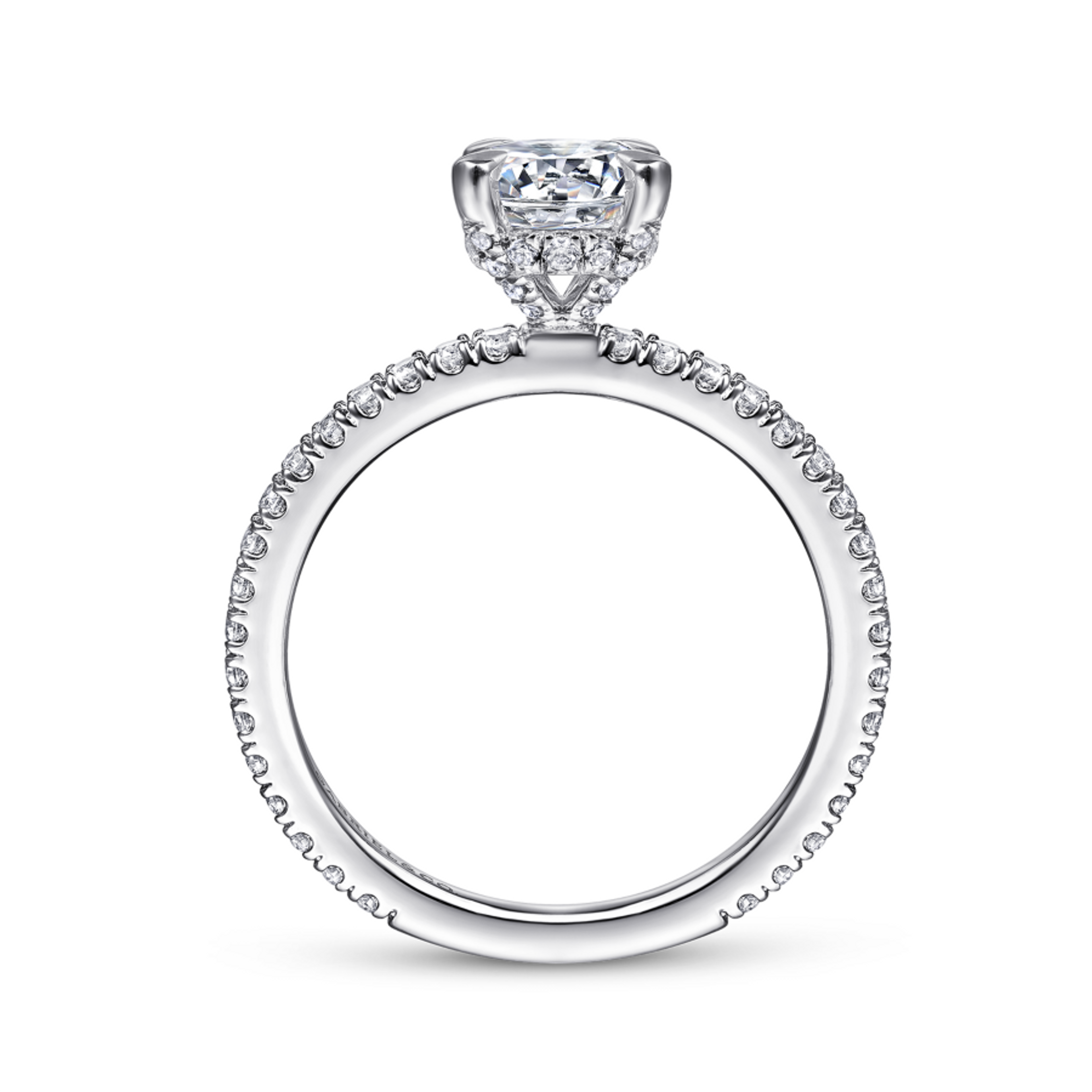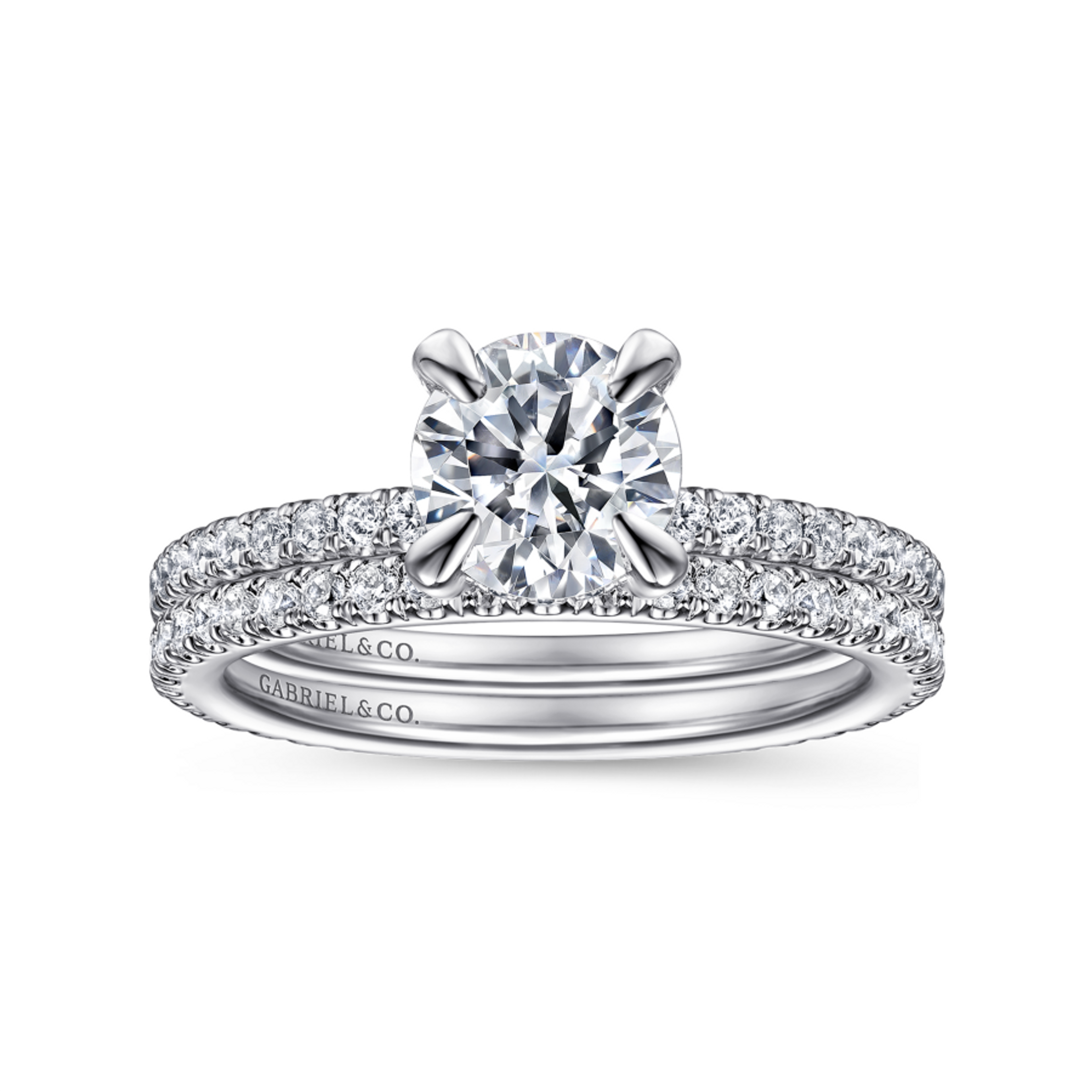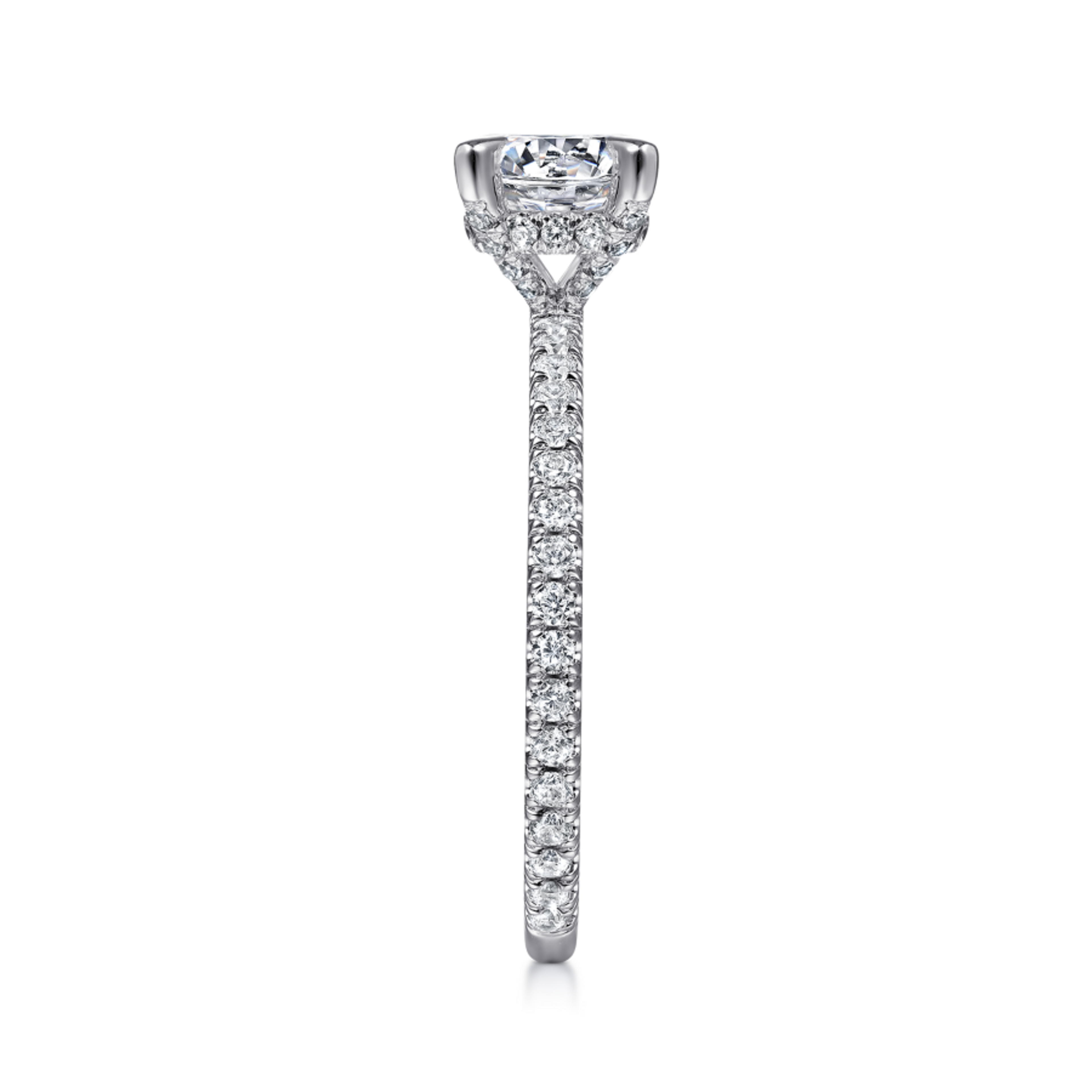 Allow your chosen center stone to truly shine with this understated diamond setting. Pavé set accent diamonds outline almost the entire shank which has a classic slim and straight silhouette. Surprise diamonds on the basket put the finishing touch on this skillfully crafted engagement ring setting.