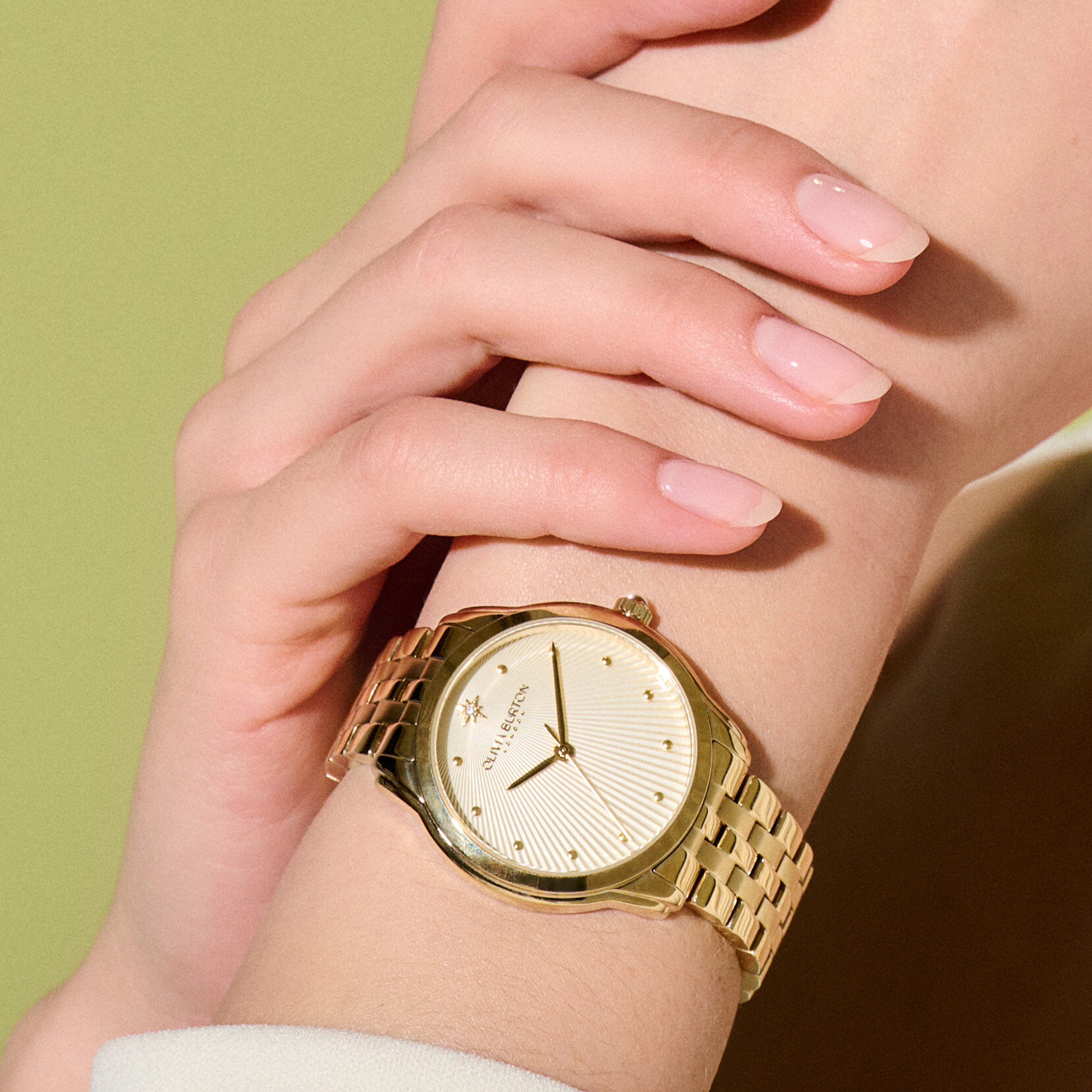 Olivia BurtonInspired by star-filled skies, this Celestial Starlight watch features a radiant gold dial with a crystal-embellished North Star marker and luxe bracelet strap. Crafted from gold-plated stainless steel and finished with intricate engravings that imitate beams of light, this piece serves as a reminder that the darkest nights make way for the brightest stars.